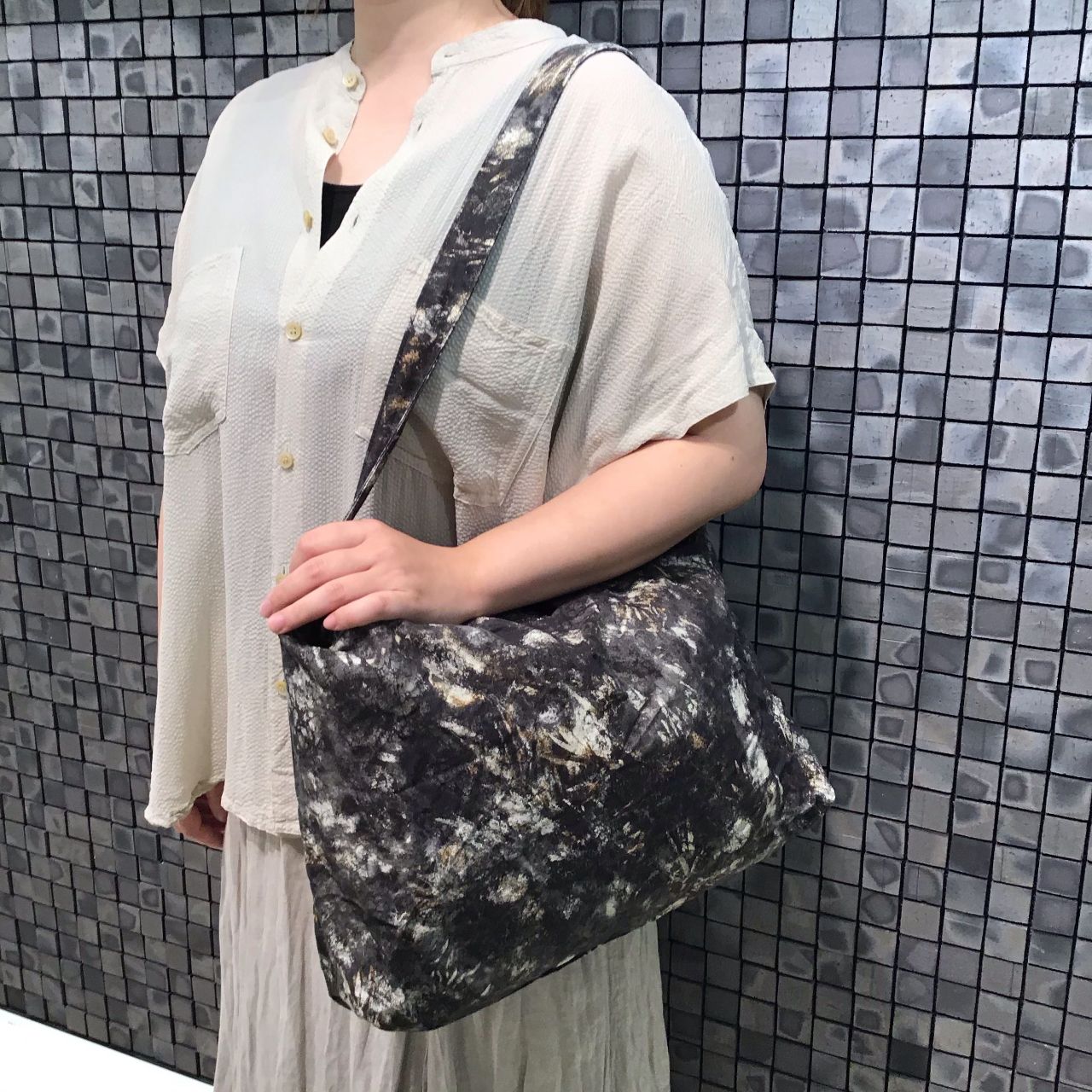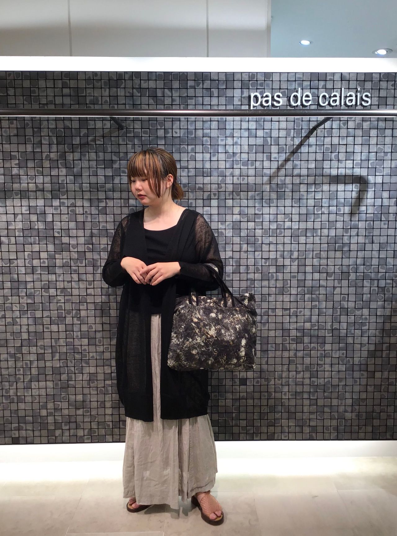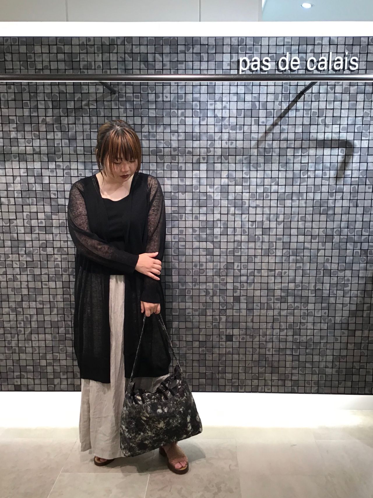 今回はぼかしプリントバッグを主役にコーディネートしました。