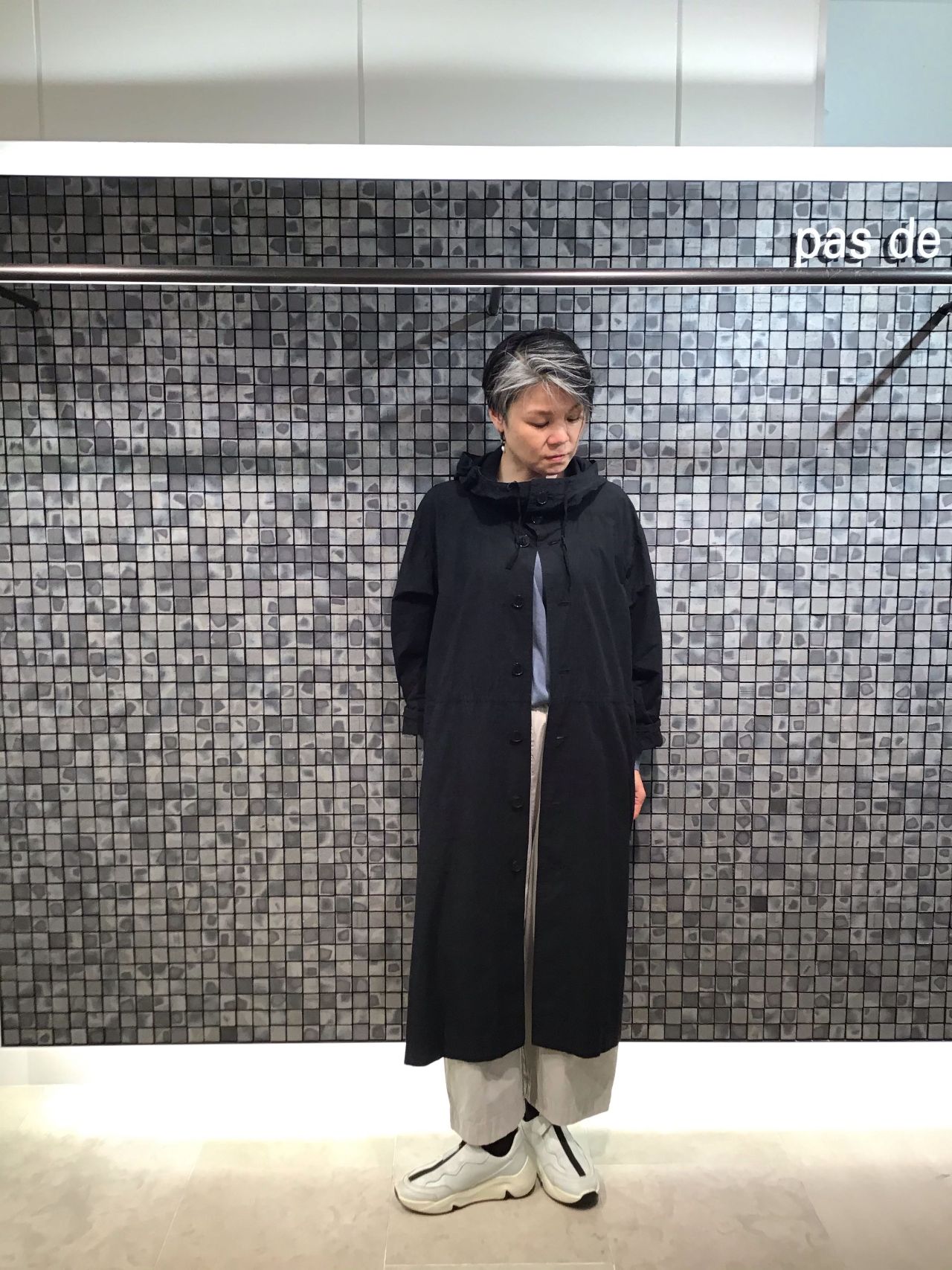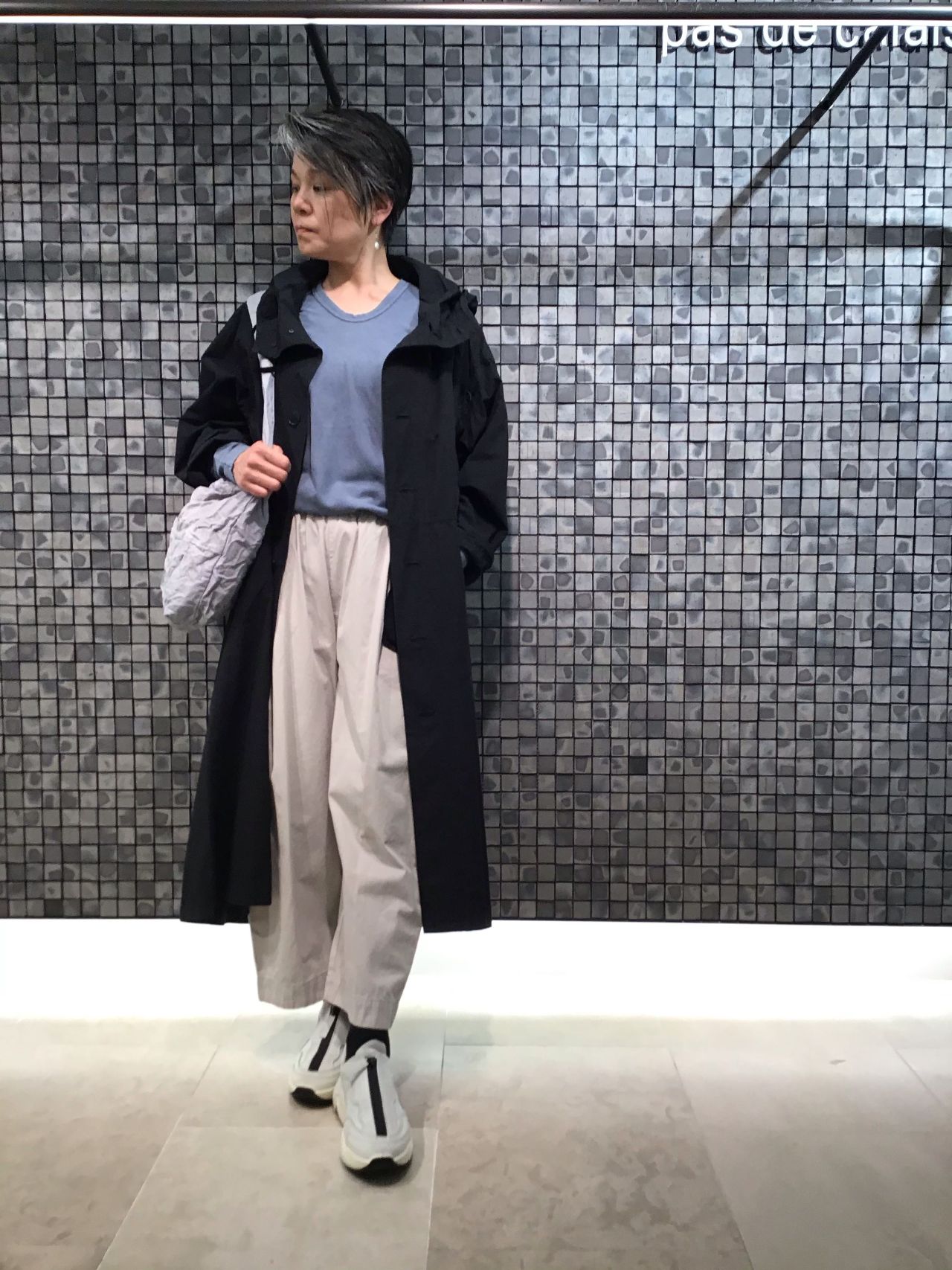グレーとホワイトを差し色にした、黒のロングコートを軽やかに魅せるコーディネートです。
