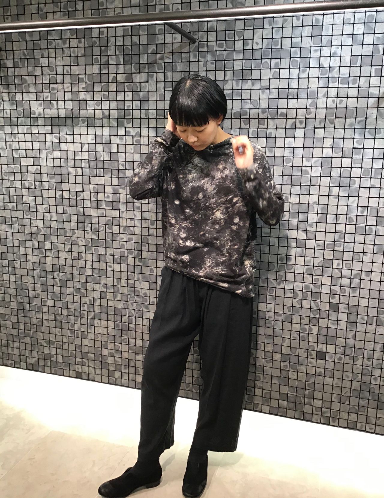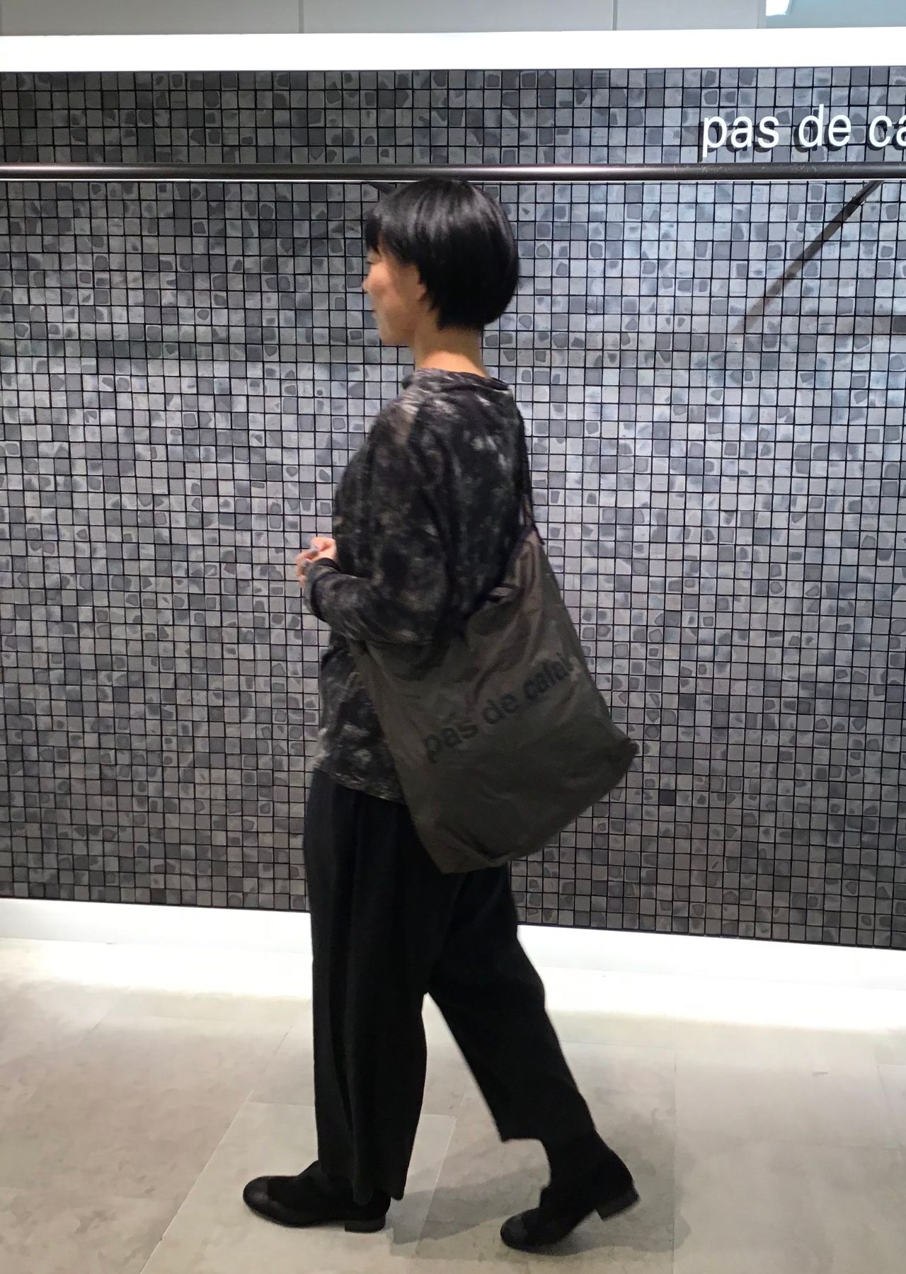 ボトムにはカットソーとは対照的なゆるっとワイドパンツを合わせ、強すぎないブラックコーディネートにしてみました。
