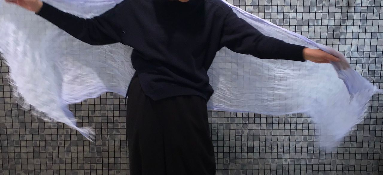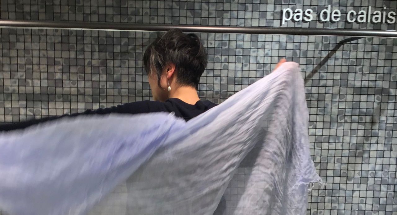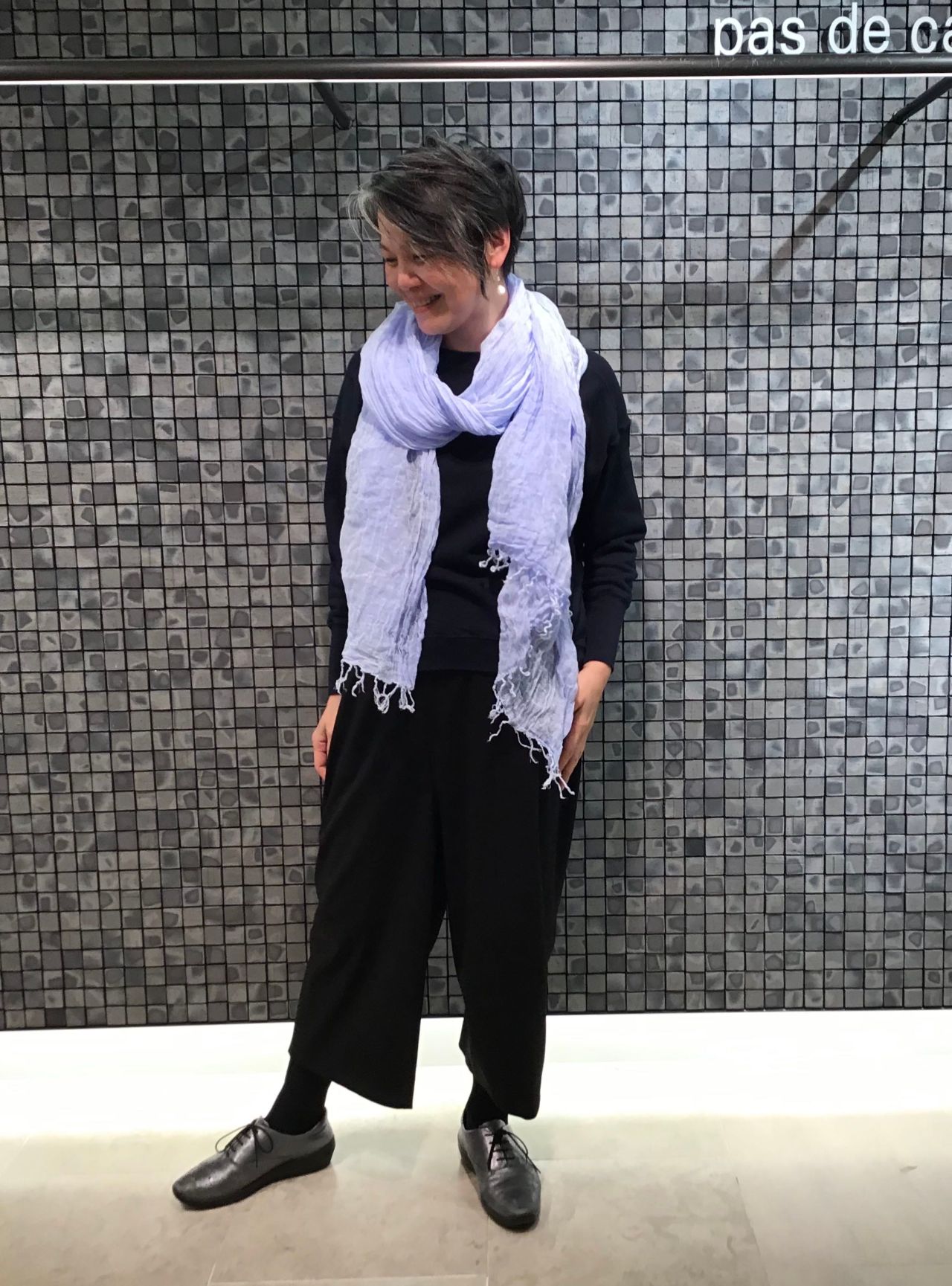 ネイビートップスとブラックボトムスの鉄板コーディネートに春気分のリネンガーゼストールをプラス。