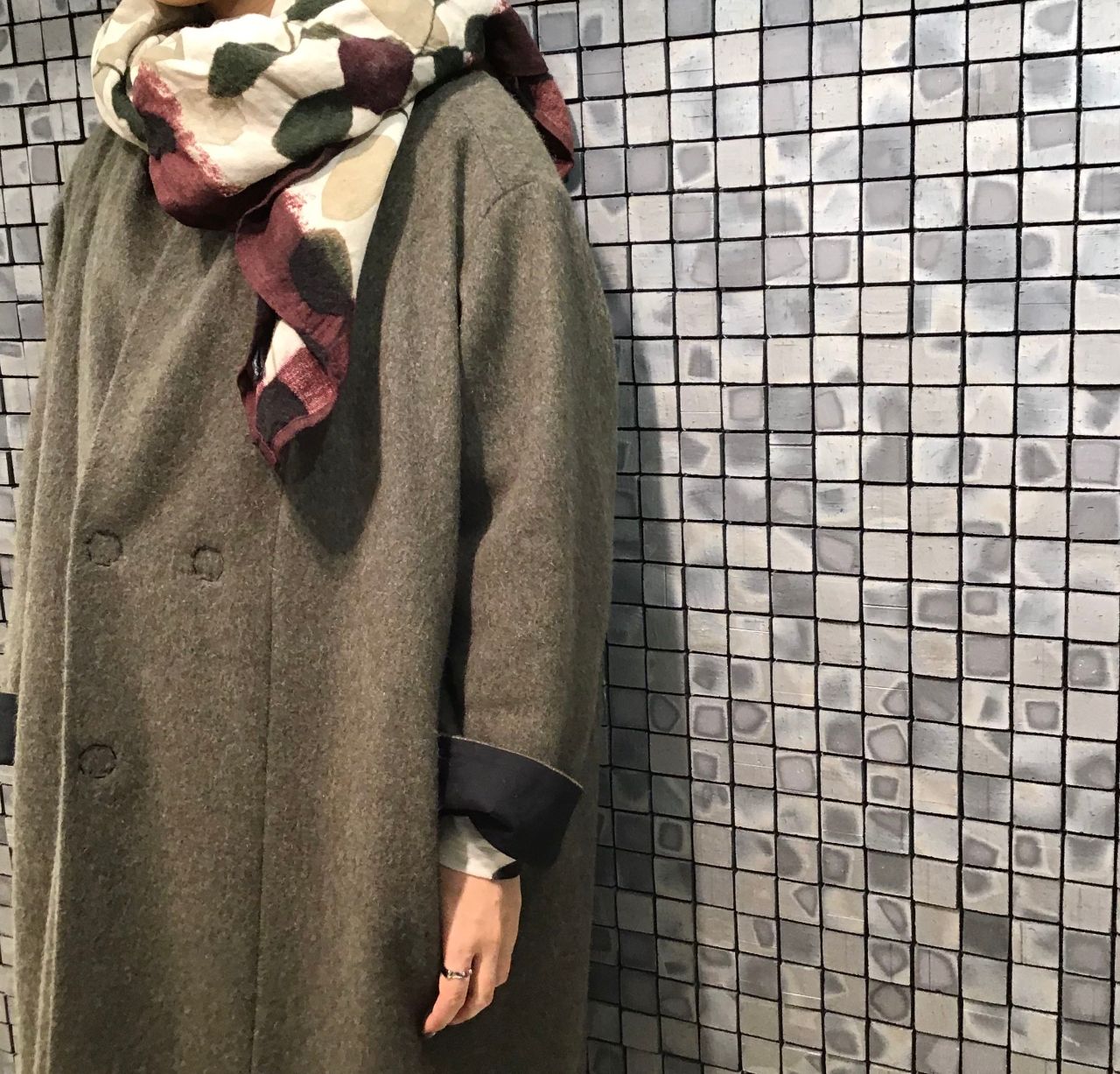 ストールで気持ちばかりの深みあるレッドとグリーンをアクセントに。