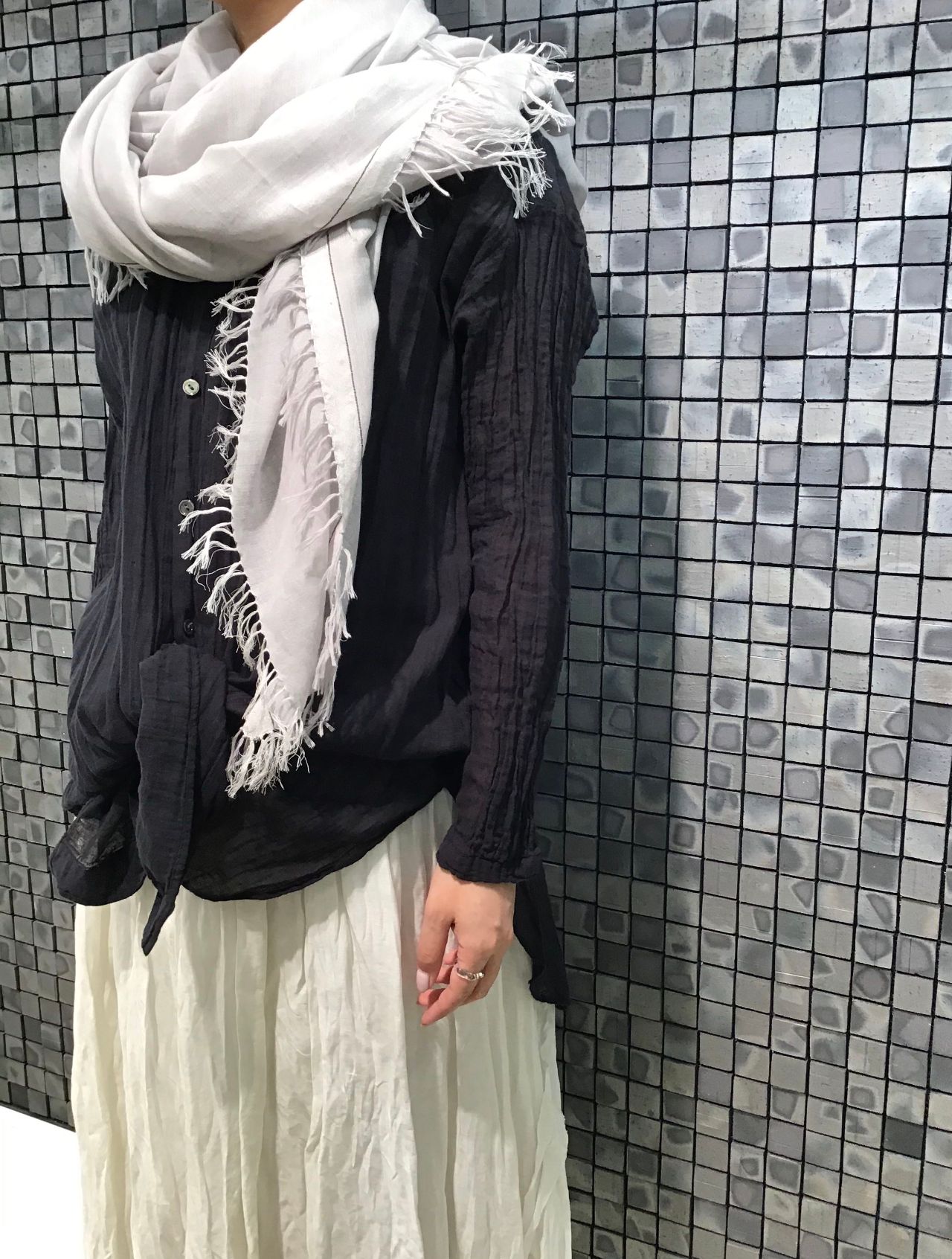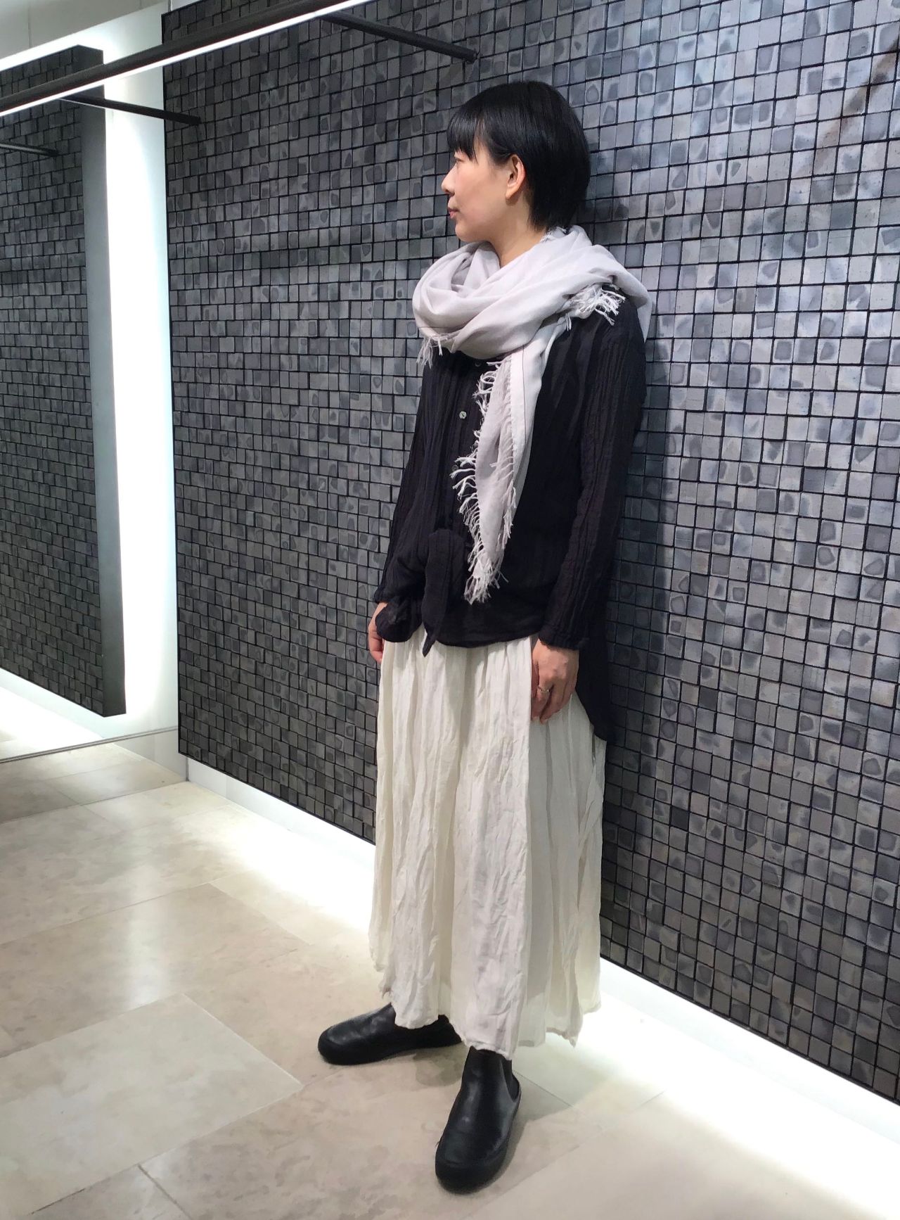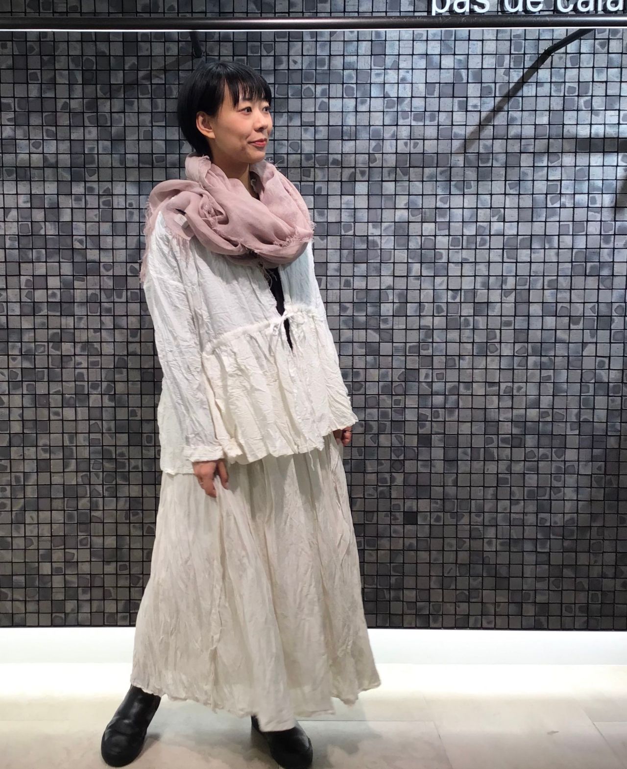 いつもは白系統の服を着ない私も、素材や色に魅了され、スカートを用いたワントーンスタイルに。