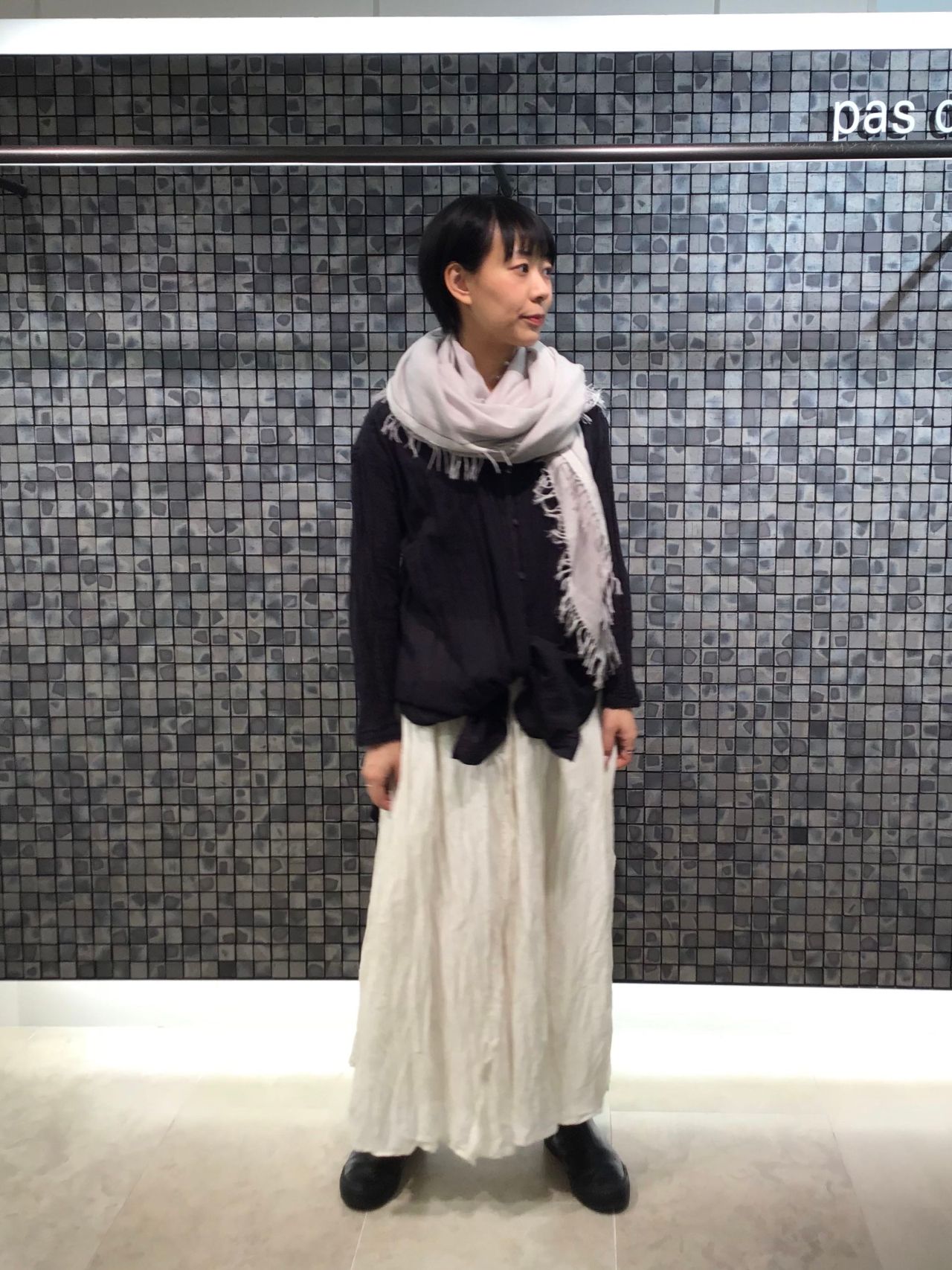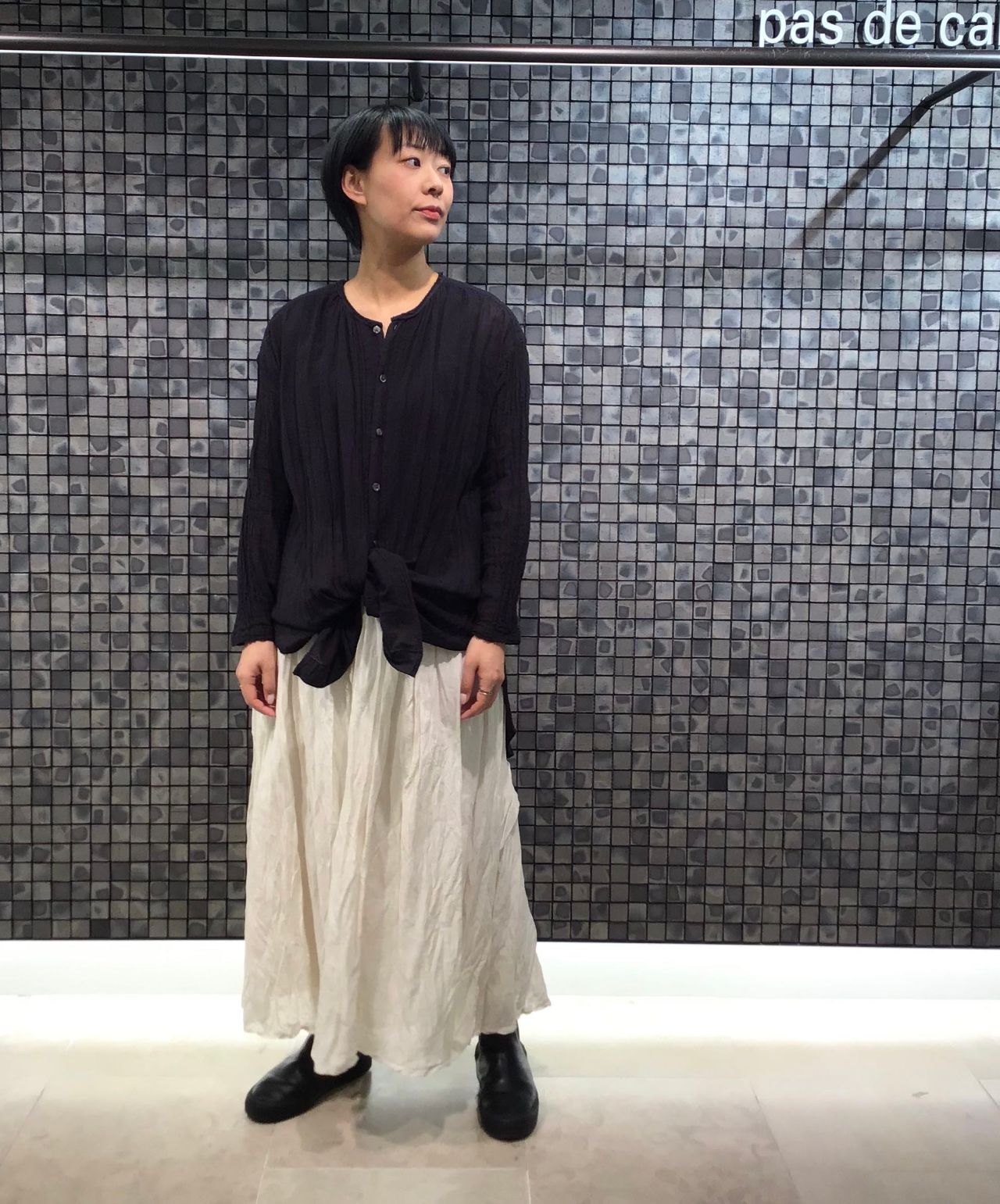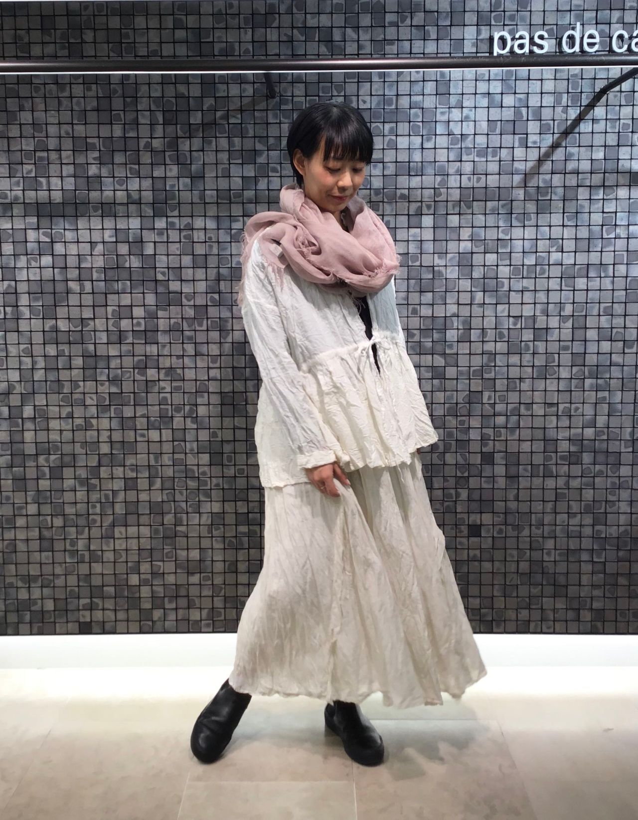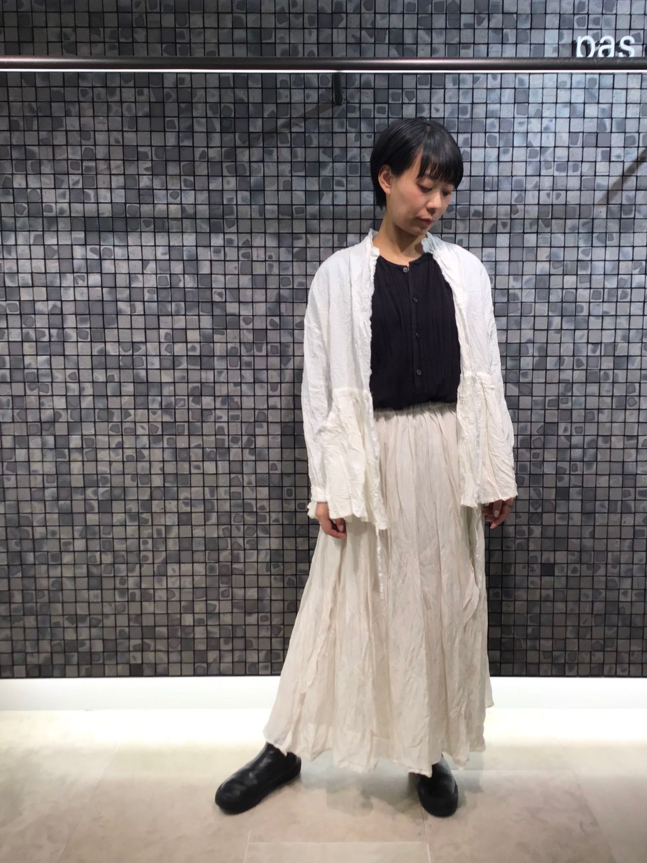 いつもは白系統の服を着ない私も、素材や色に魅了され、スカートを用いたワントーンスタイルに。