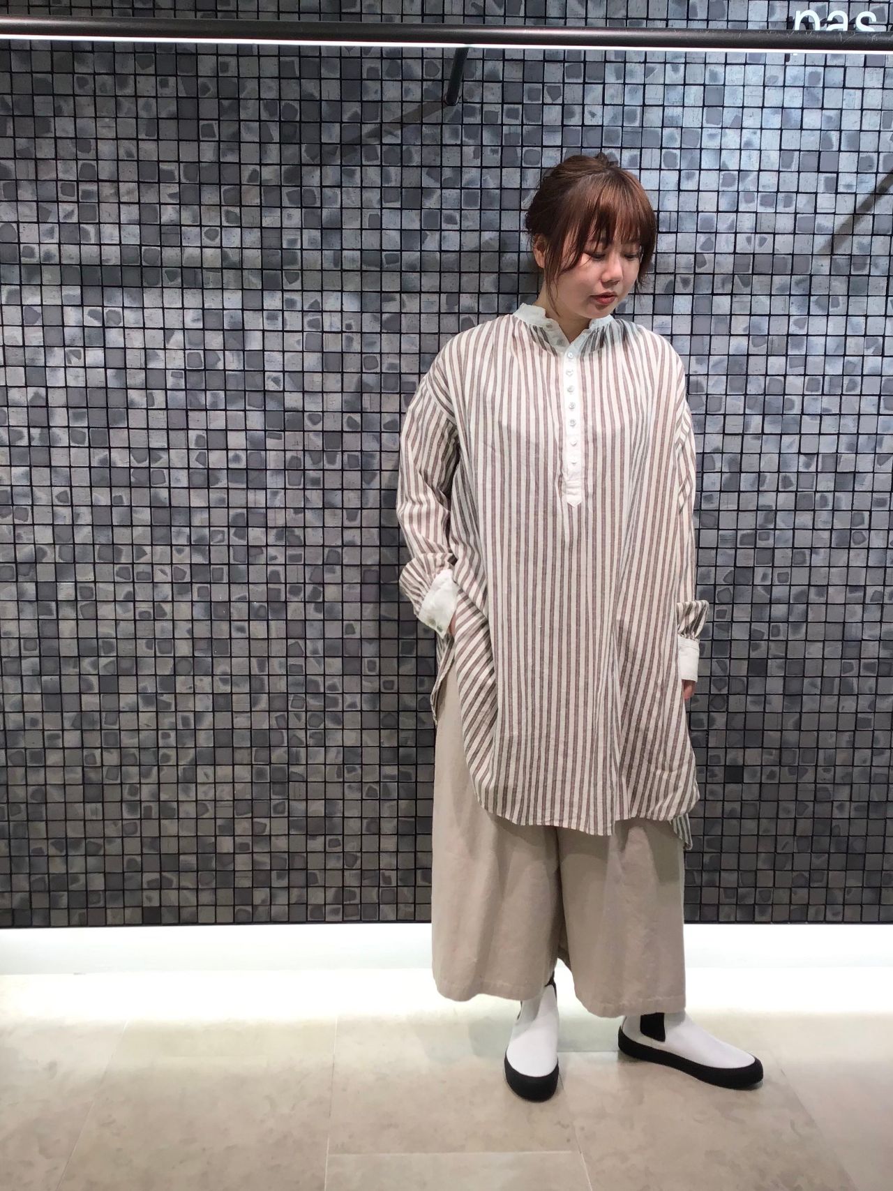 クラシックさを感じる綿麻ストライプのブラウスを主役にスタイリング。