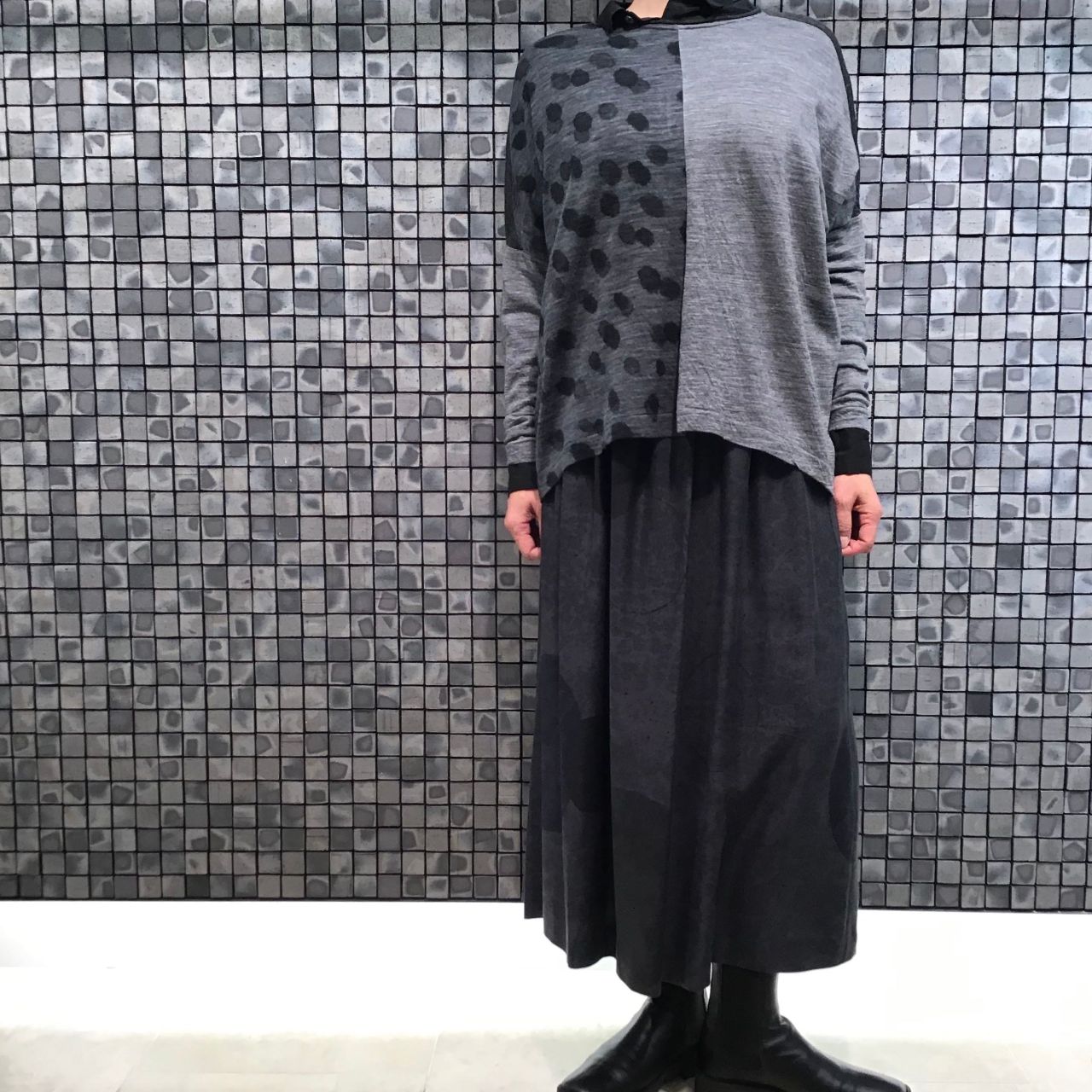 ウール100%のカットソーにシルクコットンのブラウスをイン。