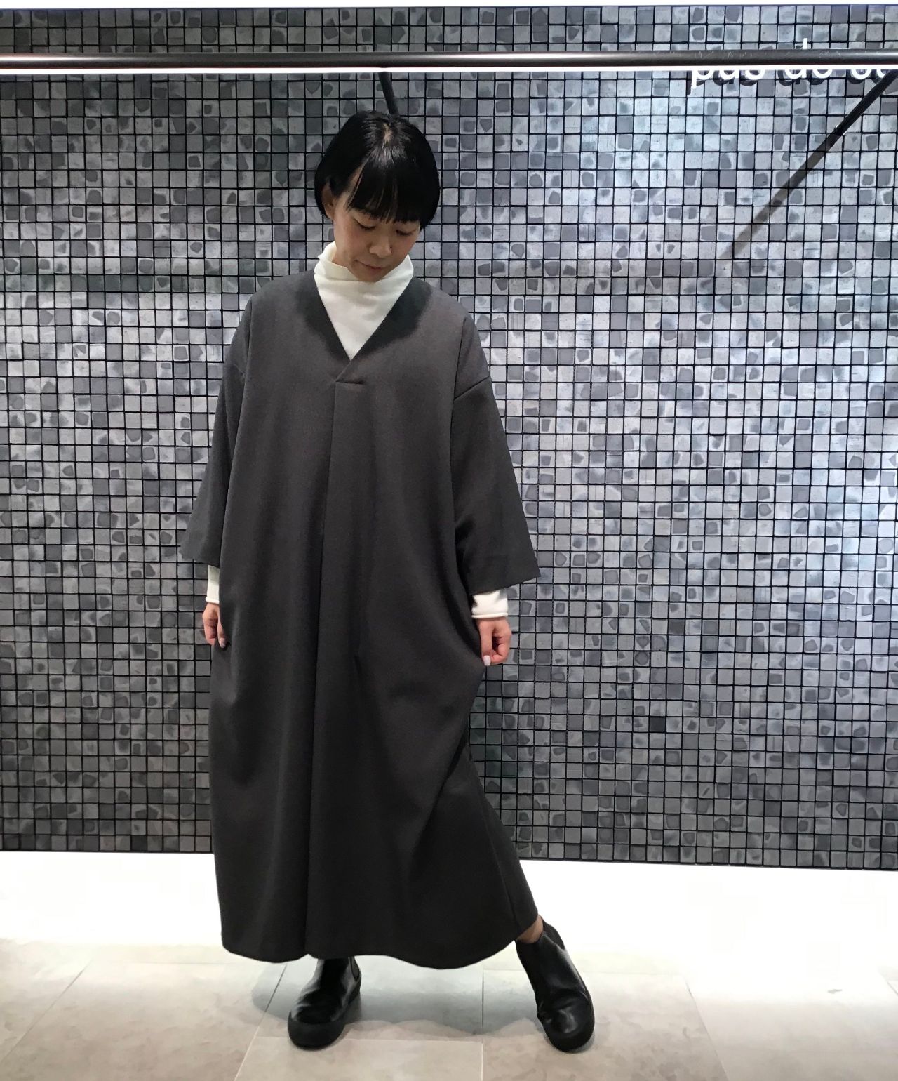 前も後ろも襟がVになっており、中に着るものと合わせを楽しめます。