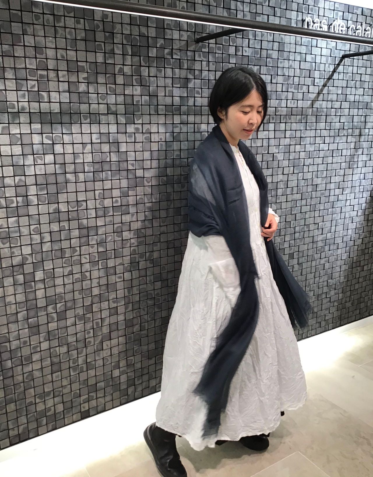 カラーもアイボリーよりではなく、潔い白なのでニットやストールと合わせてもクリーンな印象で着て頂けますよ。