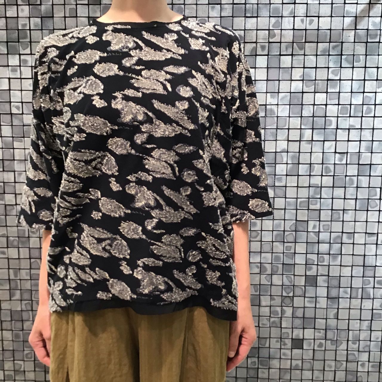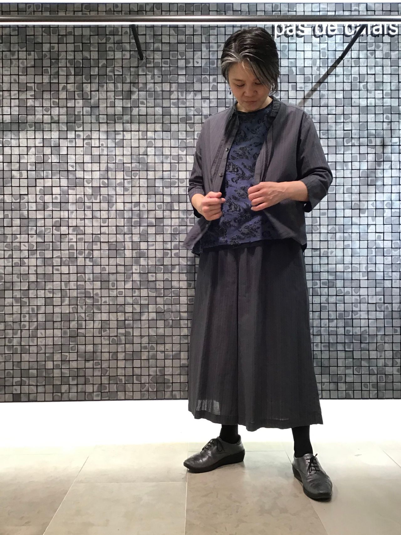 羽織りブラウスの下から見える柄カットソーは大人らしく、上品な着こなしです。
