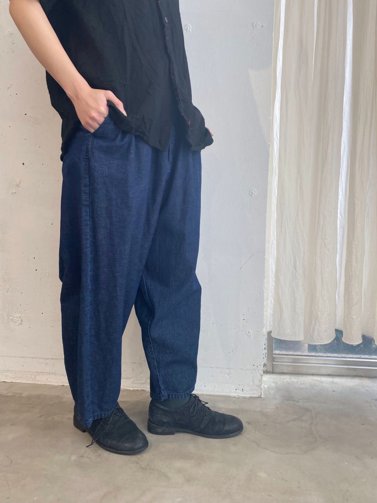 リラックス感のあるワイドテーパードのシルエットはコンパクトなトップスにぴったりです。