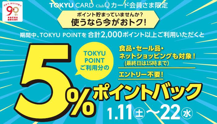 上記期間中、対象店舗にて東急カードポイントを合計2,000ポイント以上ご利用いただくと、ご利用ポイントの5%を後日ポイントバックいたします