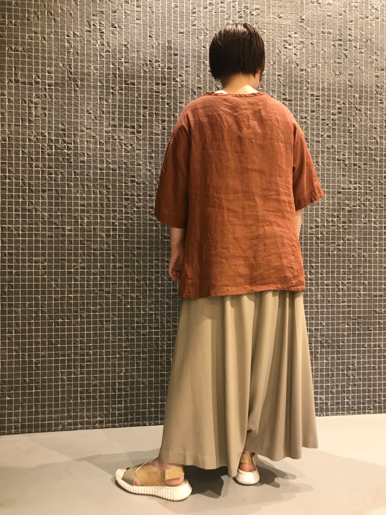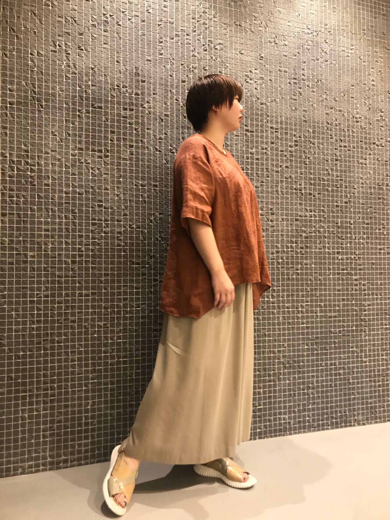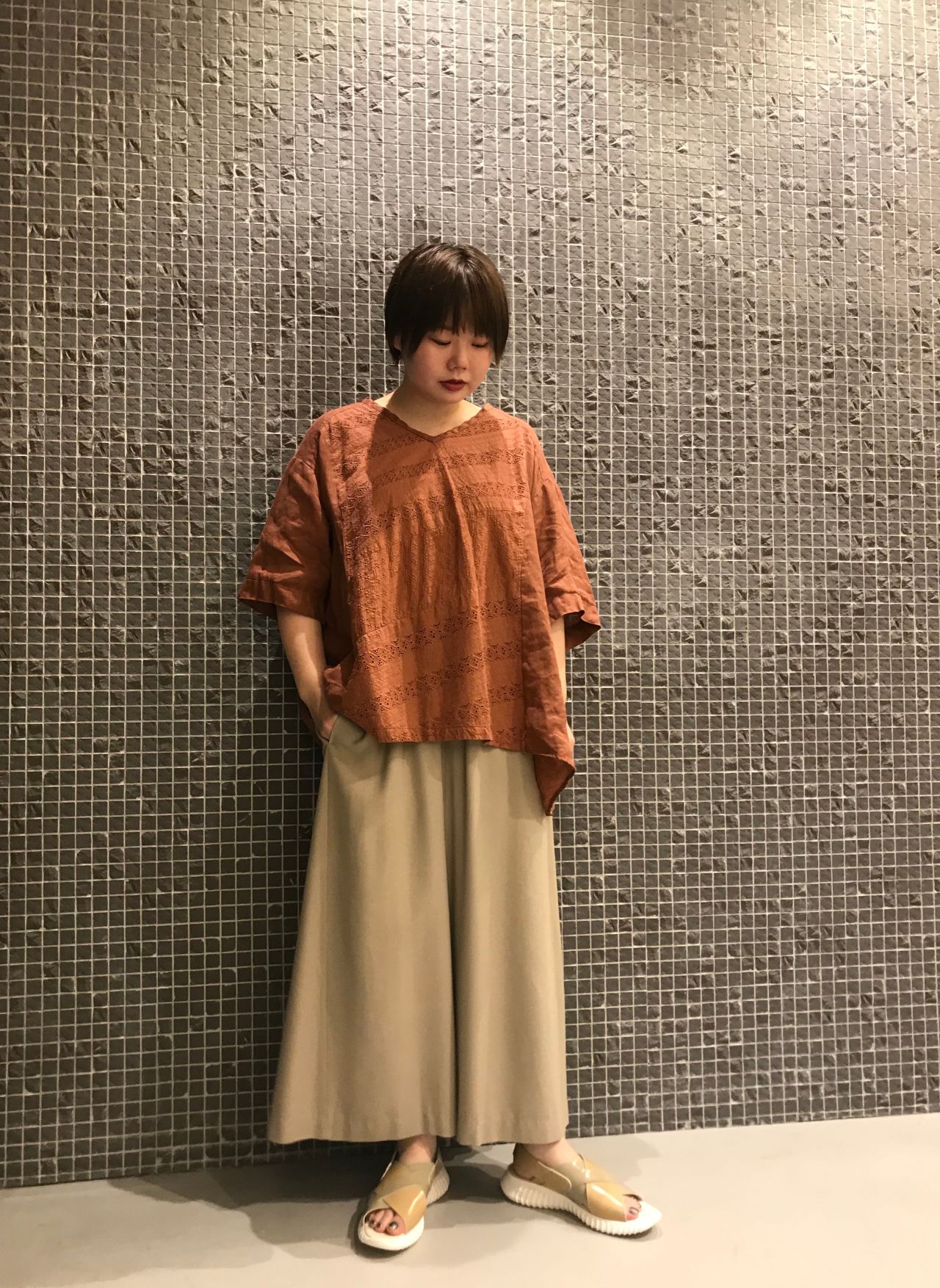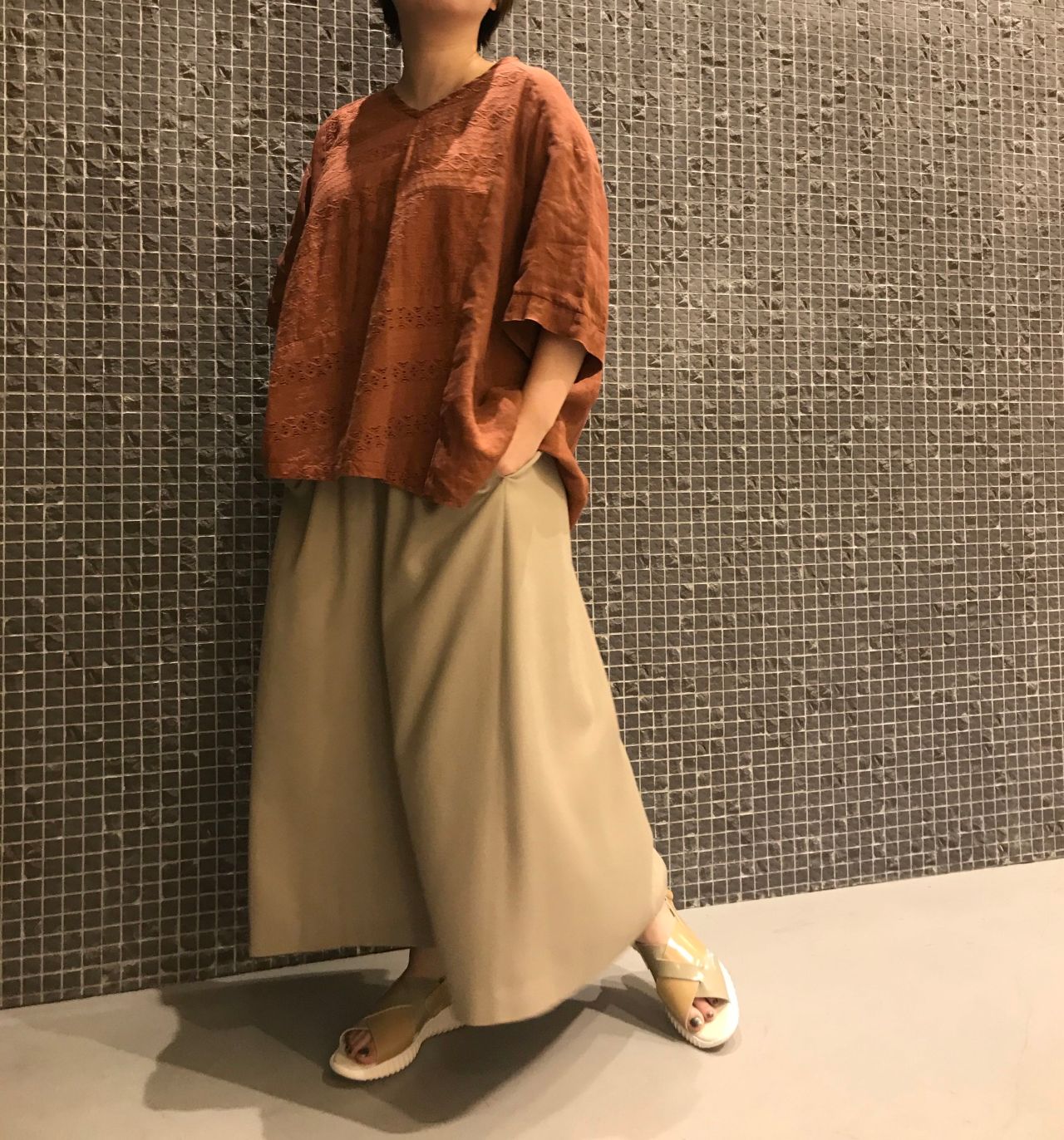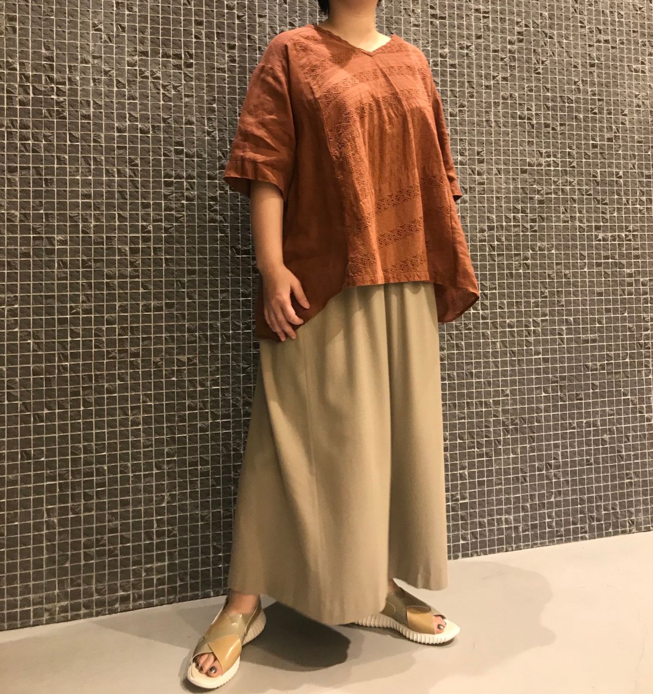 ブラウスはAラインのシルエットで、ゆとりのあるデザイン、光沢感のある生地なので上品な雰囲気もありますよ。