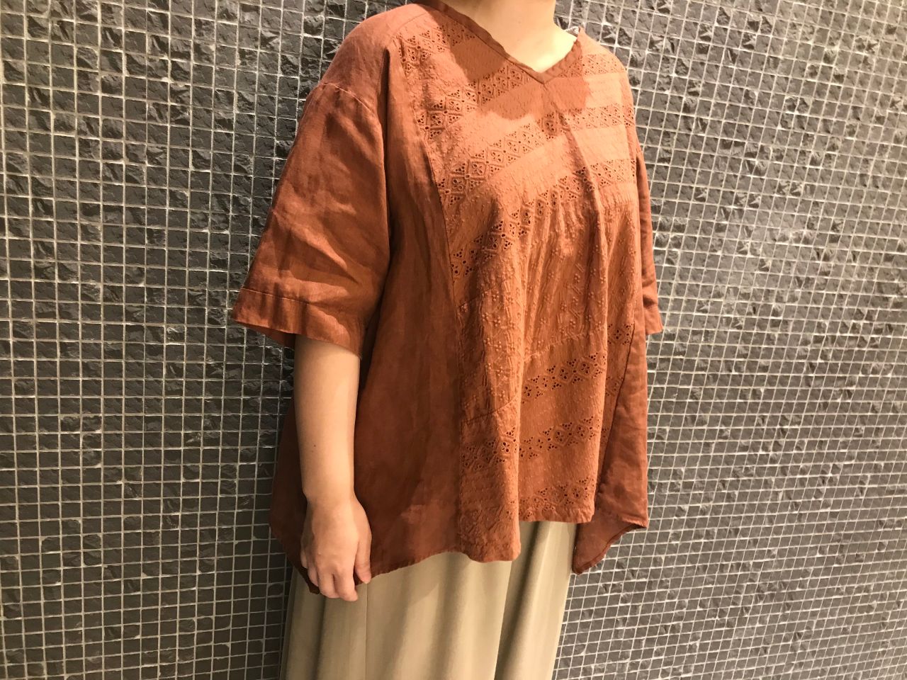 前見頃のレースがポイントで、フレンチリネンのレースと綿の刺繍レースをあわせています。