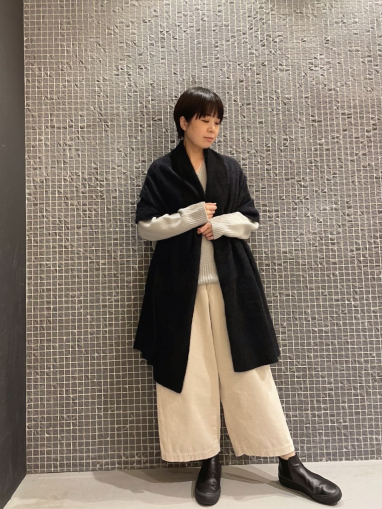 アウターに極上の滑らかさのラクーン100%のストールを合わせれば、真冬も暖かく過ごせるスタイリングです。
