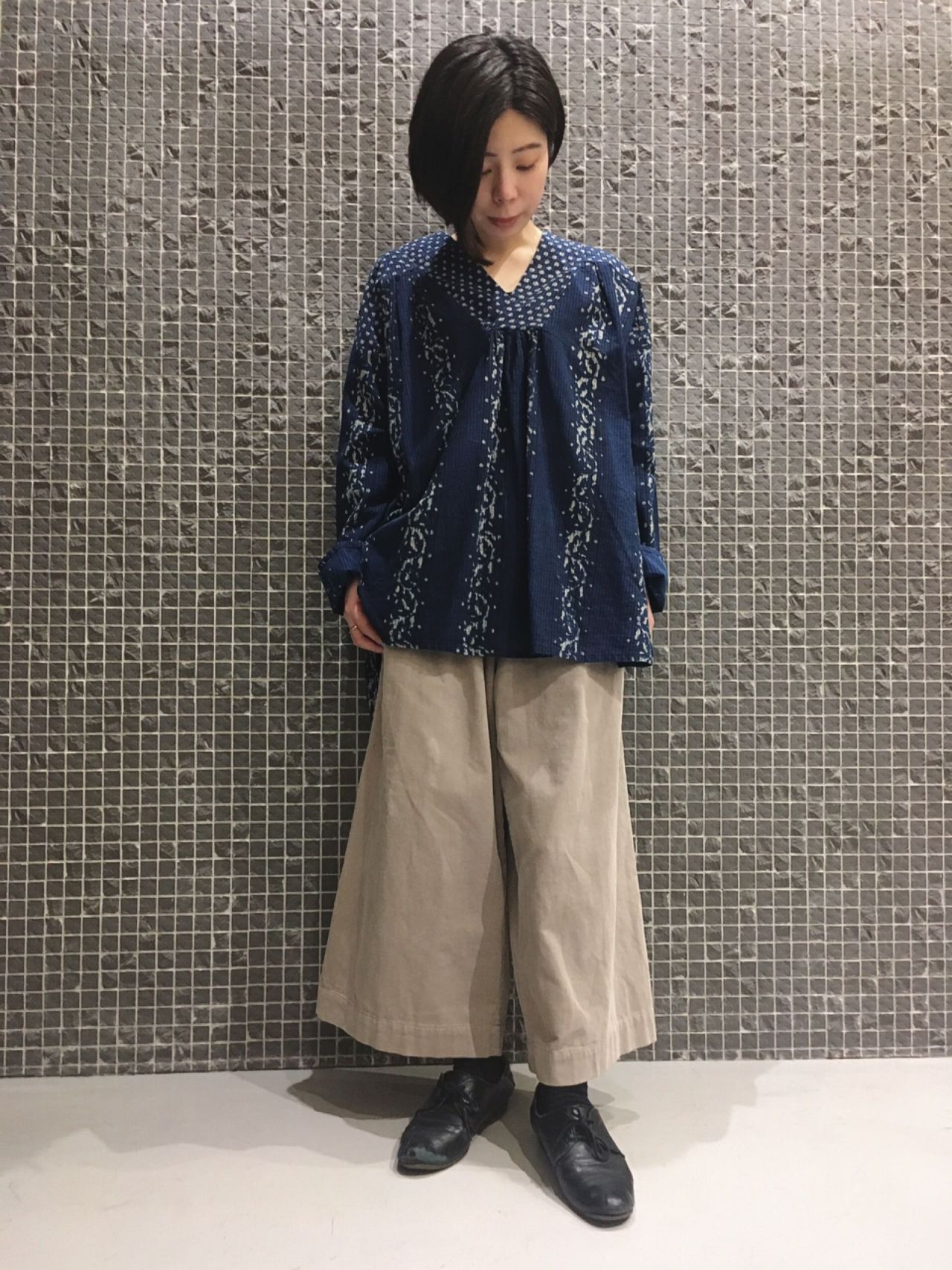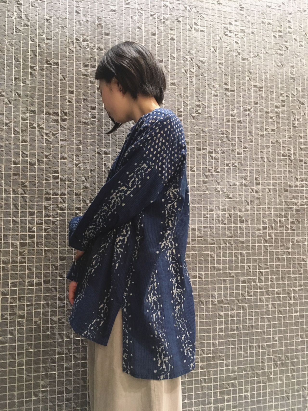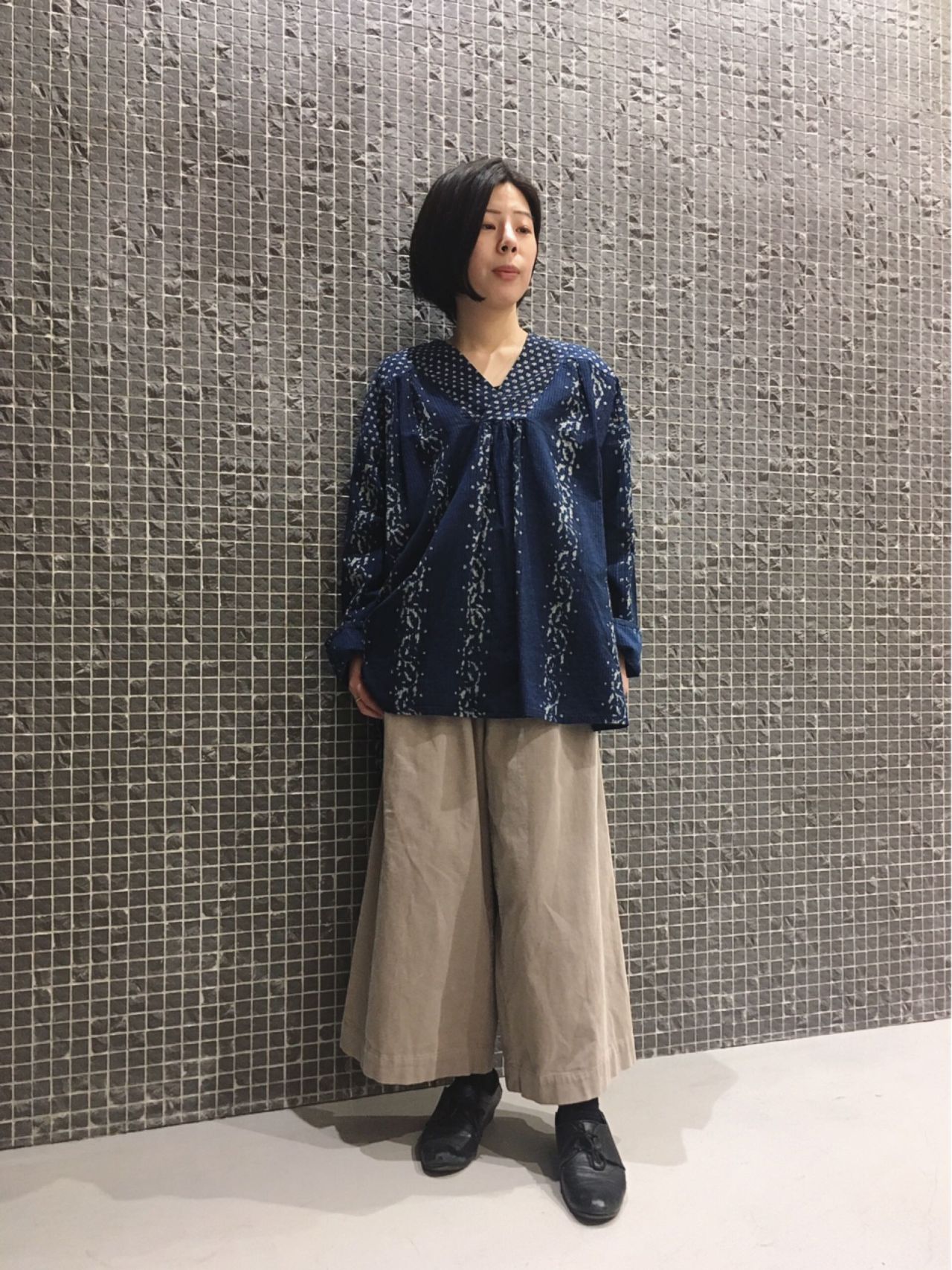 春らしさを感じさせてくれる風合いのブロックプリントのブラウスです。