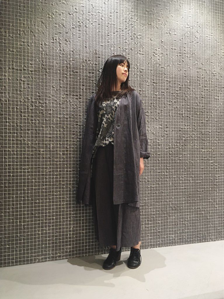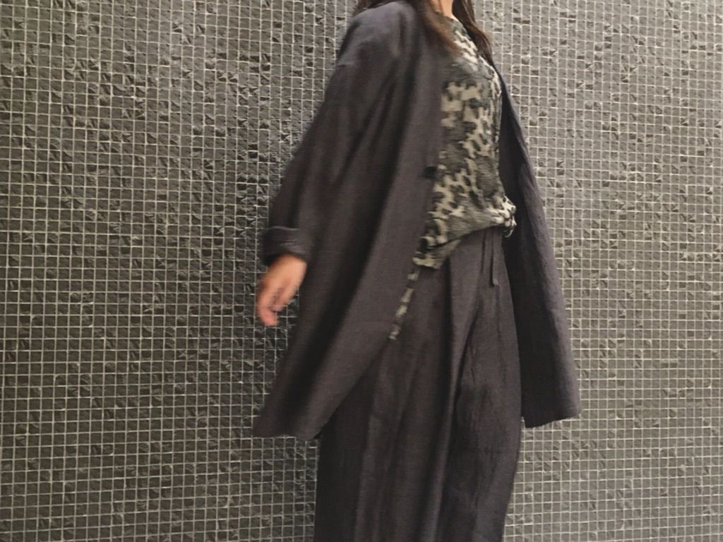 同素材のフランダースリネンコートとパンツはセットアップにしても、