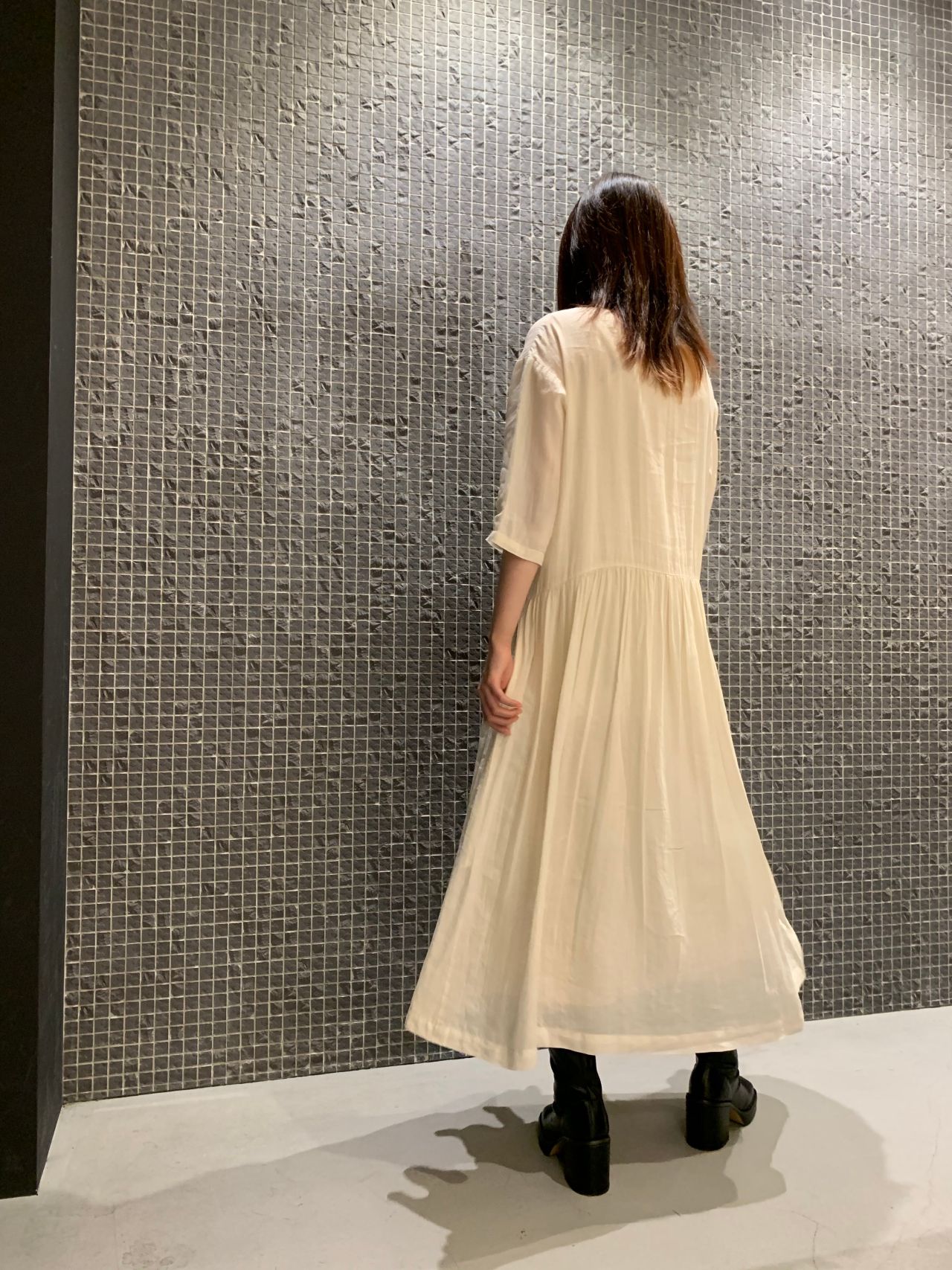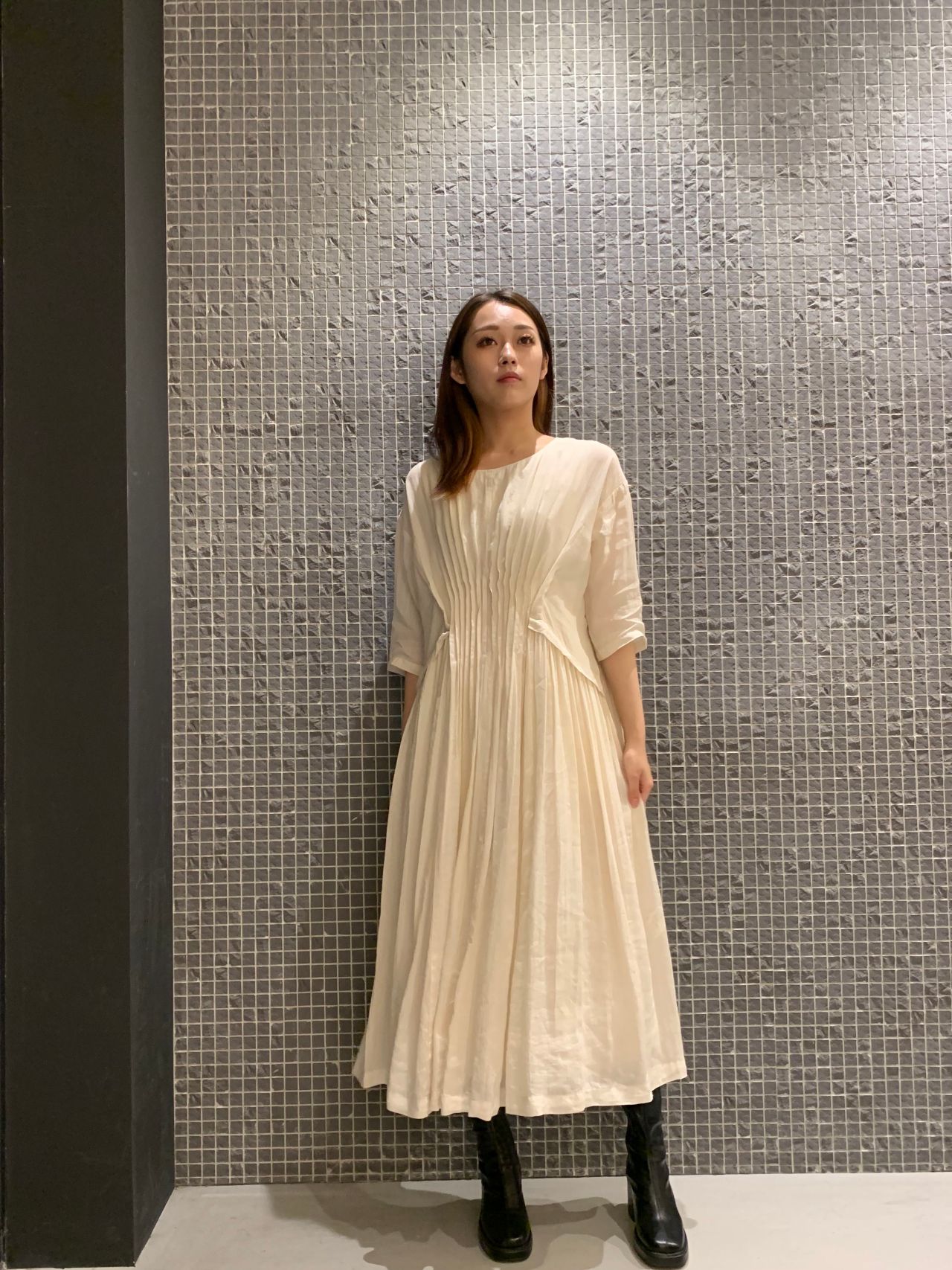 秋冬のブーツを合わせるにはぴったりのワンピースです。前の真ん中にはタックが入っていますので、ウエストが絞られて見える効果がありますよ。秋のジャケットやコートなどにも合わせて早く着たいですよね。