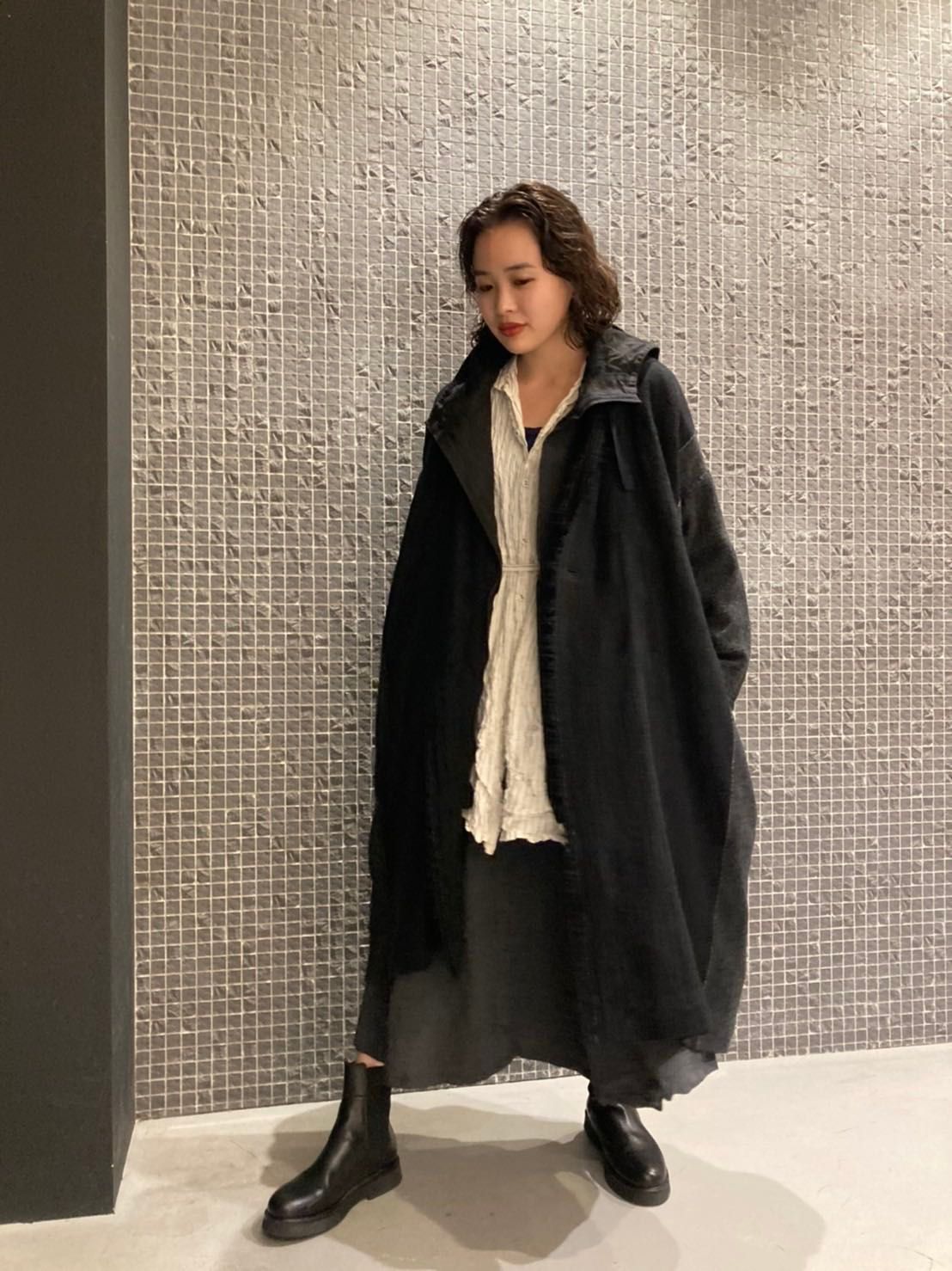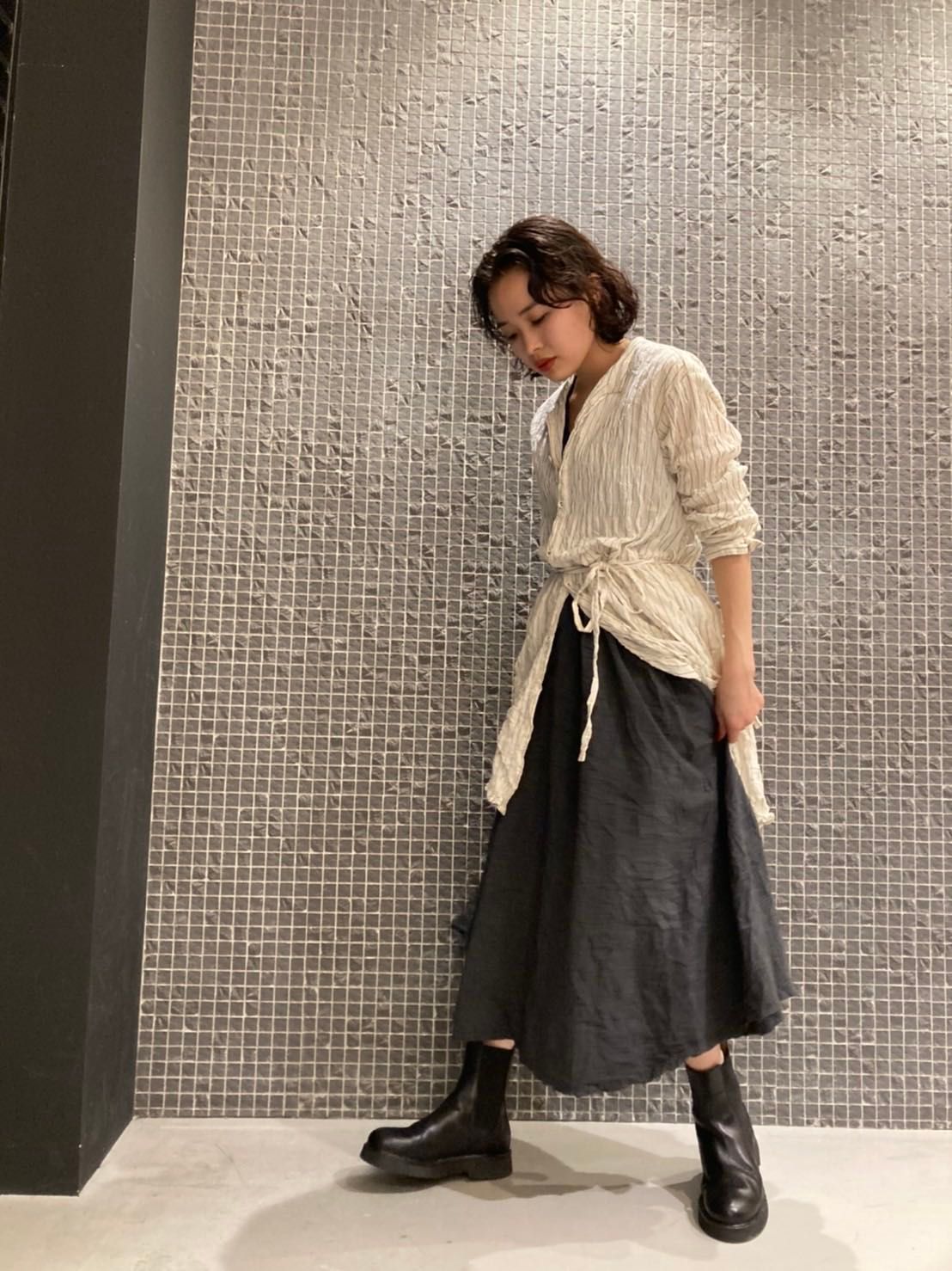 ウエスト部分と裾の部分にゴムがあり、コーディネートによって着る形を変えたり、重ね着も楽しめる一枚。