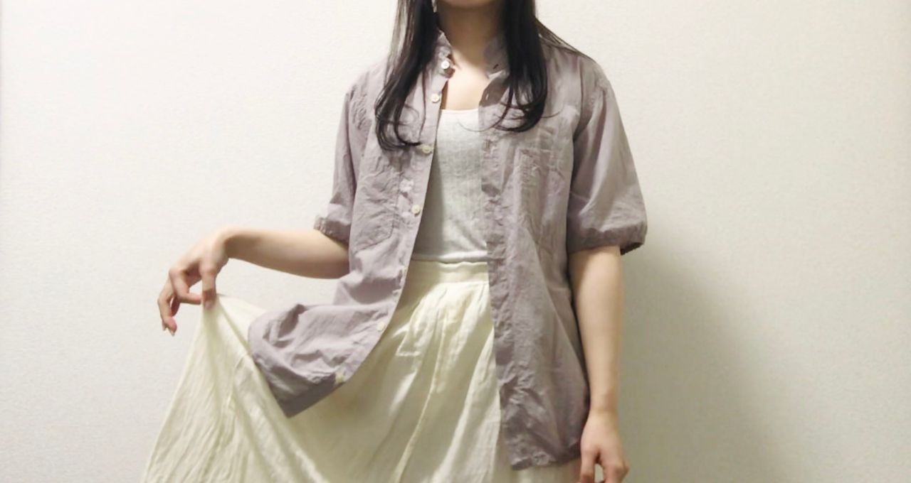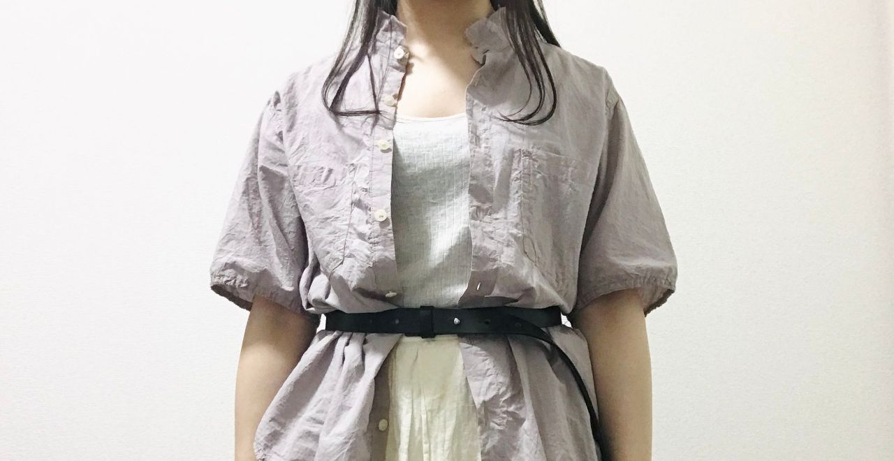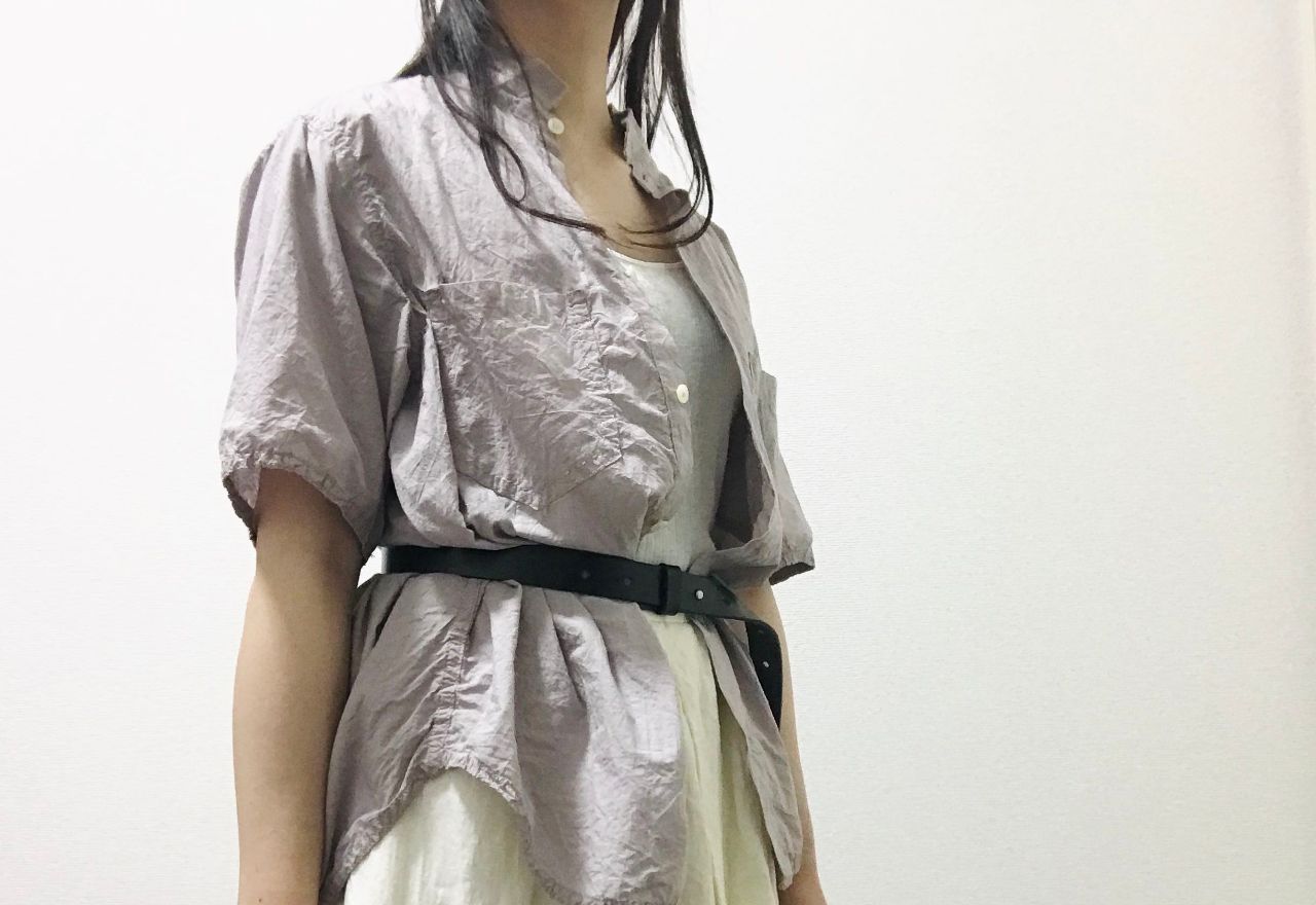 気分でボタンを開けて、タンクトップの上から羽織ってみました。胸元が少し見えると軽やかな印象になりますね。カーディガン代わりになるので、とても便利です。
