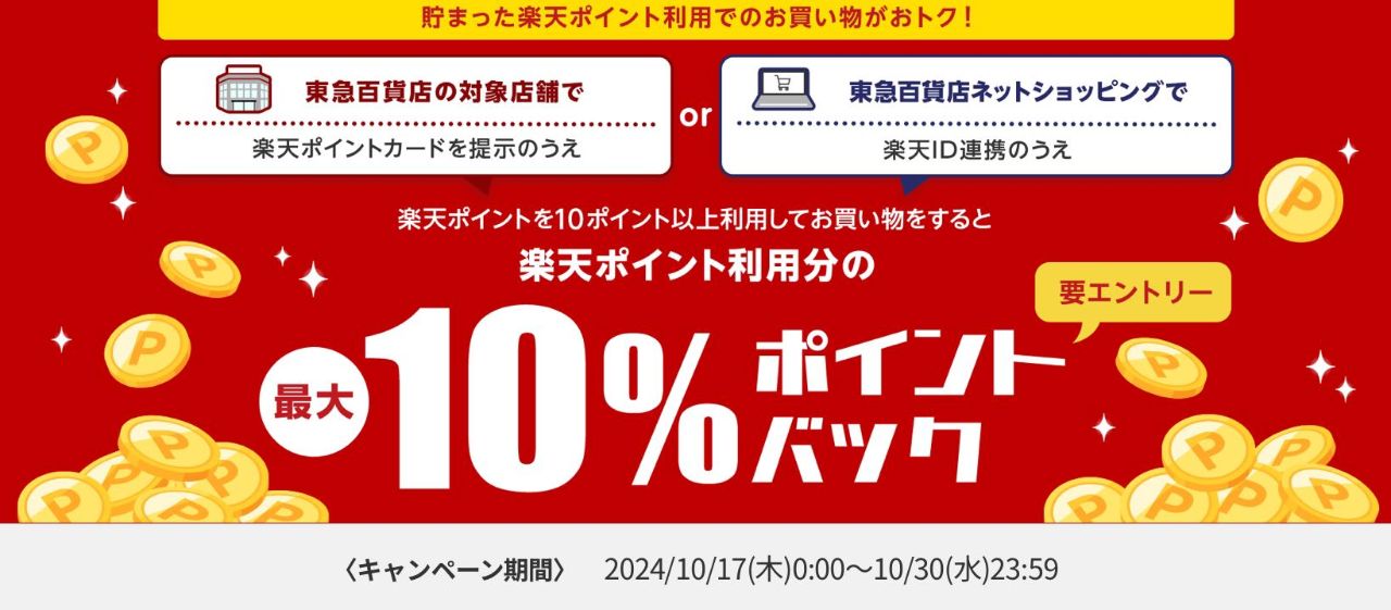 上記期間中、楽天ポイントを10ポイント以上利用してお買物いただくと、楽天ポイント利用分の最大10%をポイントバックいたします