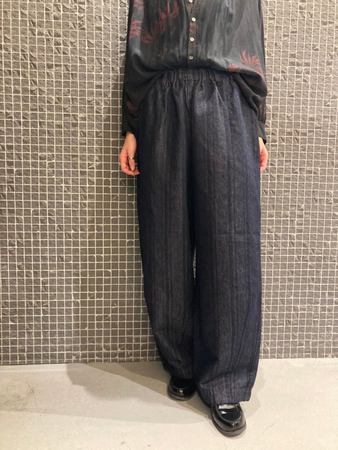 綿麻先染めストライプでスッキリとした印象のサーカスパンツ。
