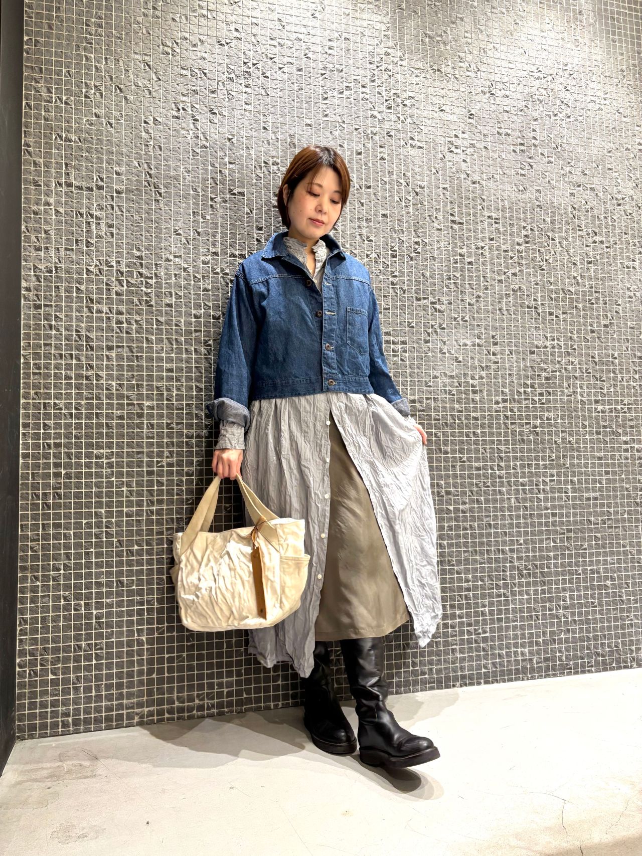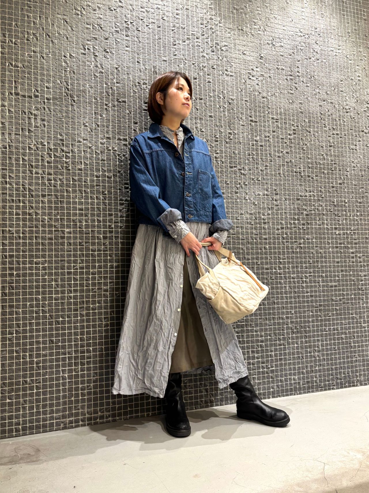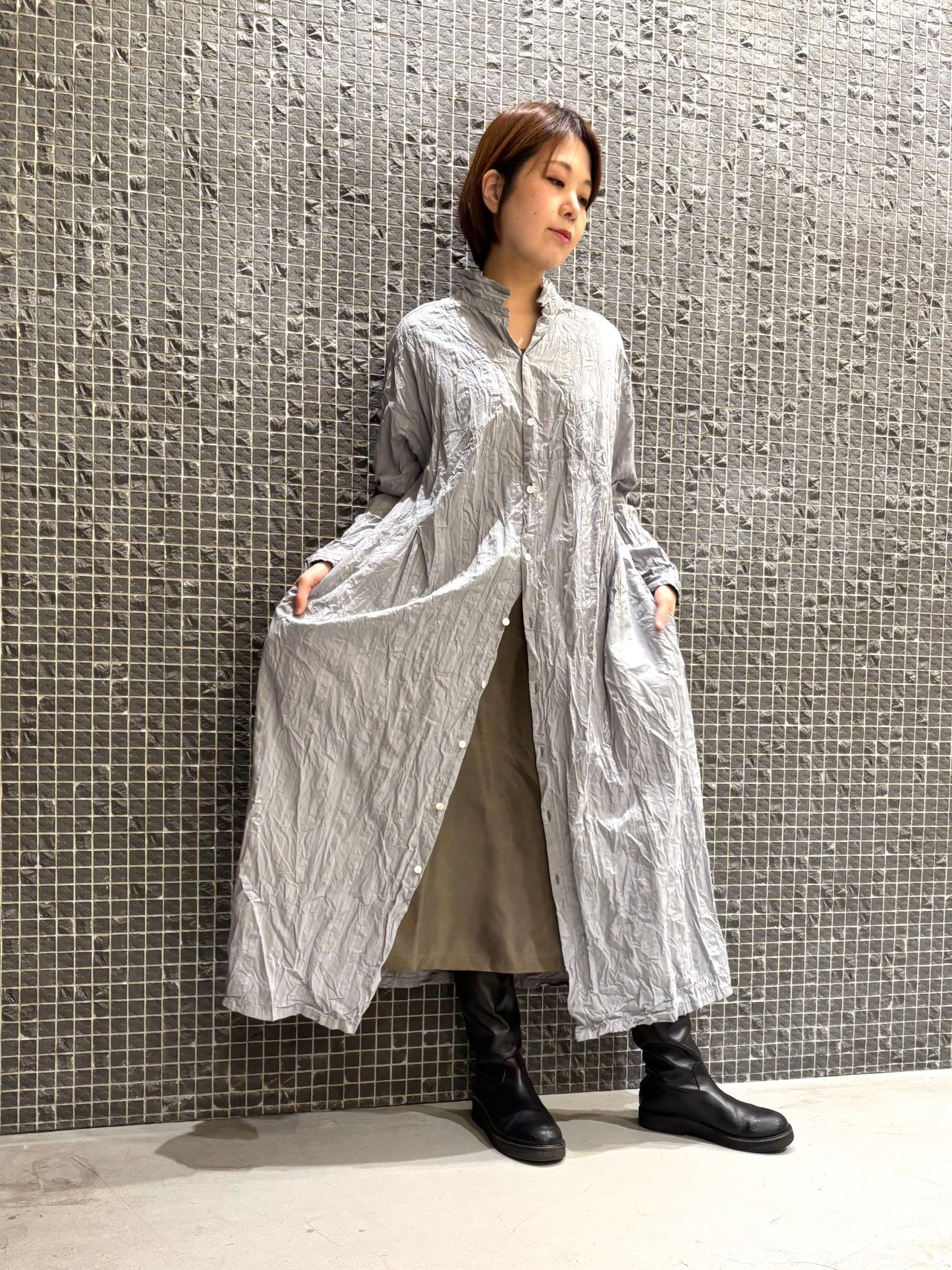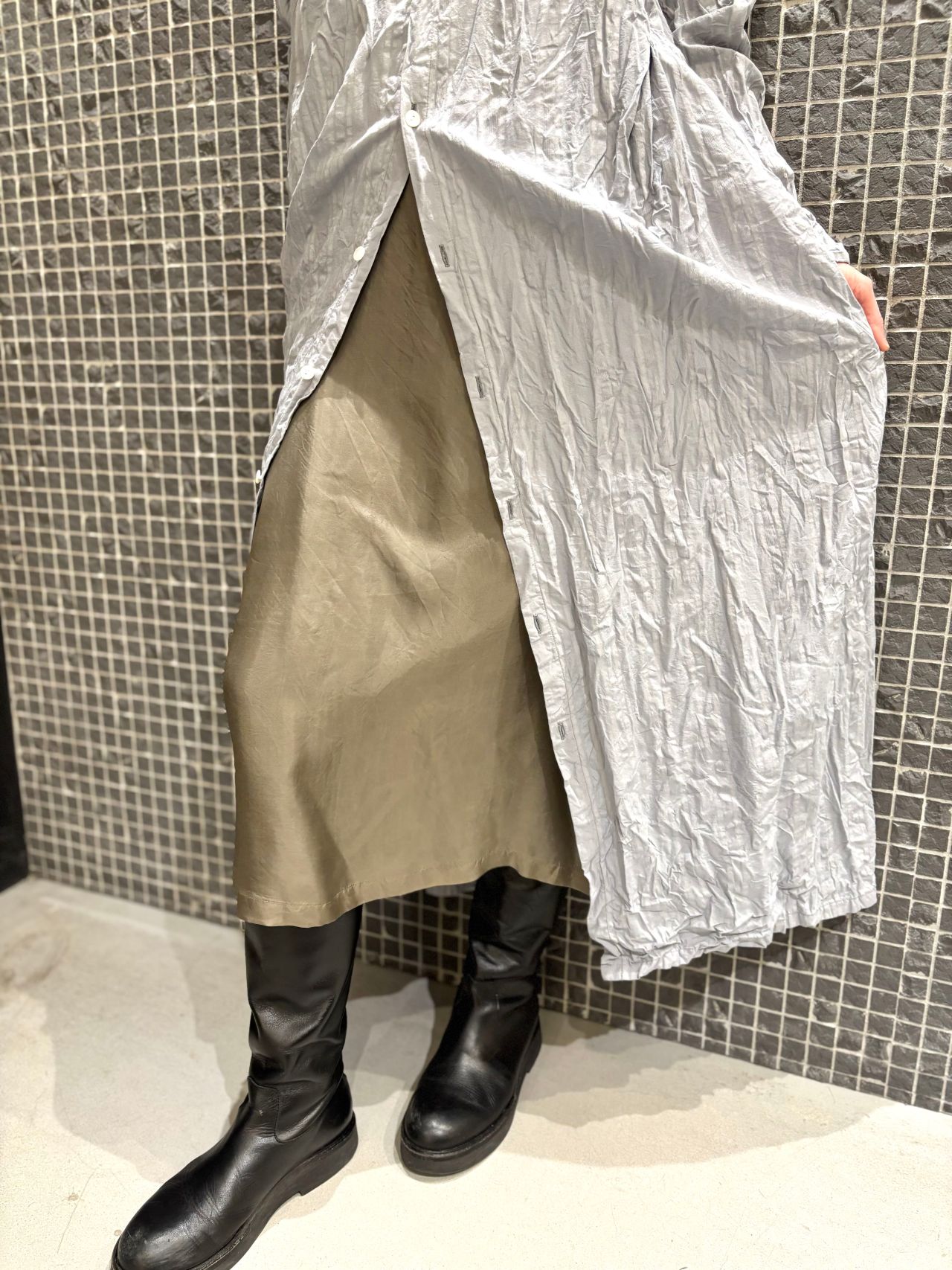 綿のナチュラルな質感に、キュプラの軽やかな光沢感をミックスしたスタイリング