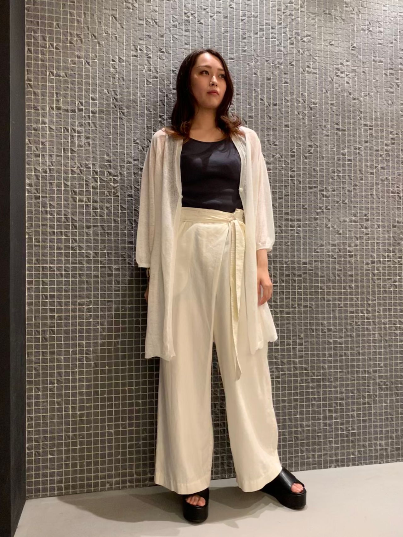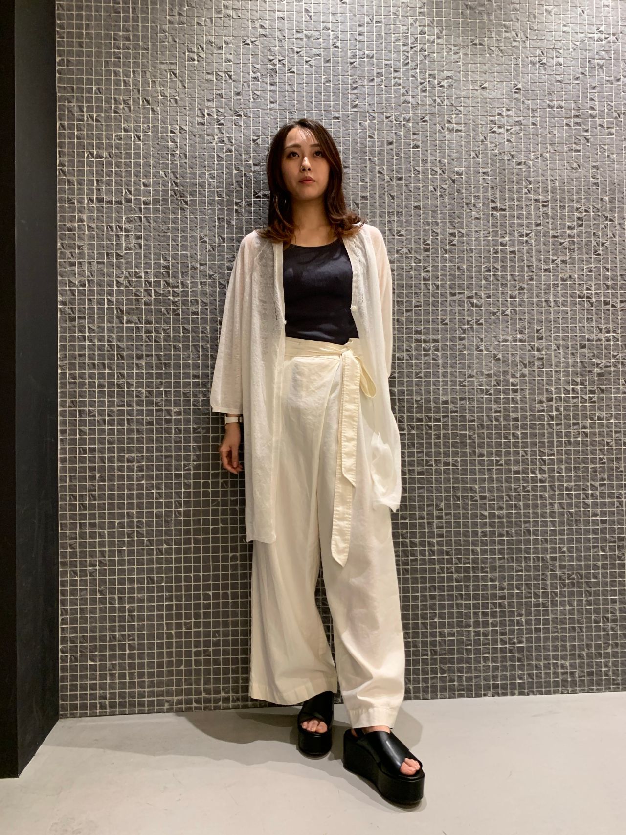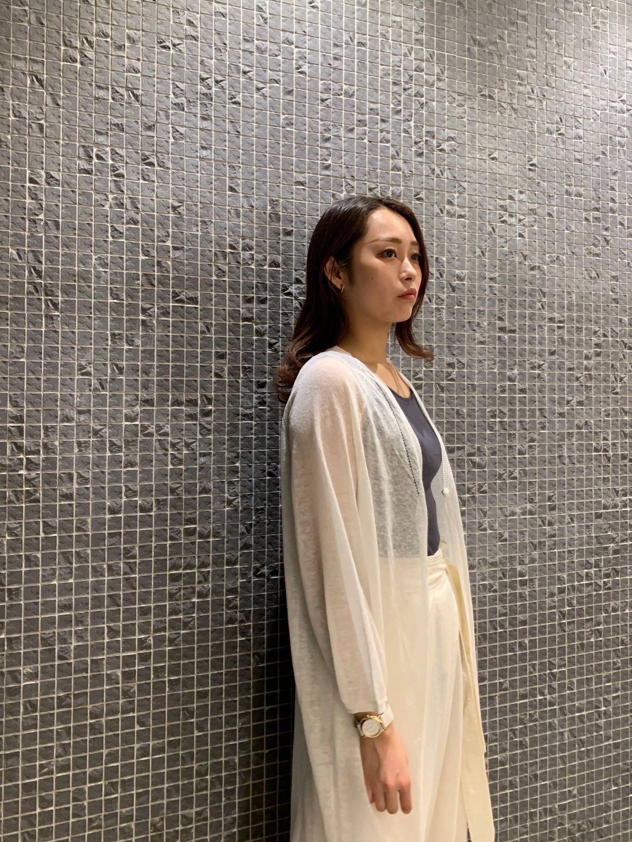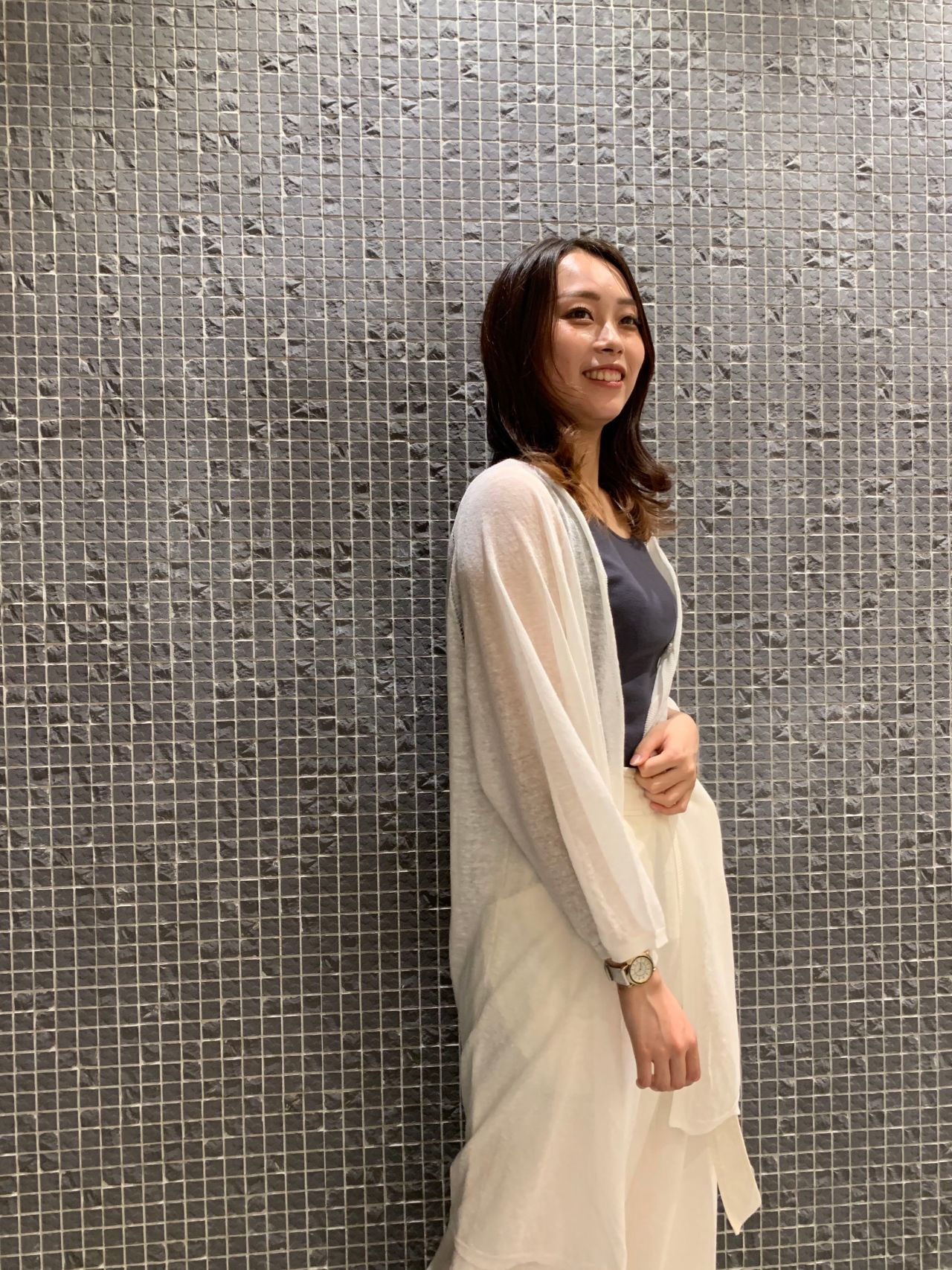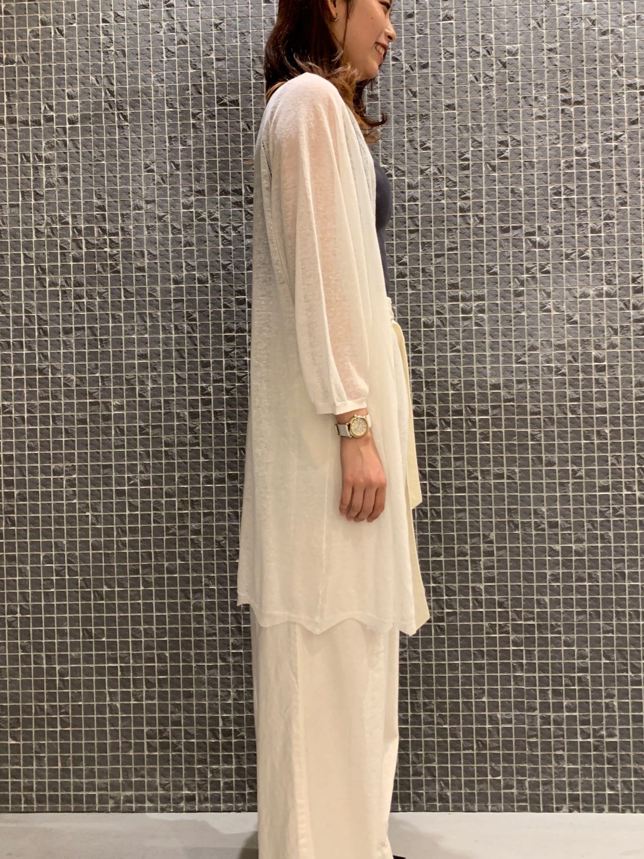 新作のカーディガンを使用したコーディネートです。まだまだ暑い日が続きそうなので、夏らしく白をメインにしたコーディネートをしてみました。