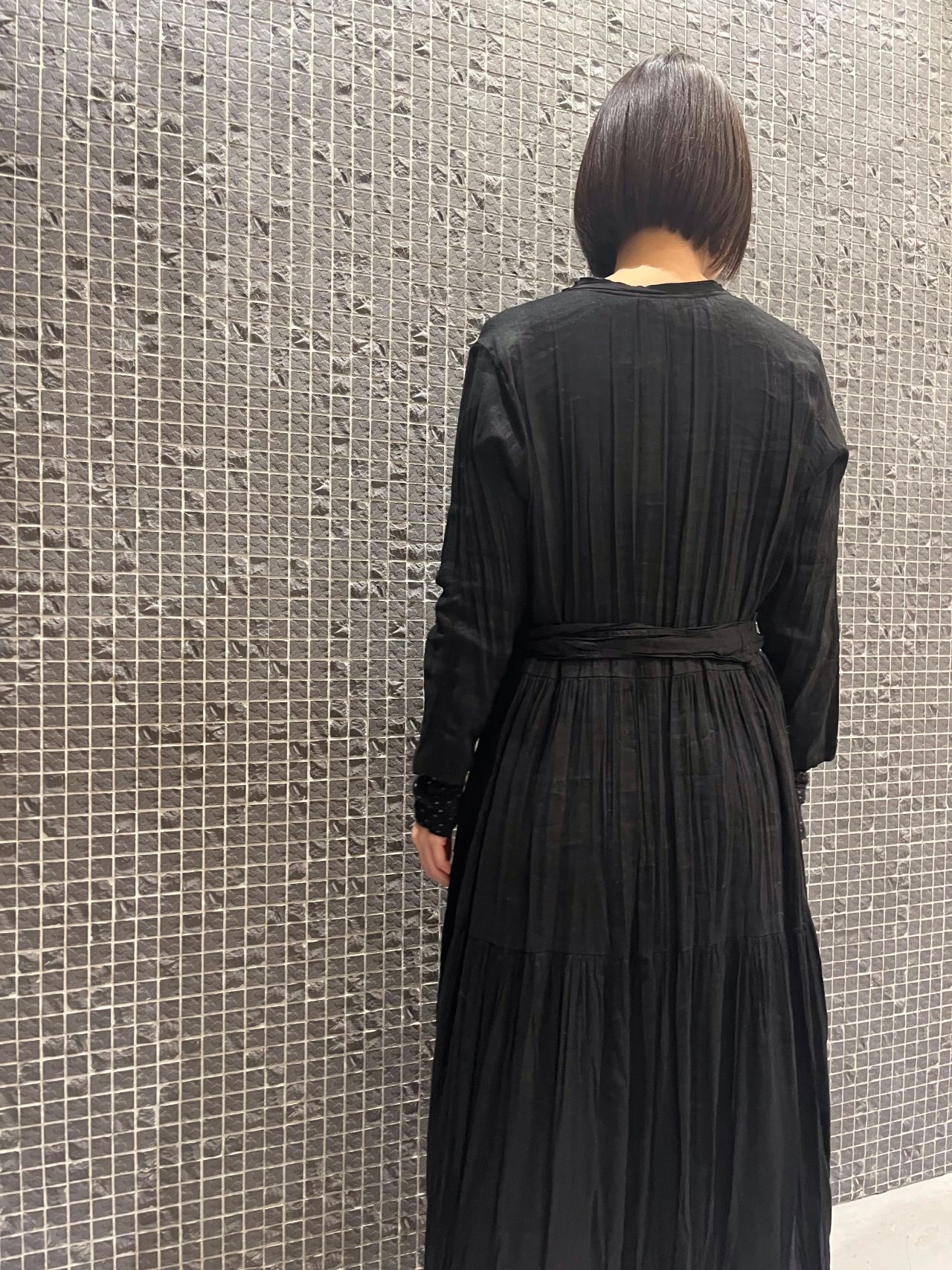 絹のような光沢感が特徴のラミーを使うことで縦の美しいシルエットが生まれるデザイン。