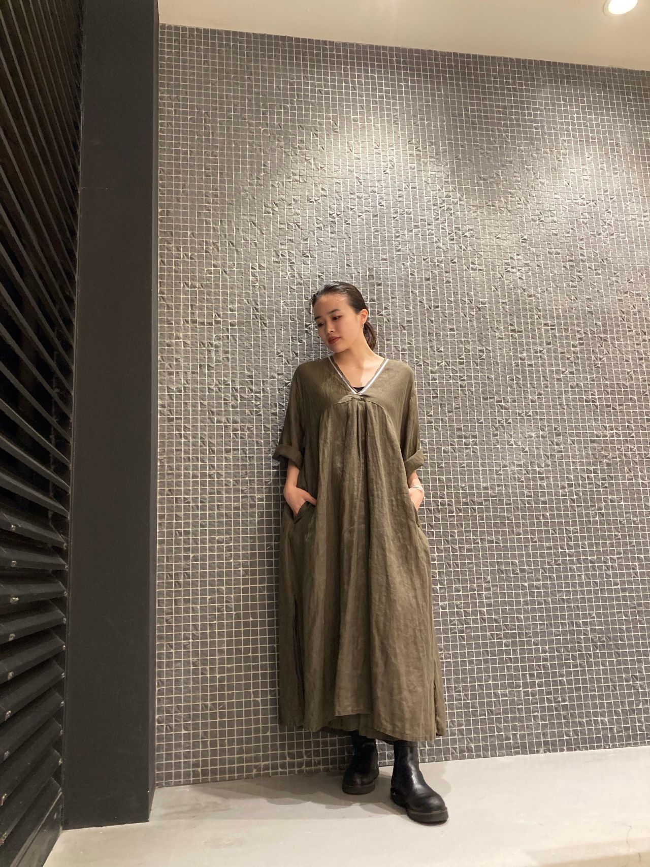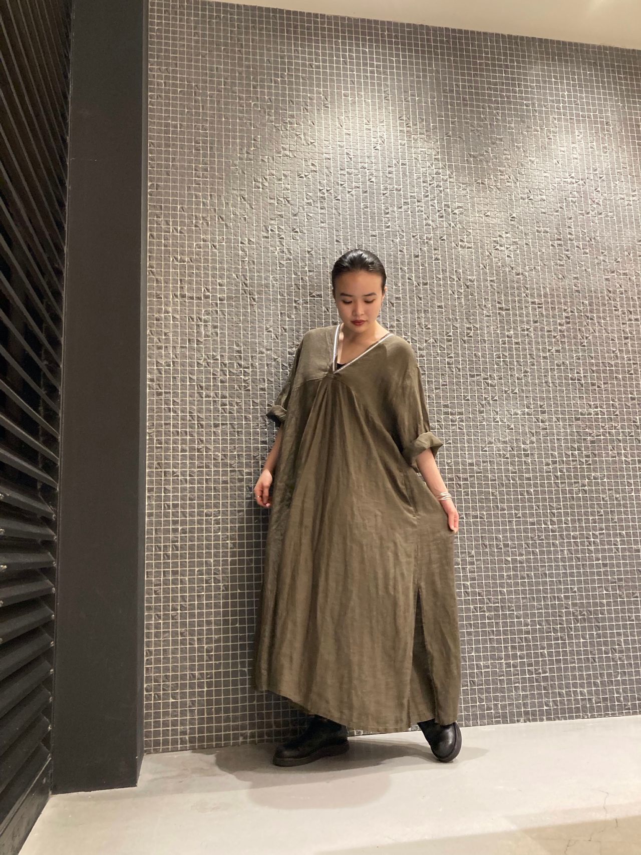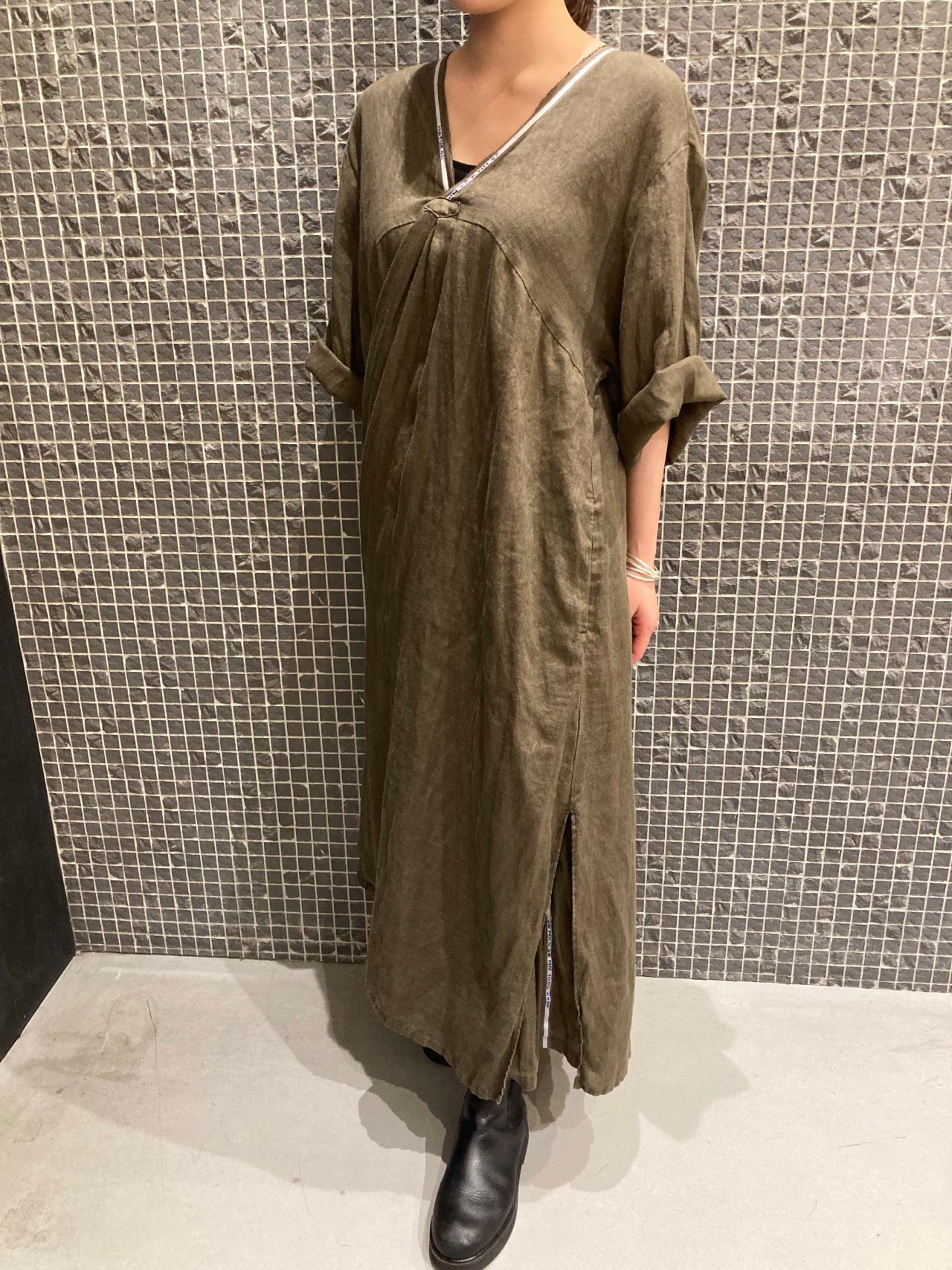 同じ素材、デザインのワンピースは、シャープなネックラインと程よいプリーツで女性らしい上品で清涼感のあるワンピースに。両サイドポケット付き。