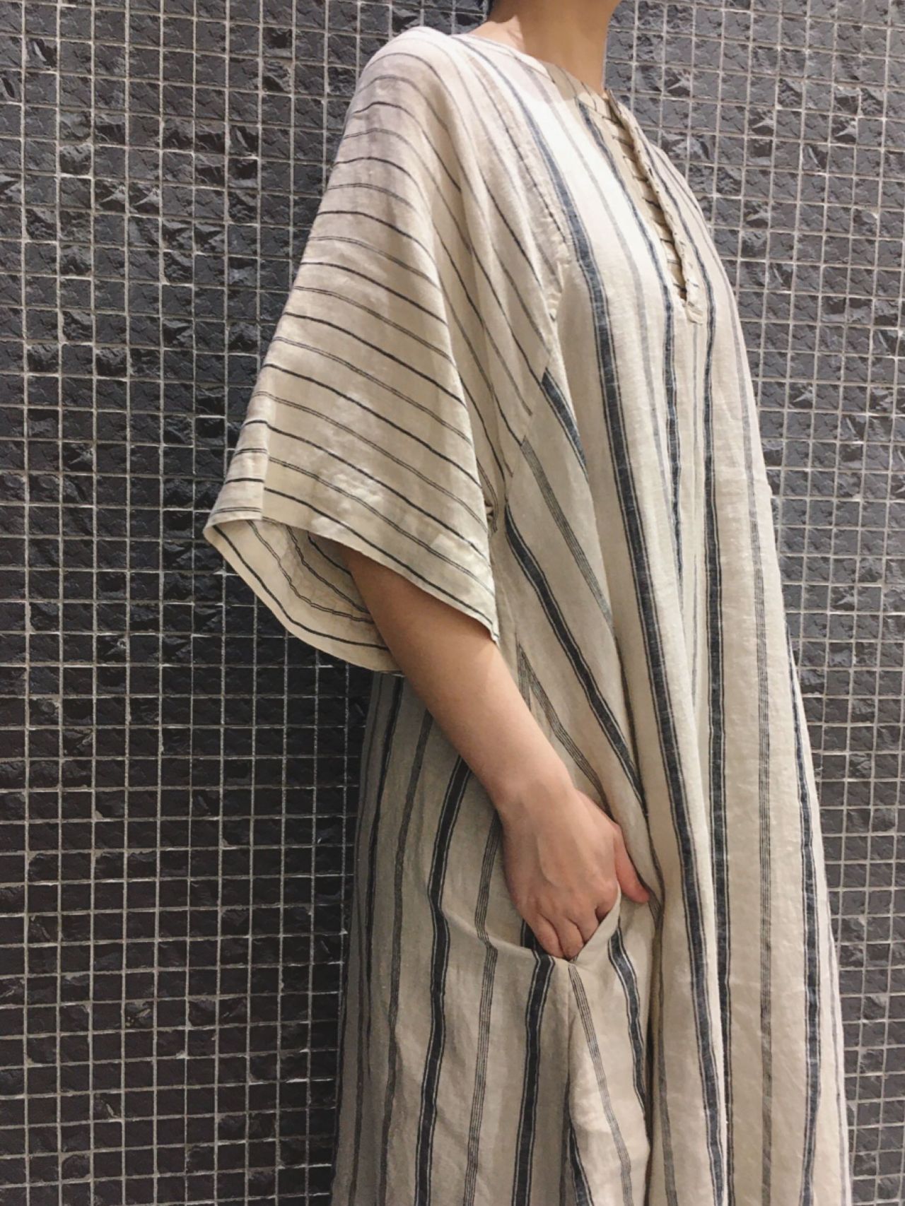 リネン先染めストライプワンピース (3月入荷予定)