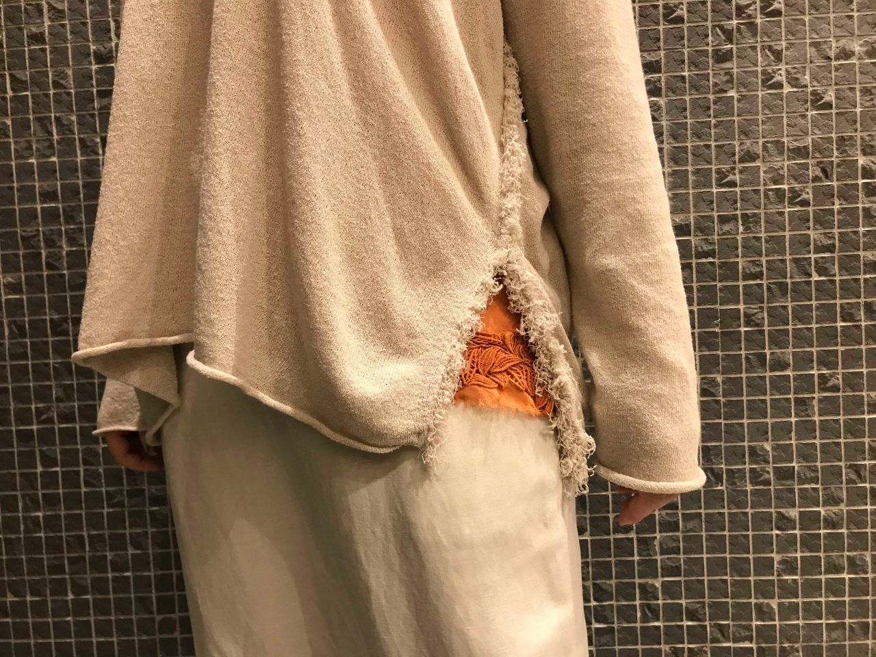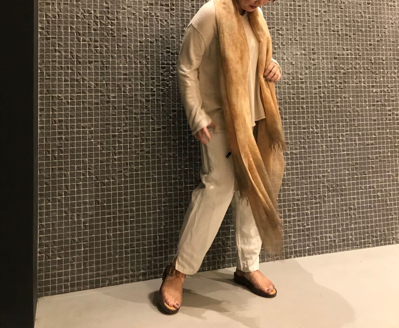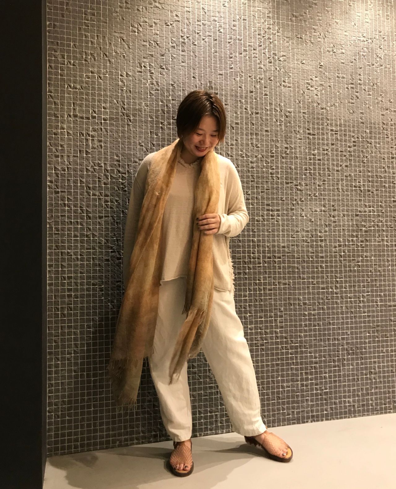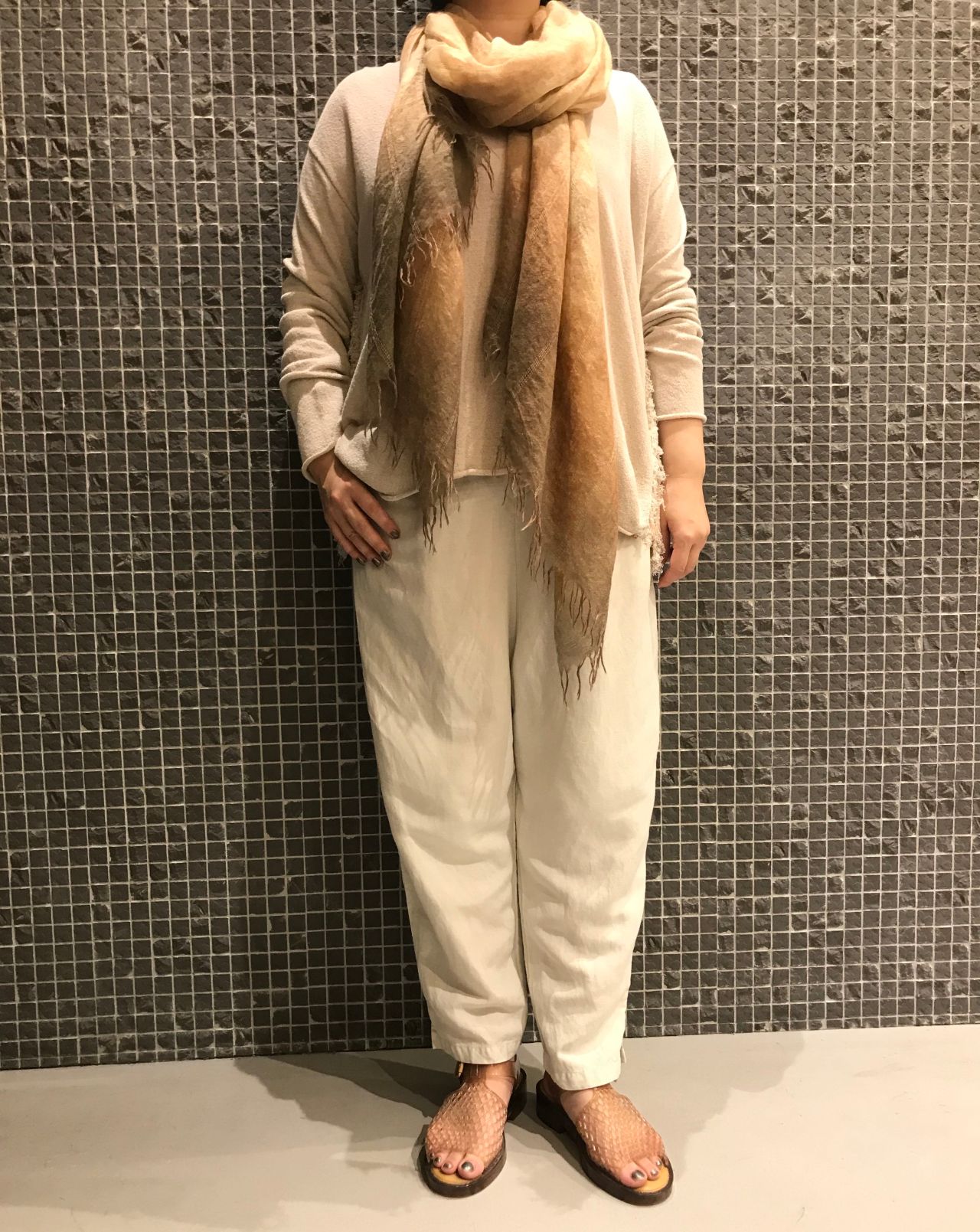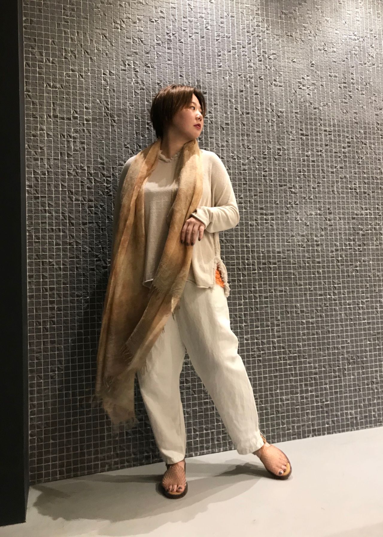 春のニット、ストールは気温対応には欠かせないアイテムでおすすめです。