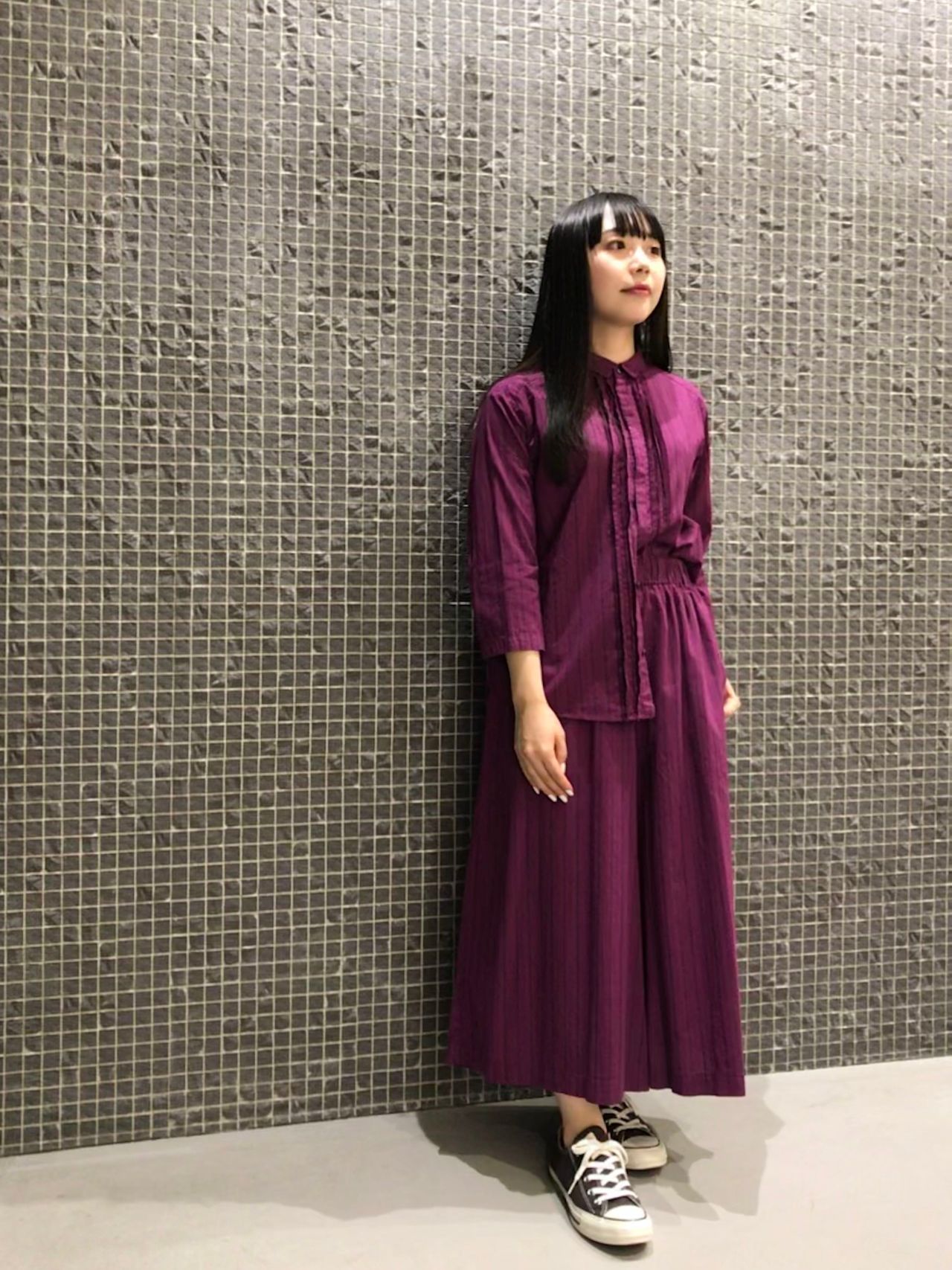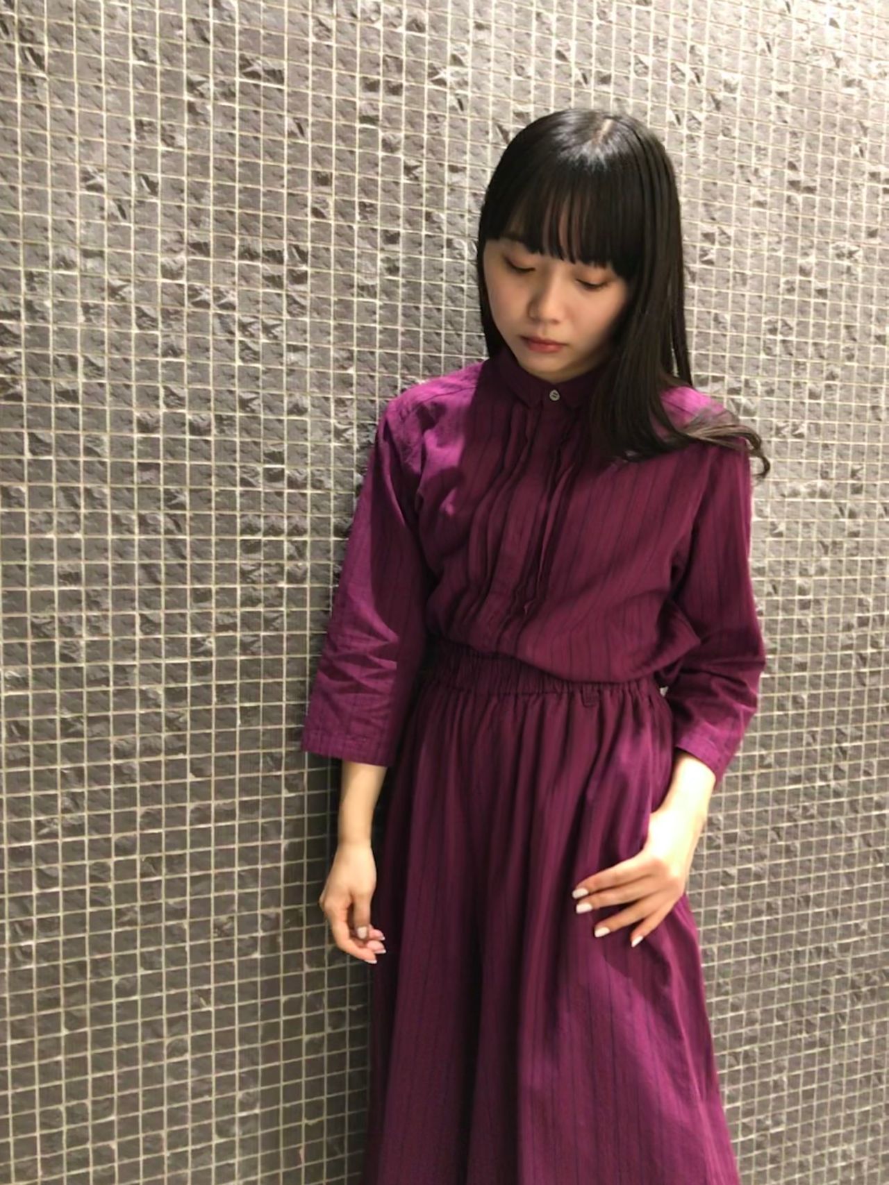 ブラウスとボトムは上下別々でもそれぞれお使い頂けますが、揃えで着るとワンピースを着ているように見えて素敵さがアップしますよ。