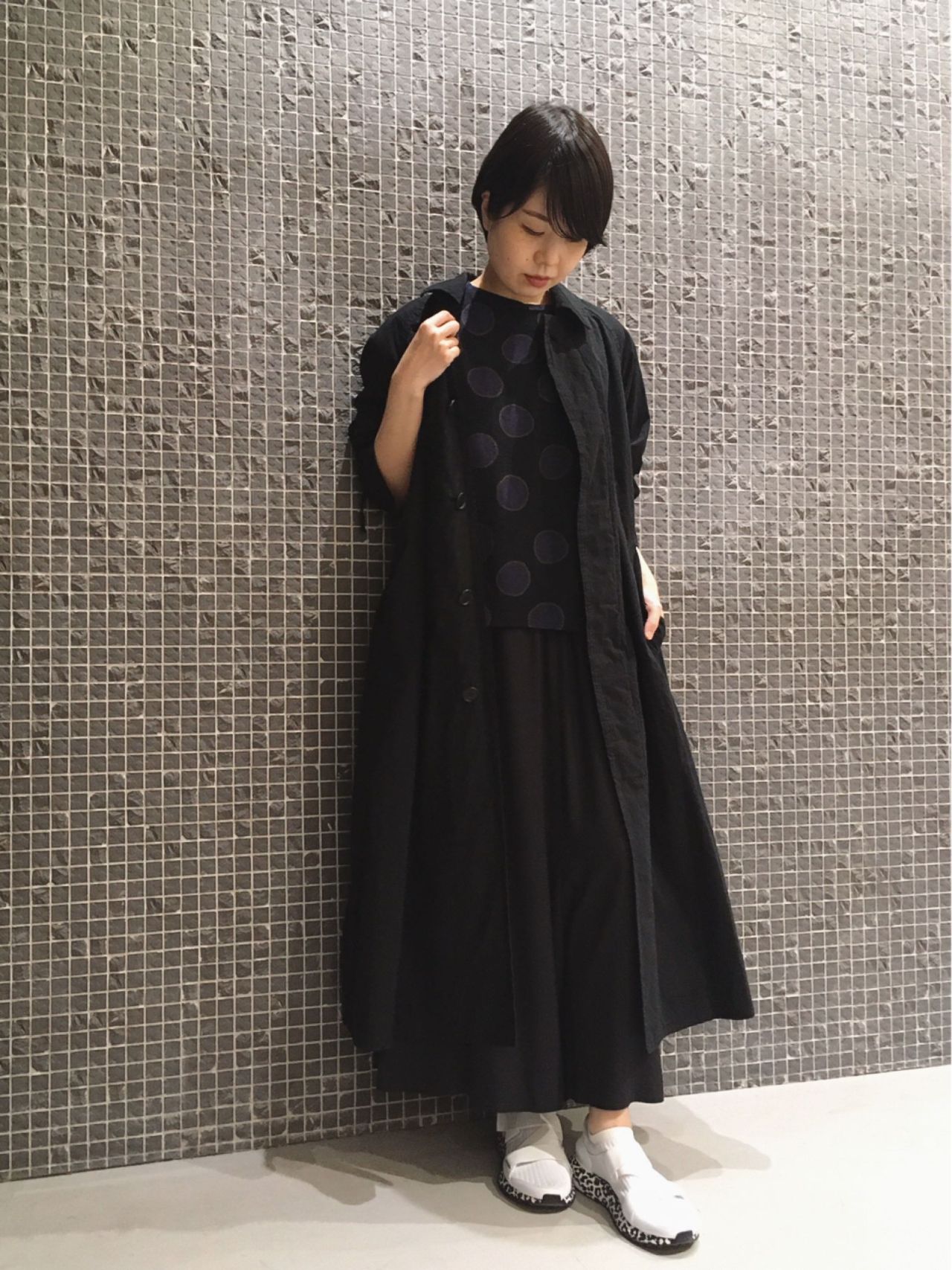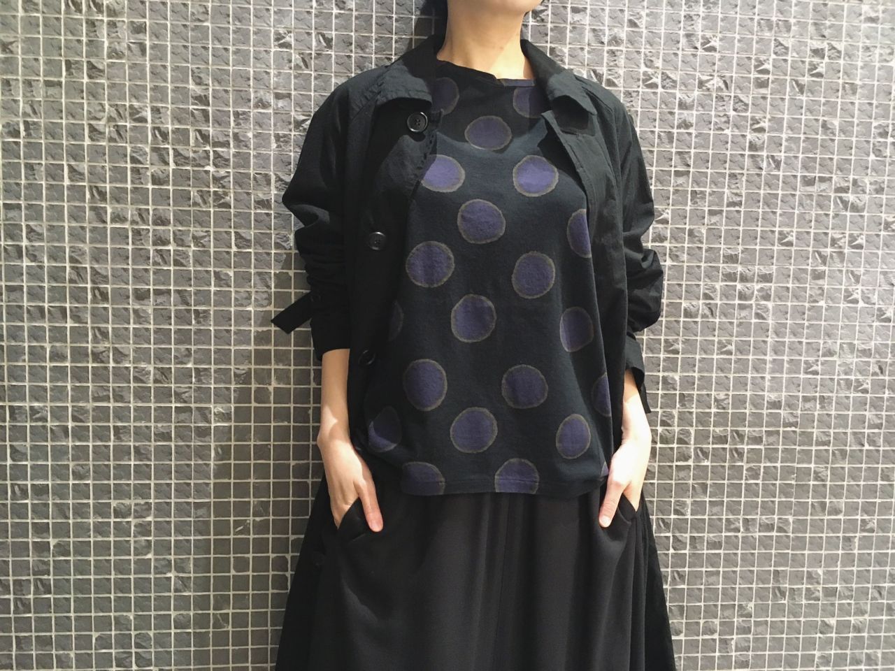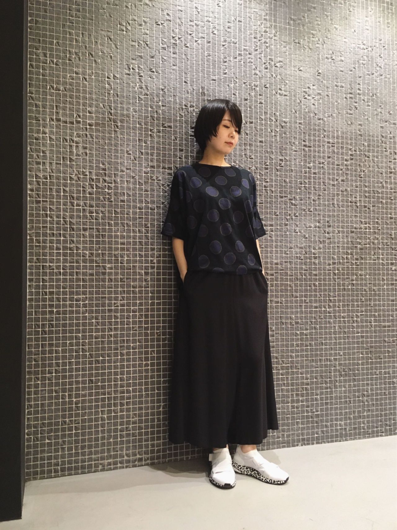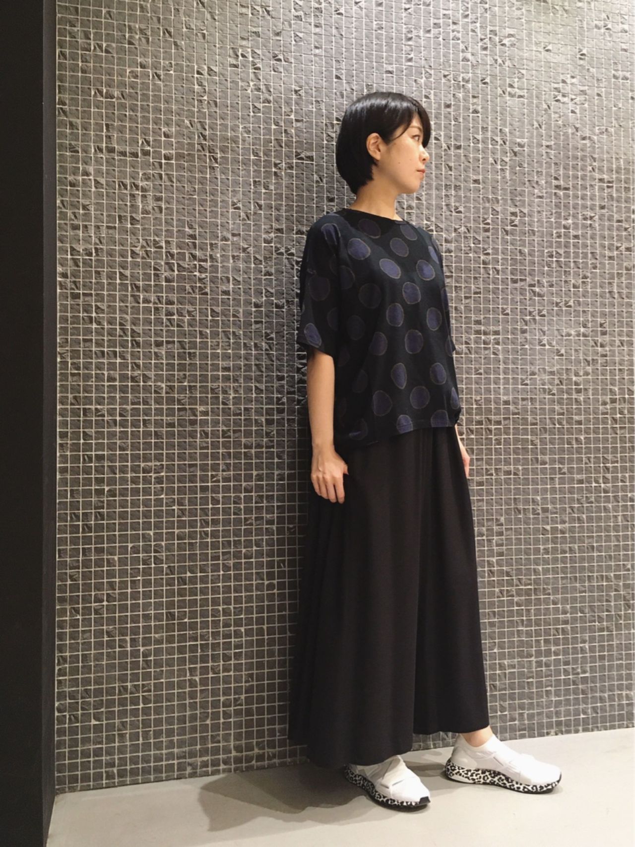 モード感漂うドットTシャツを黒のワントーンでスタイリングしました。