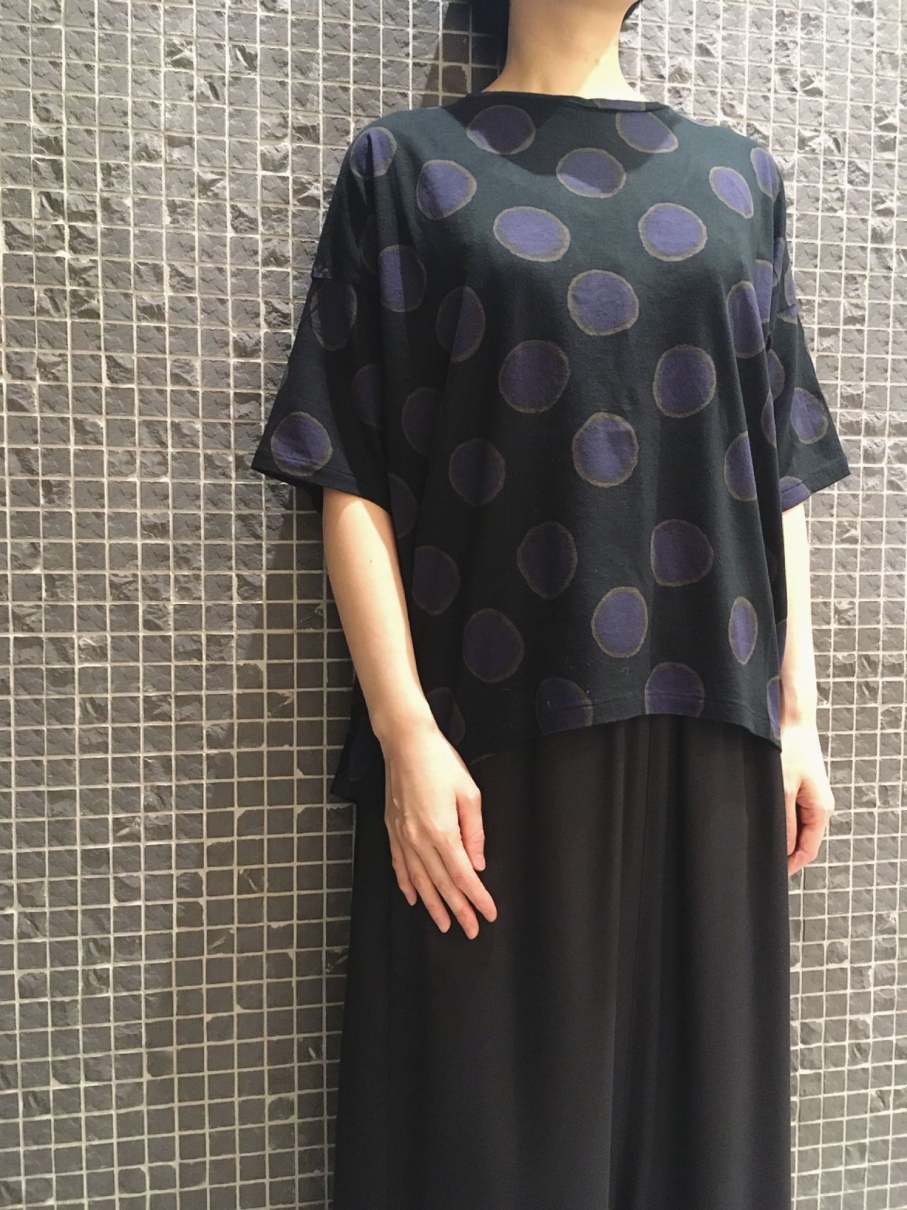大きめドットの存在感は、無地やボーダーTシャツと一線を画すインパクトのある一枚。