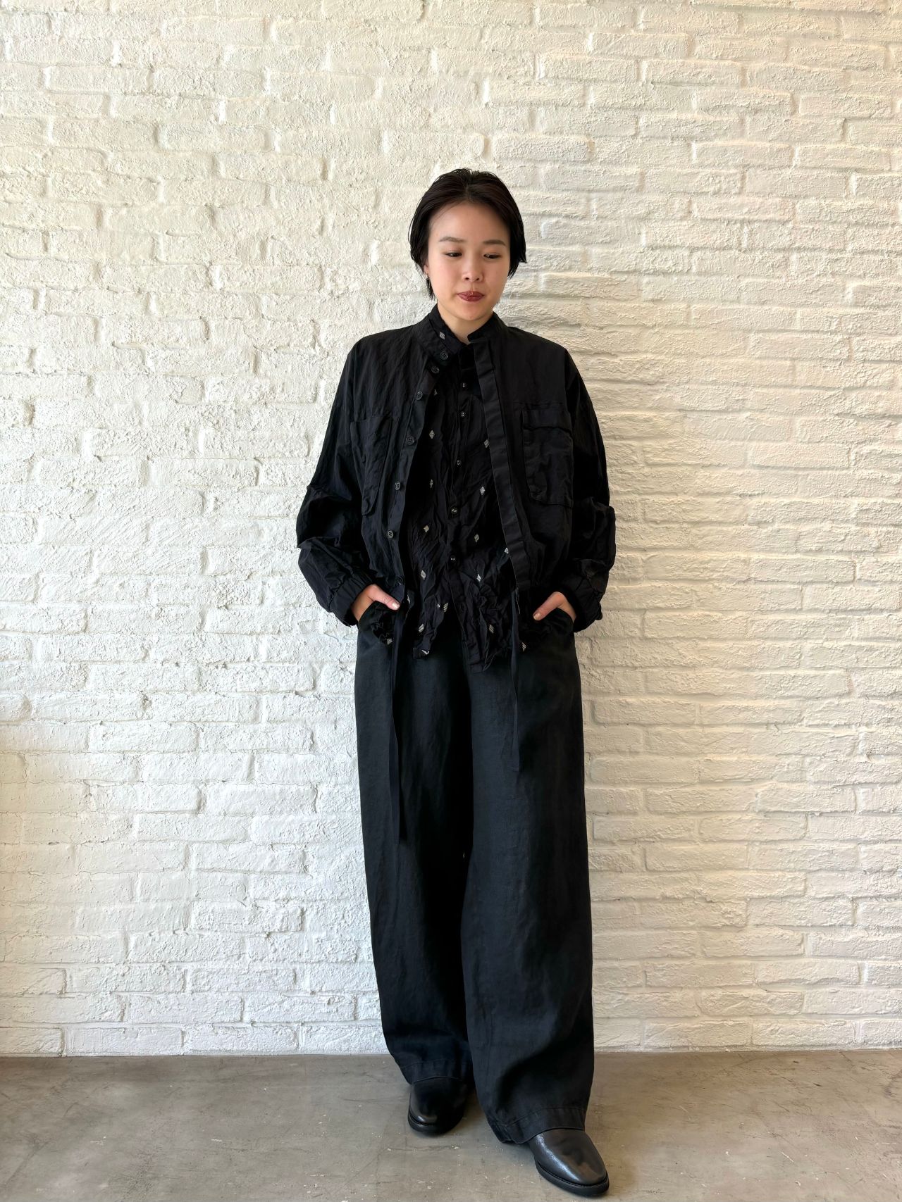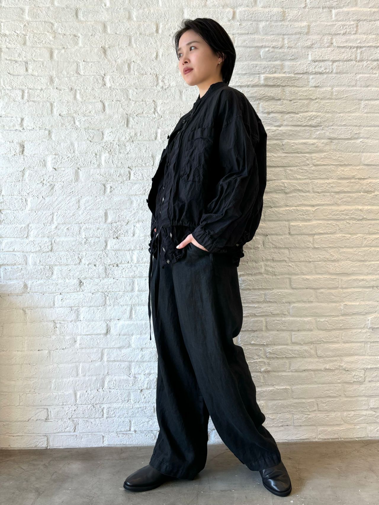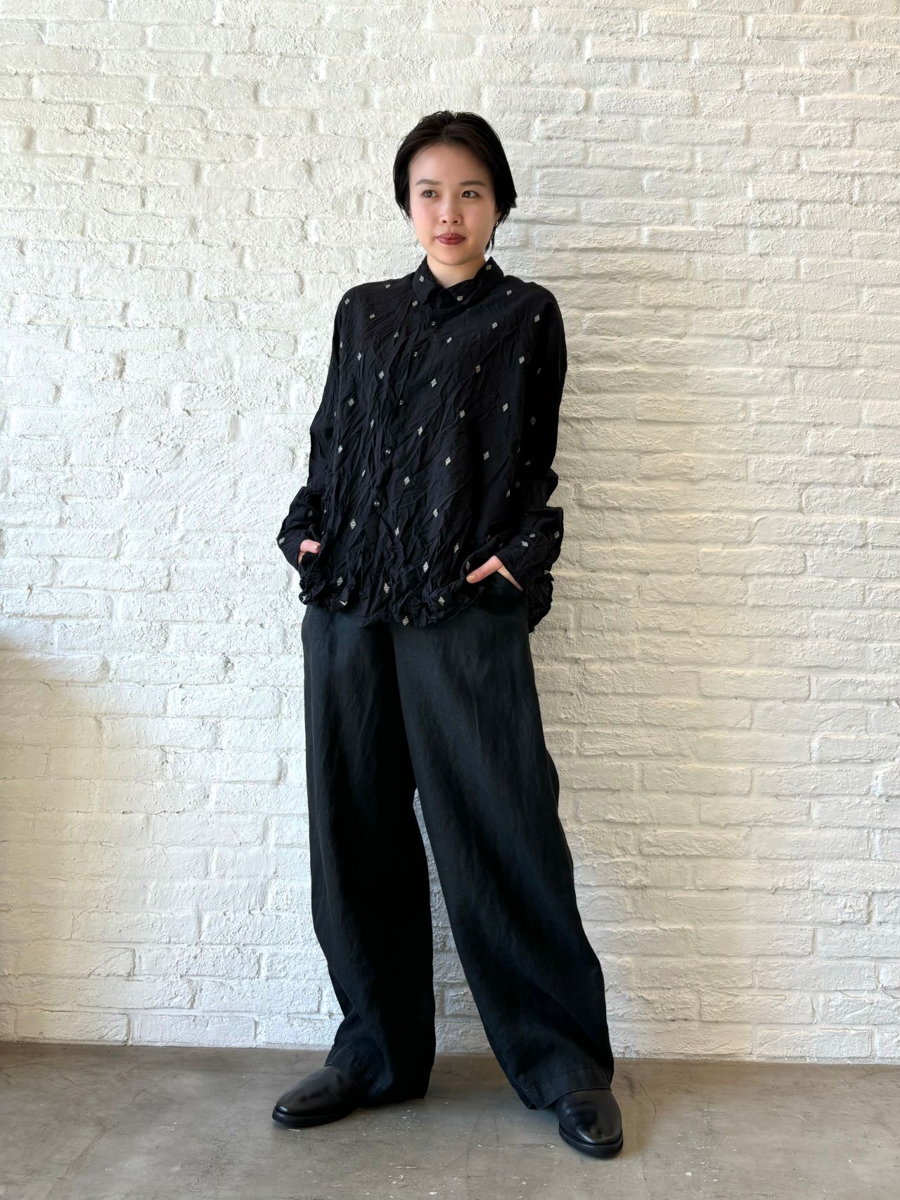 軽さと表情のあるトップスを合わせたため、黒でも柔らかい印象に。