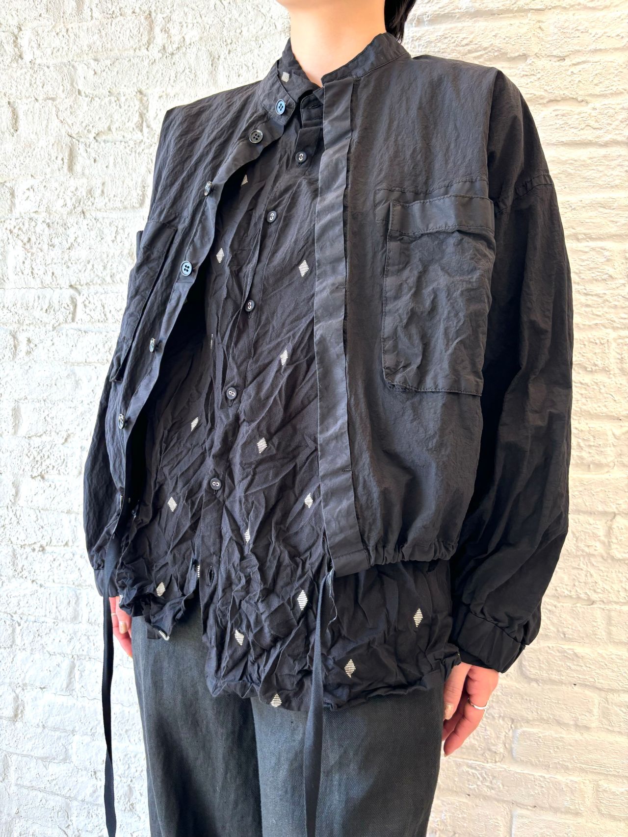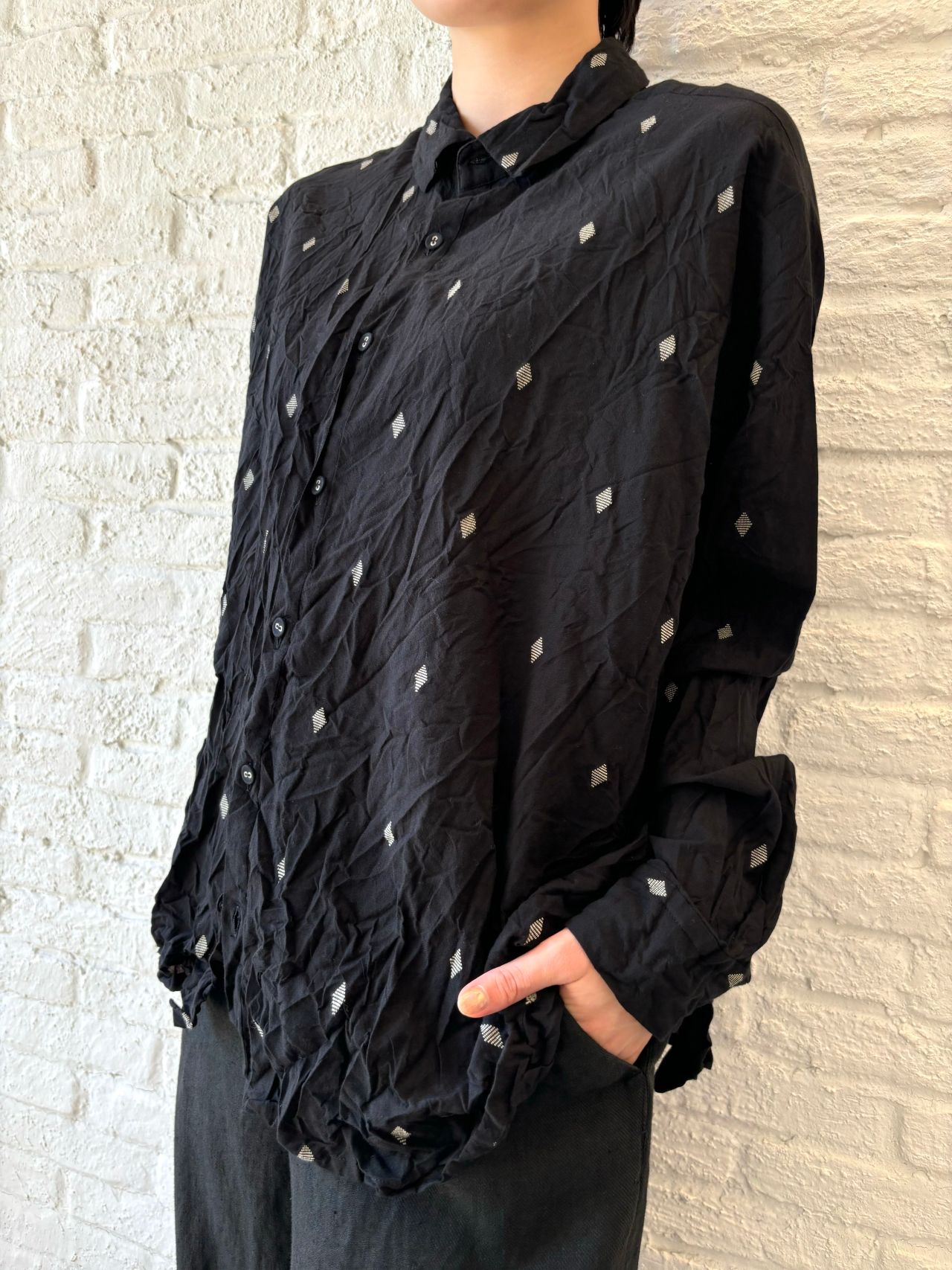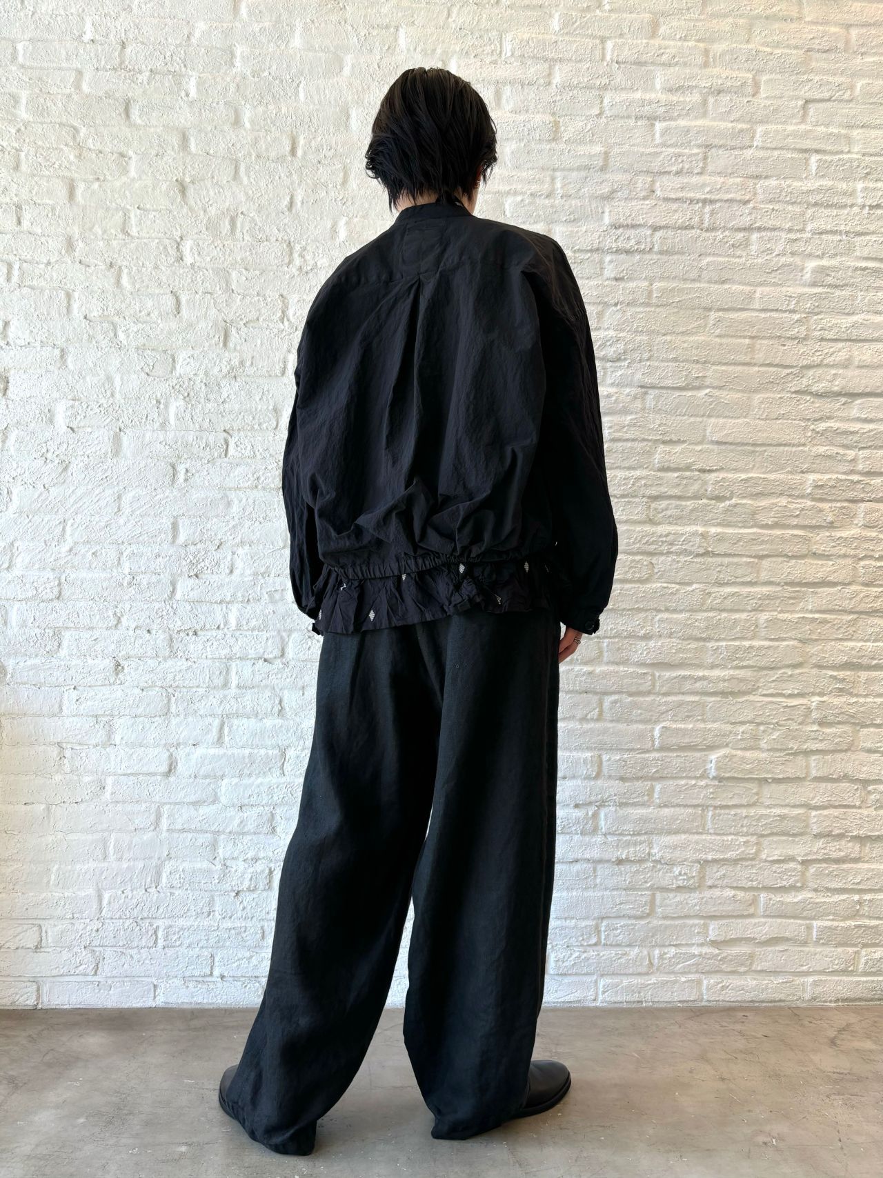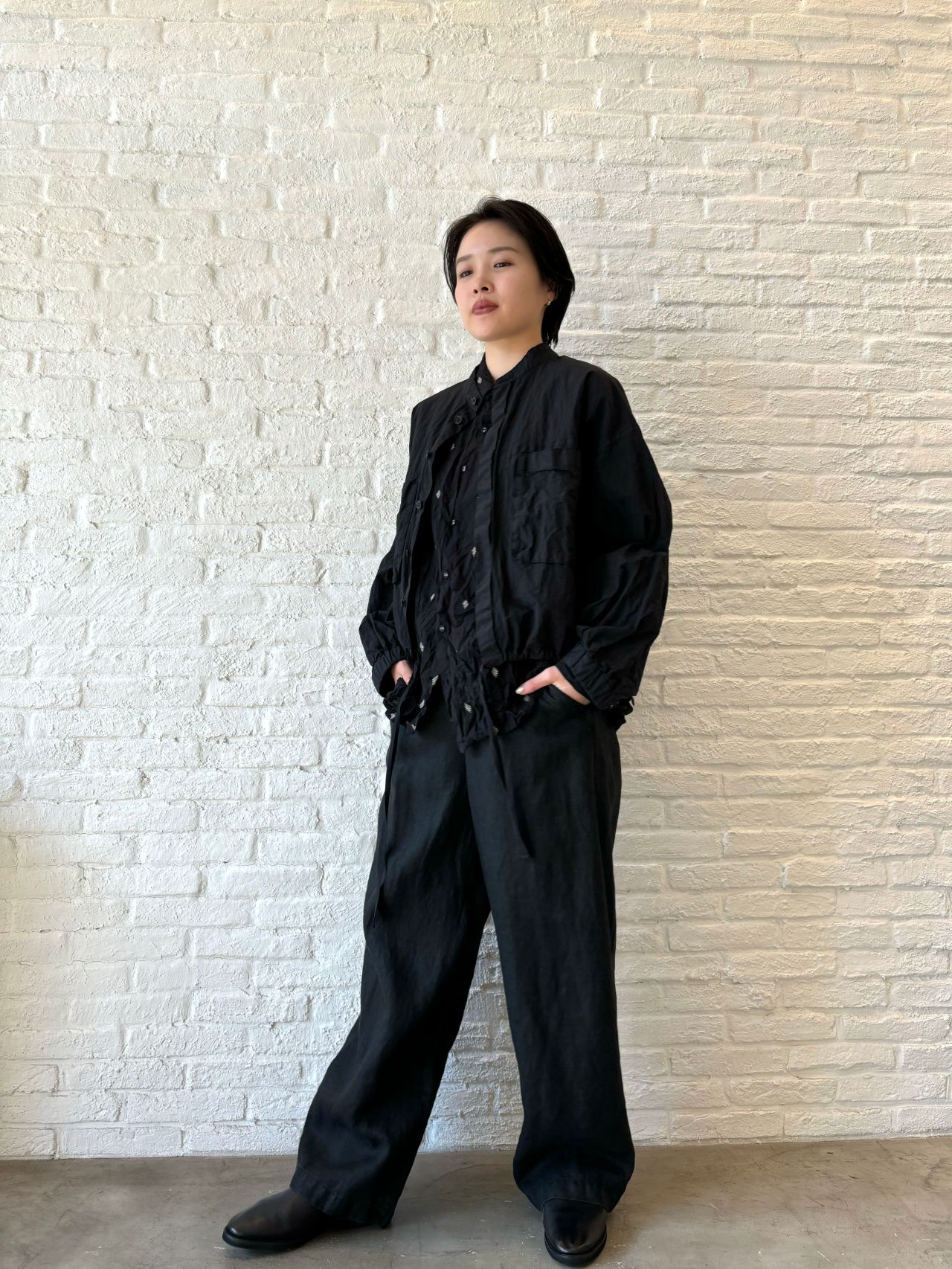 軽さと表情のあるトップスを合わせたため、黒でも柔らかい印象に。