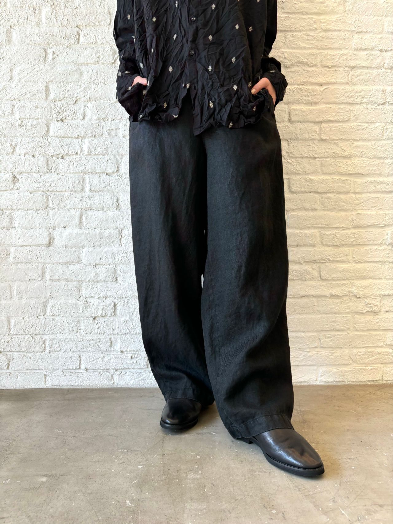 ブラウスはインド綿、たっぷりとボリュームのあるパンツは麻100%