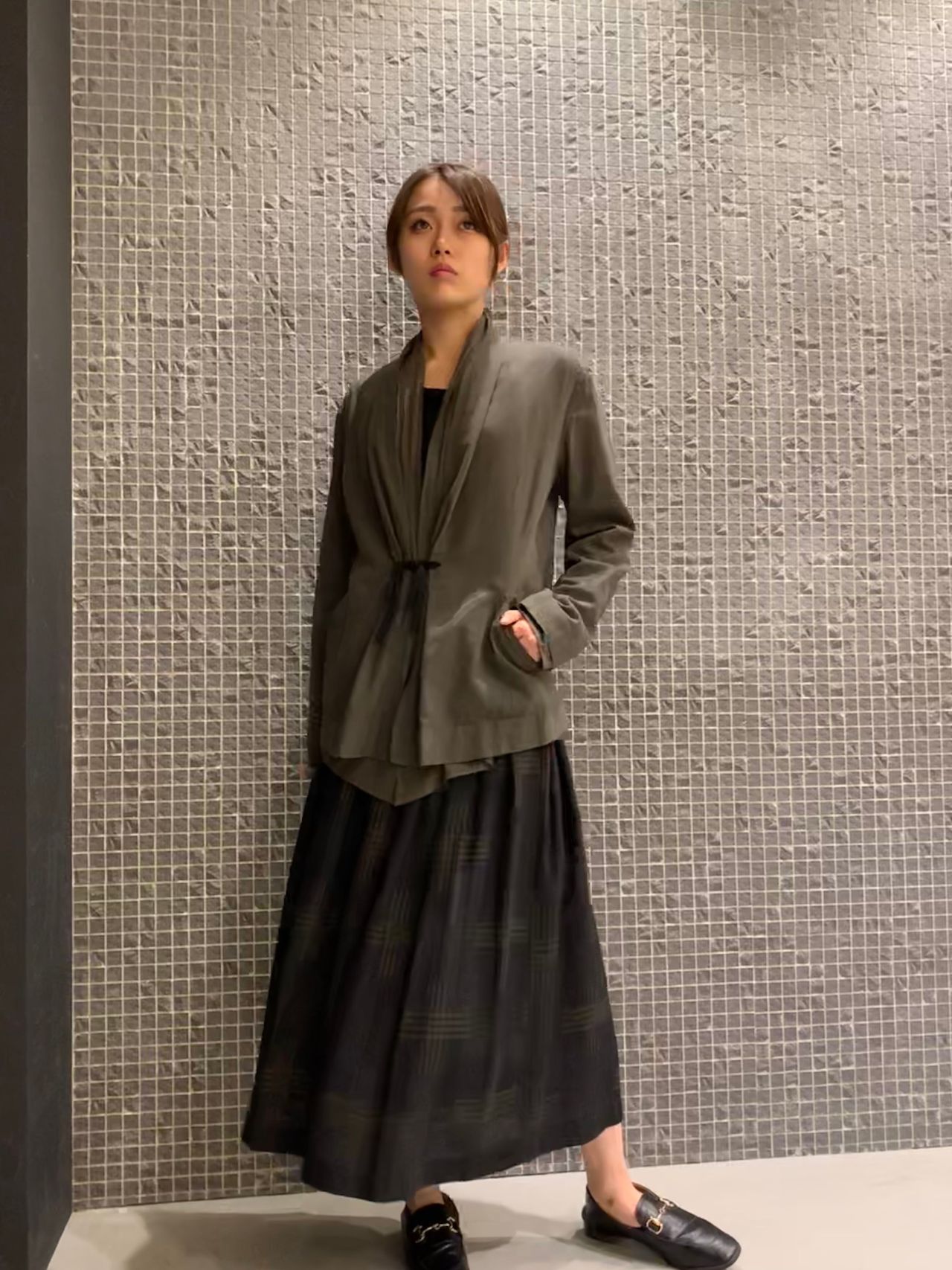 ジャケットは2枚重ねになっており、中の1枚を外してシンプルなジャケットとしても使用することができます。前がボタンではなくリボンなのもポイントですよね。色んなスタイルに合わせられるのでお持ちのワンピースやパンツスタイルにいかがでしょうか?
