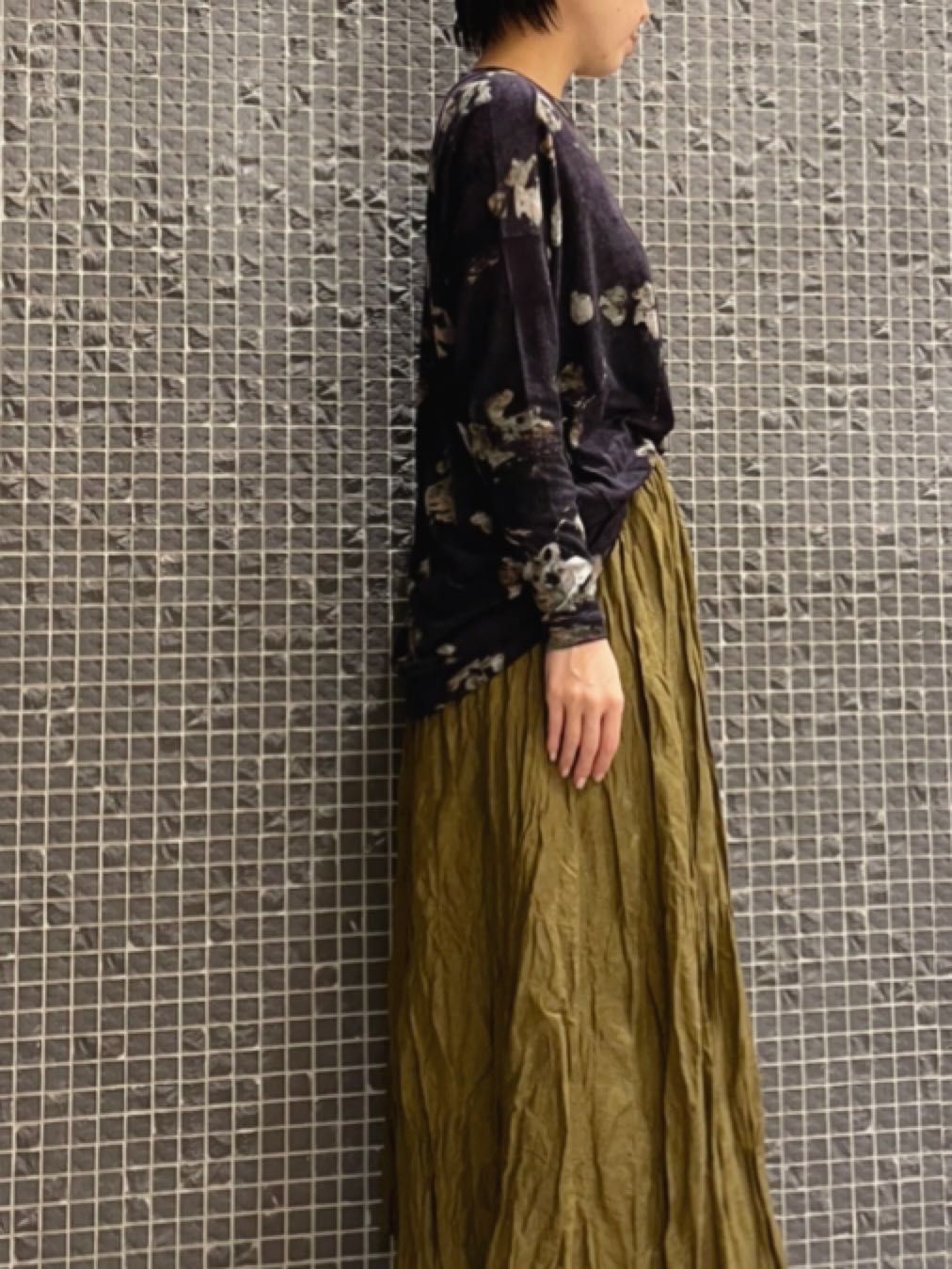 平面で見るととてもゆったりしたワイドシルエットですが、着てみると袖のフィット感や脇が自然と落ちて、女性らしい印象に。