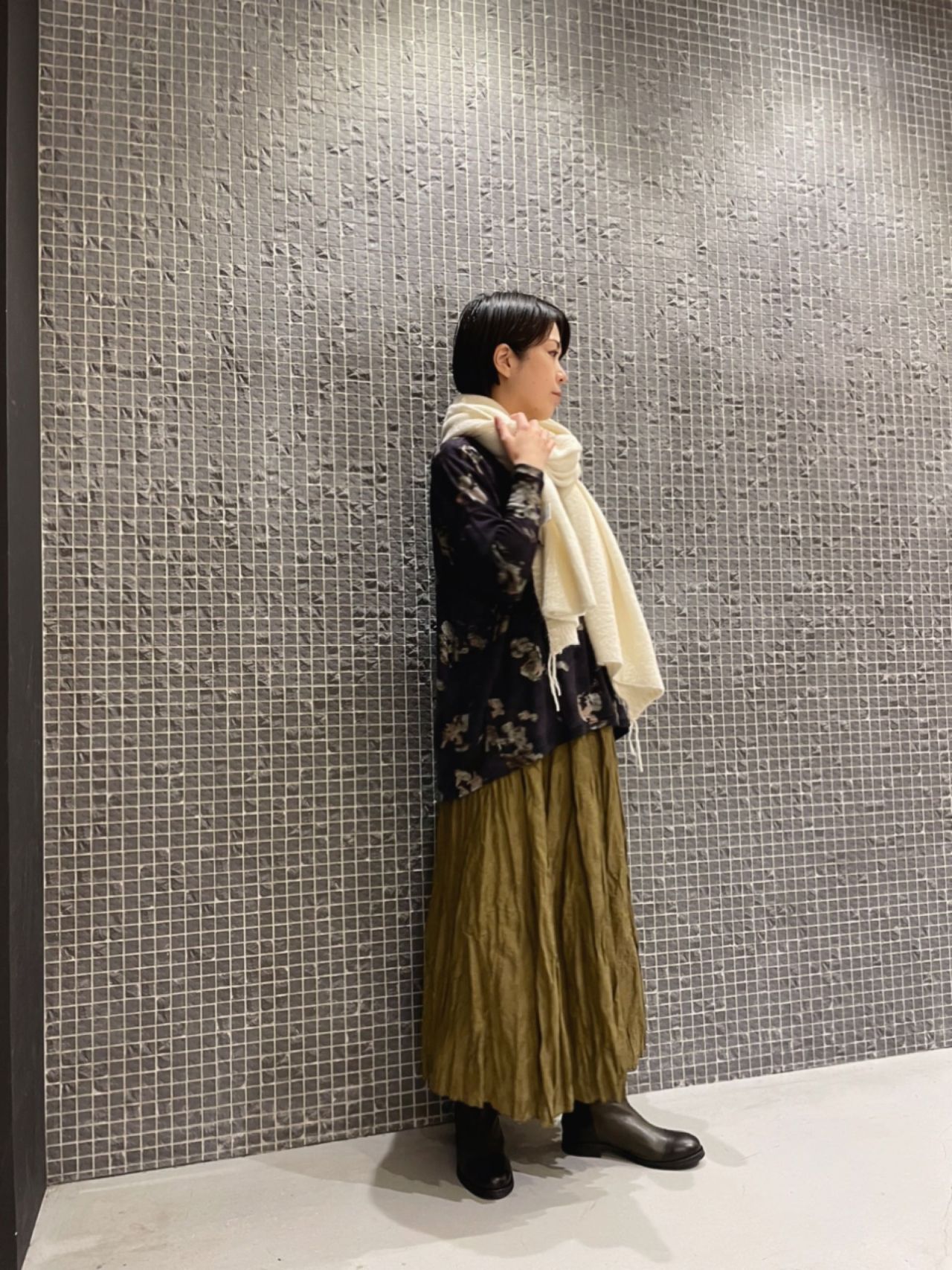 今の時期から長く活躍してくれそうな薄手のウール素材で、風合いを出すためにガーゼ編みをしています。