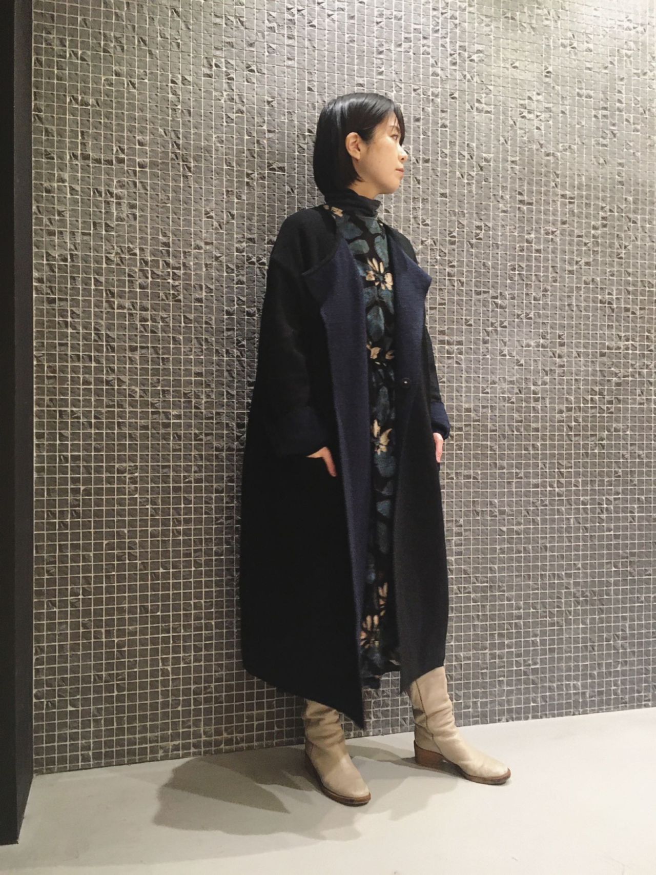 アウターも裏地のないニットローブで身軽に。