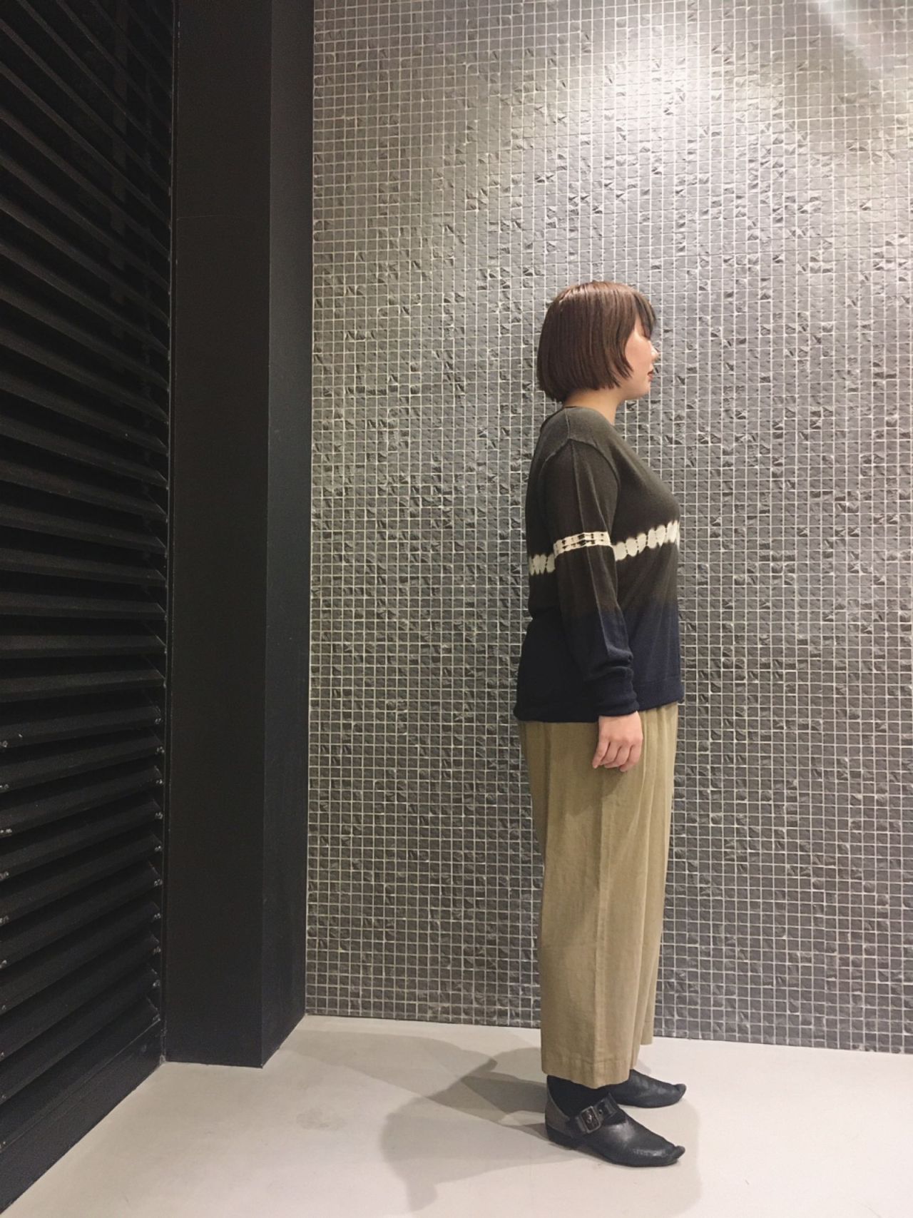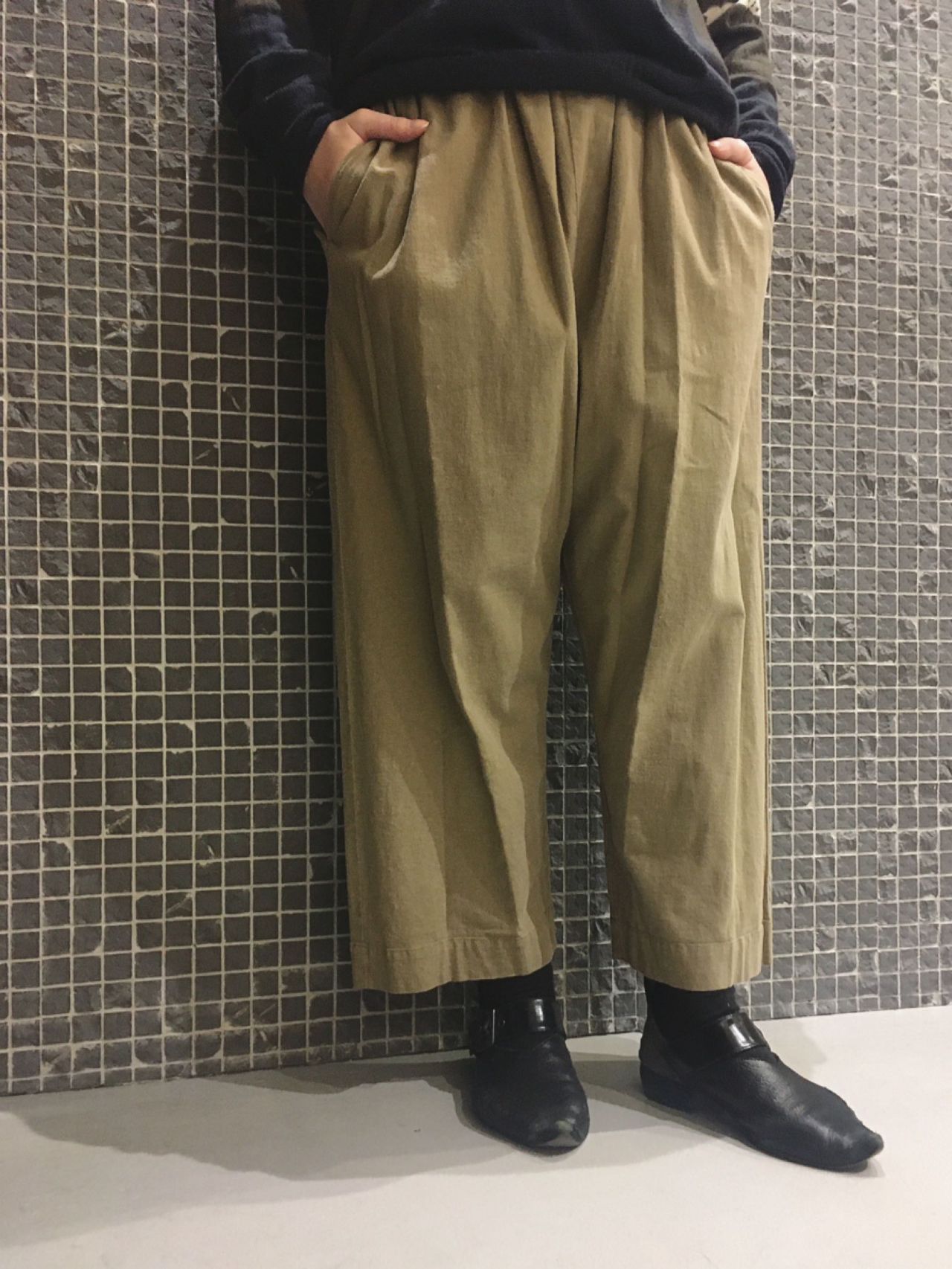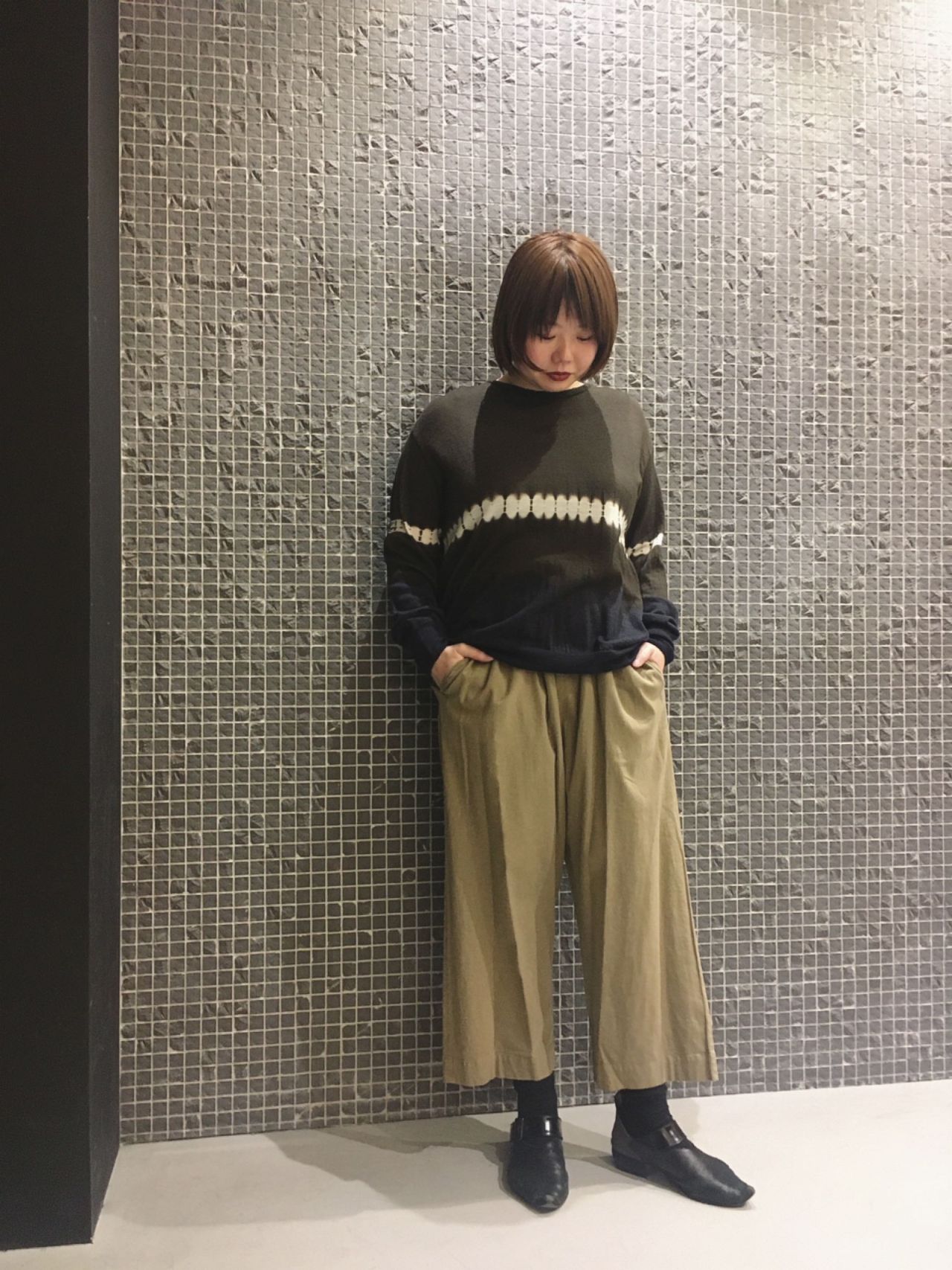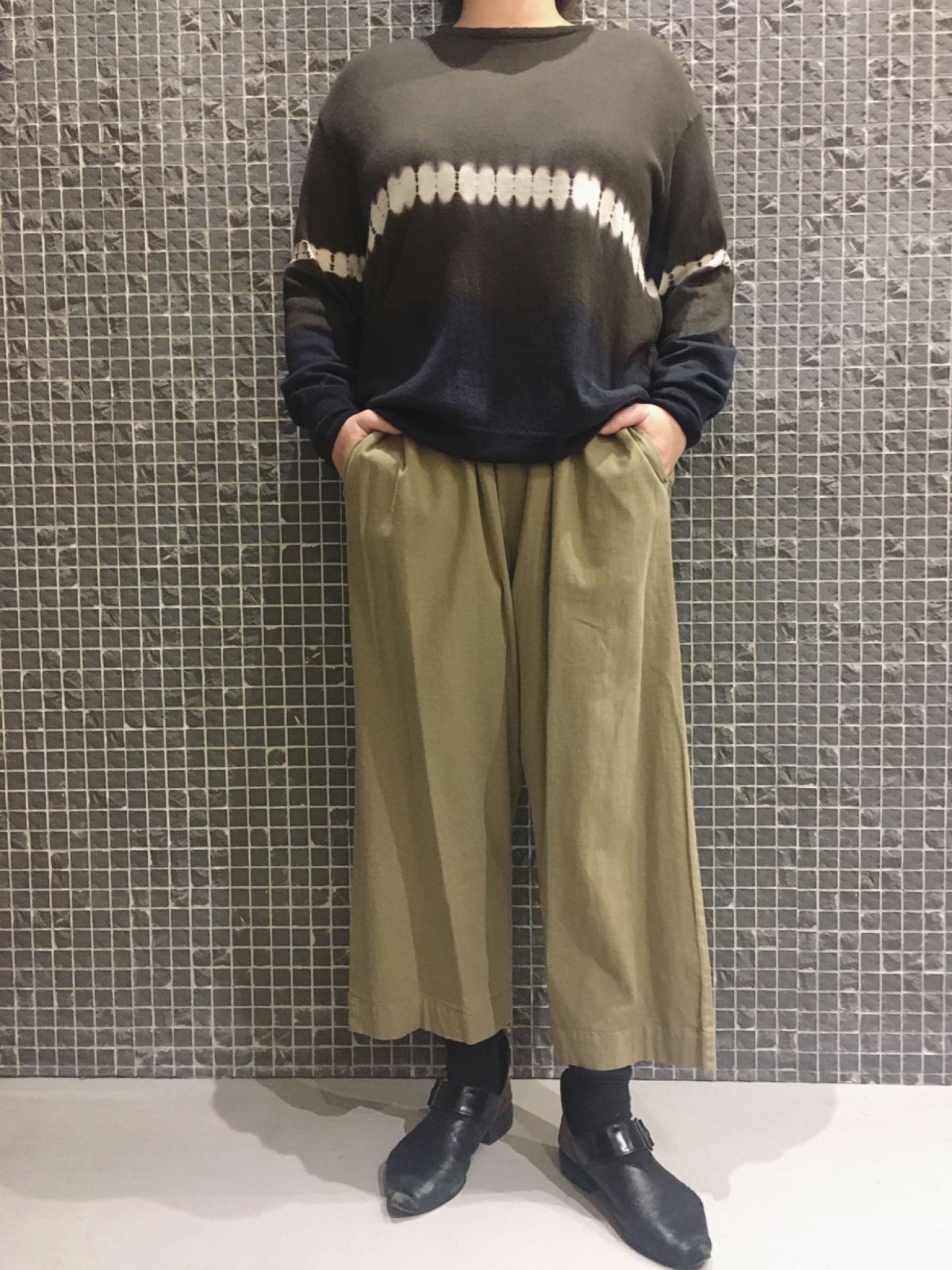 今回は吉祥寺店では入荷して即完売だった、有松絞りのニットを主役にコーディネート。
