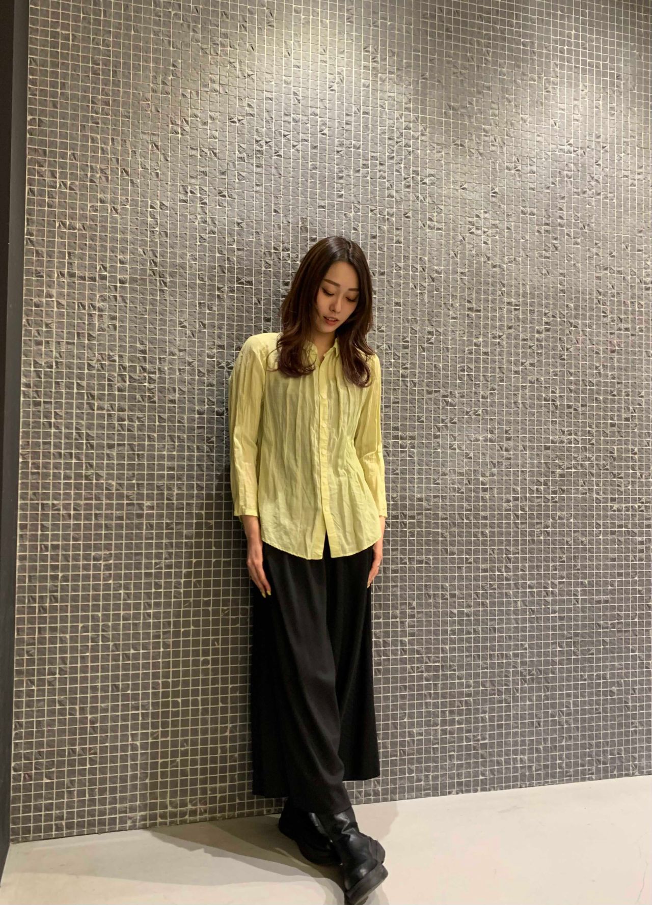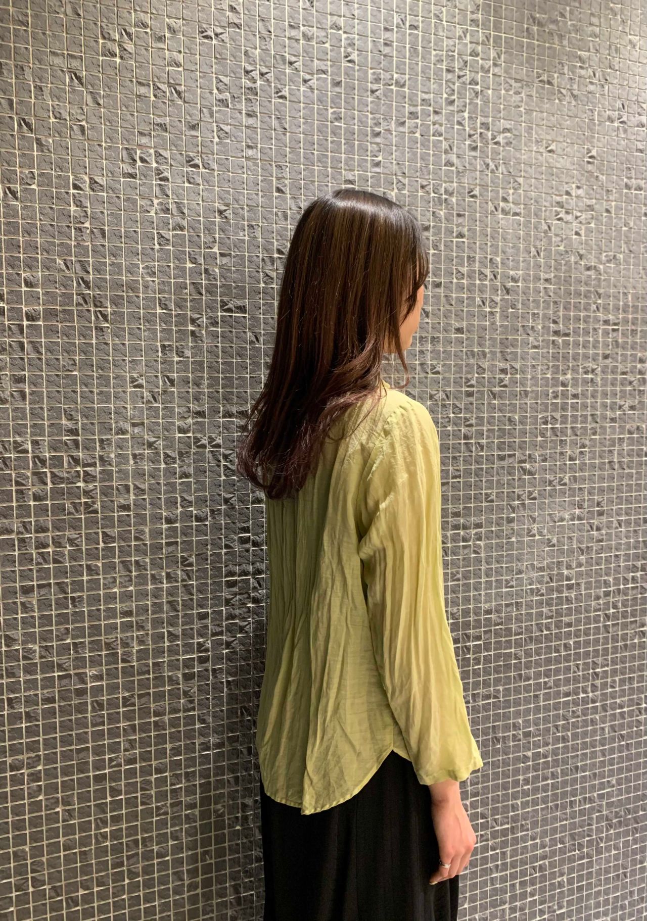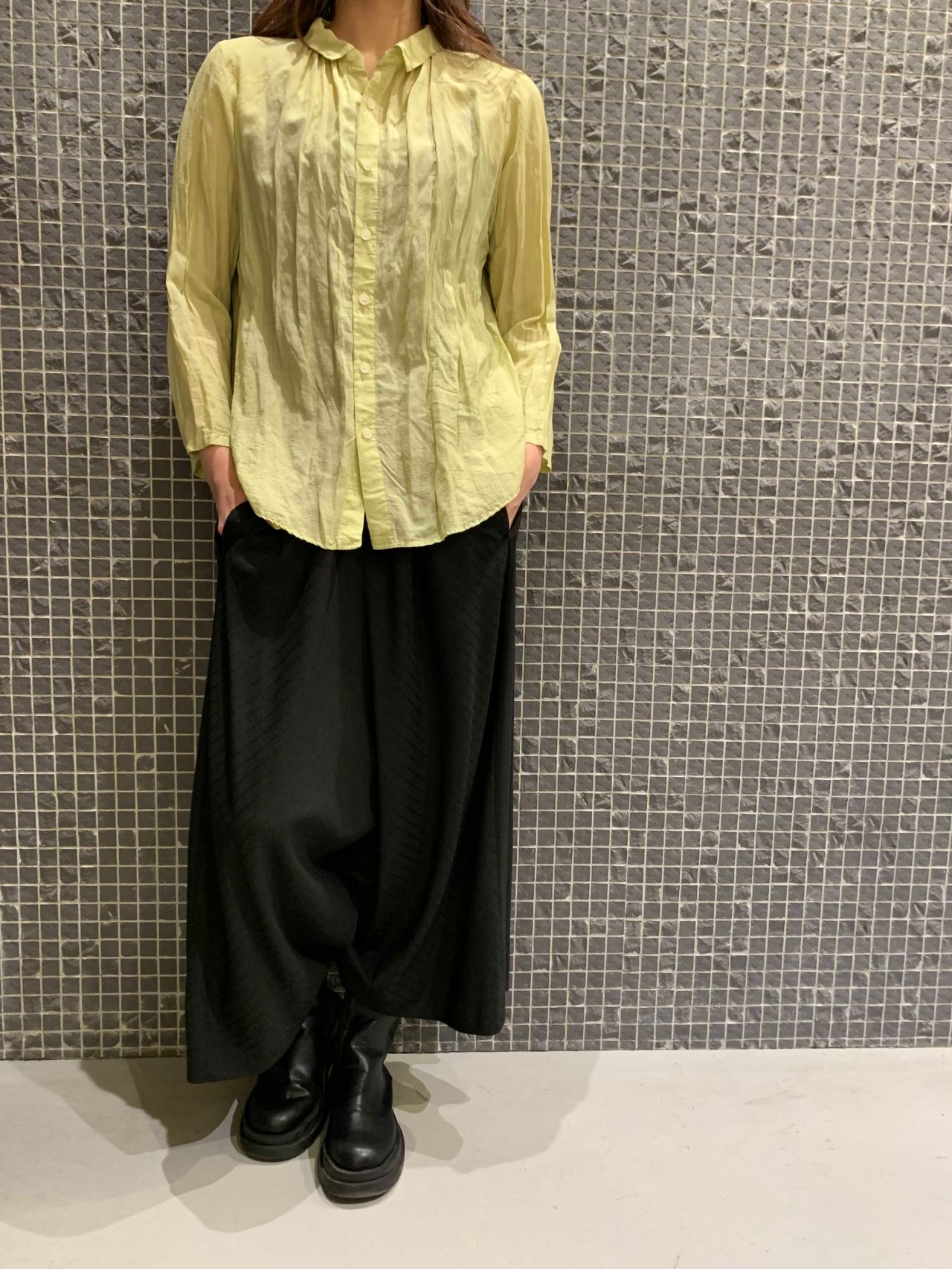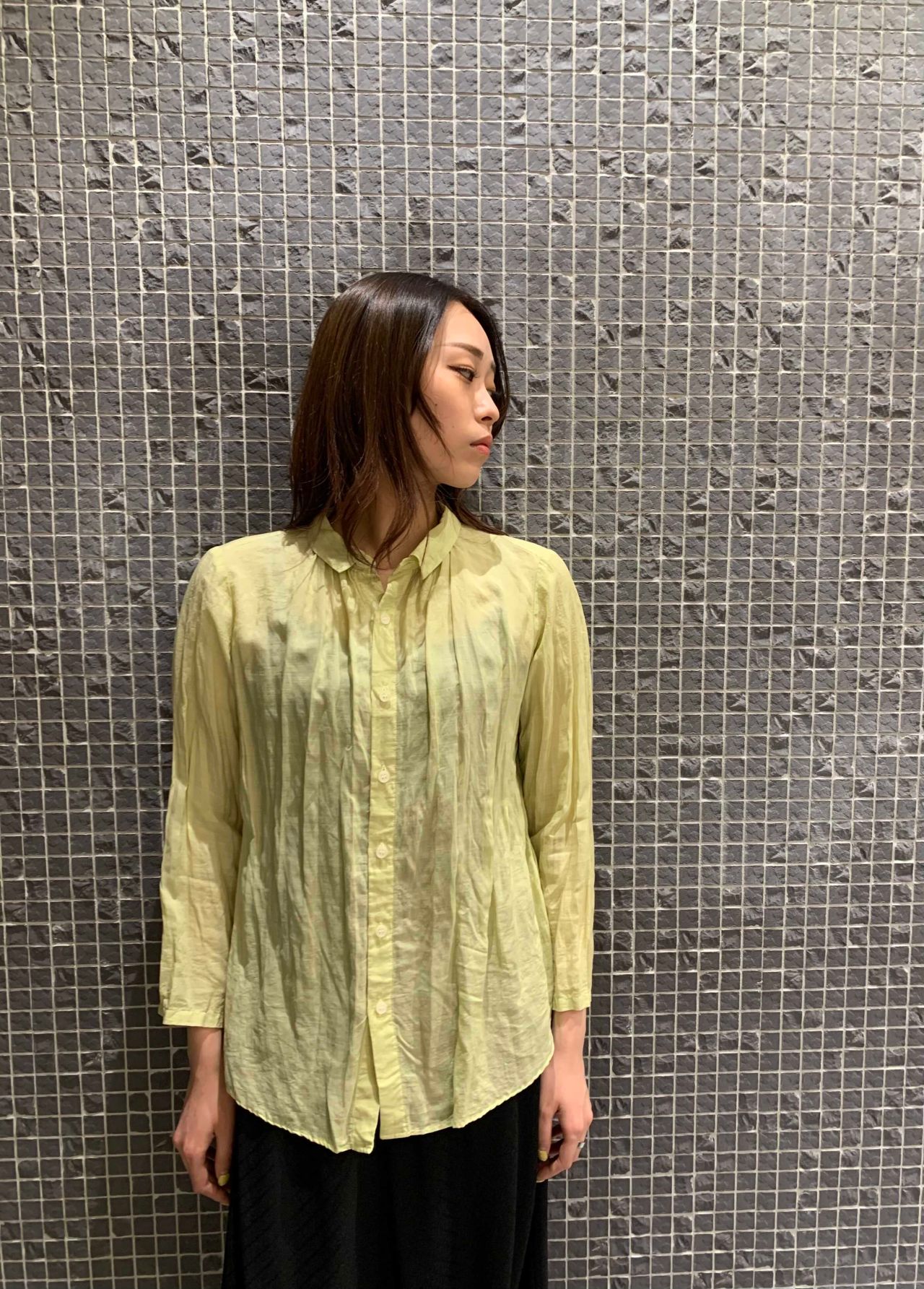 ブラウスは見た目よりも着るとスッキリと見えます。とても軽く着やすいので、春先から少し先の季節には重ね着のインとしても使用できますよ。