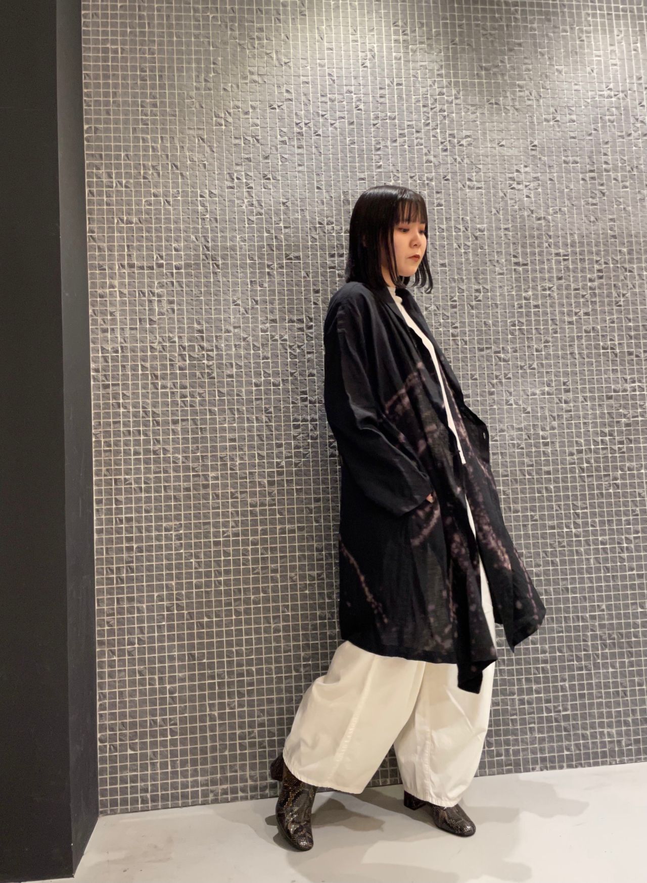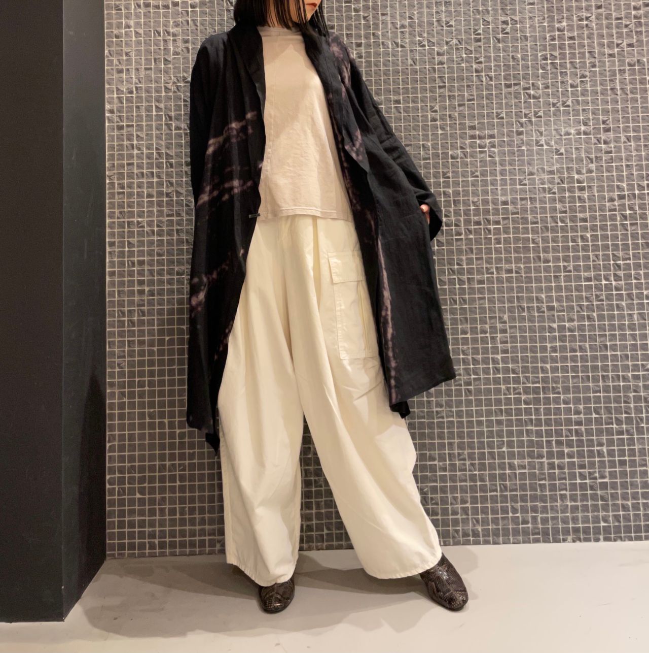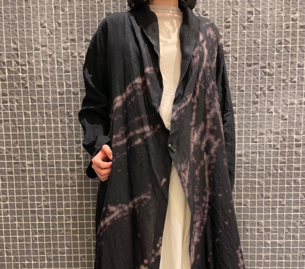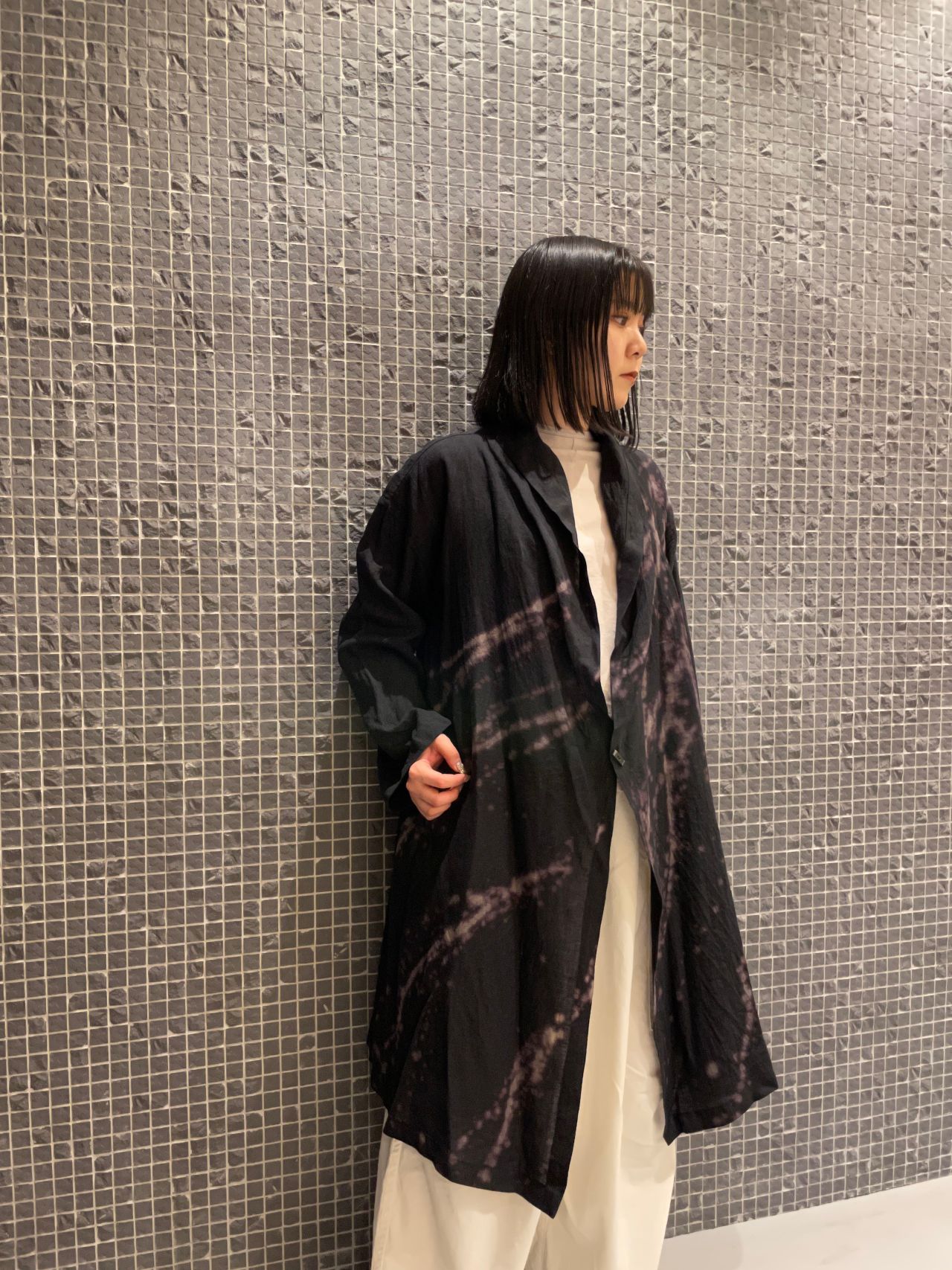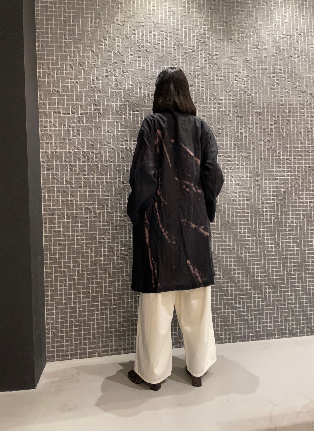 背面にかけて流れるようなタッチで刷毛抜染という色を抜く技法が施されておりバックスタイルもモダンに決まる一着。