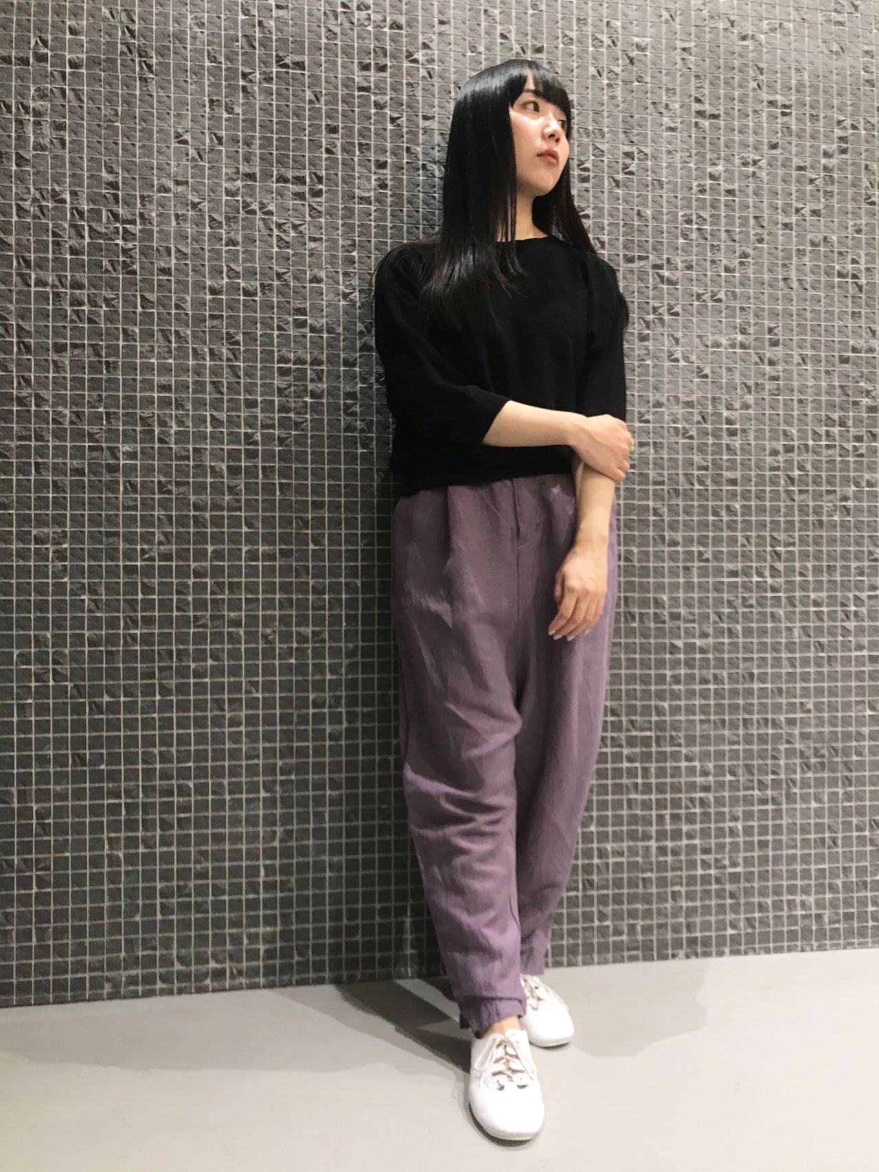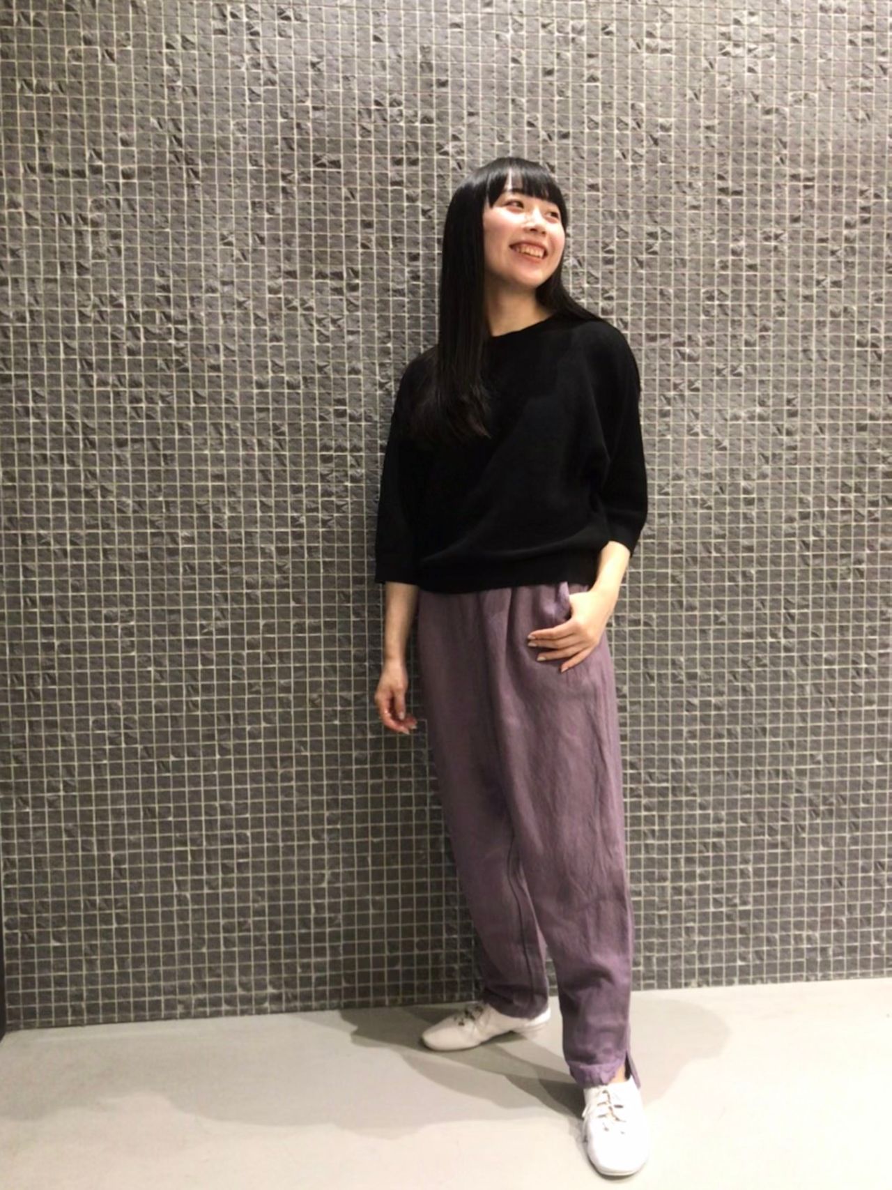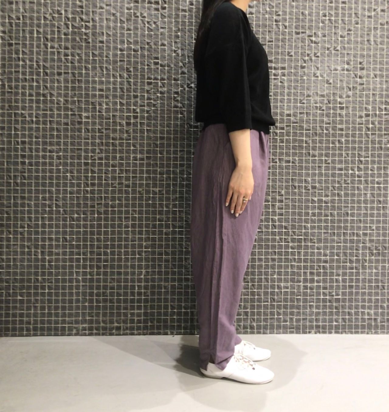 紫の染色が美しいパンツはゆったりしたデザインですが、背が小さい私でもスラッと脚を長く見せてくれましたよ。