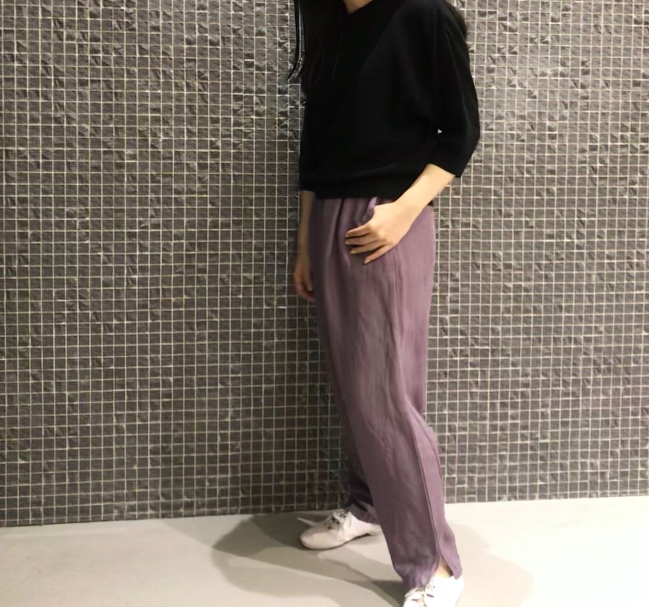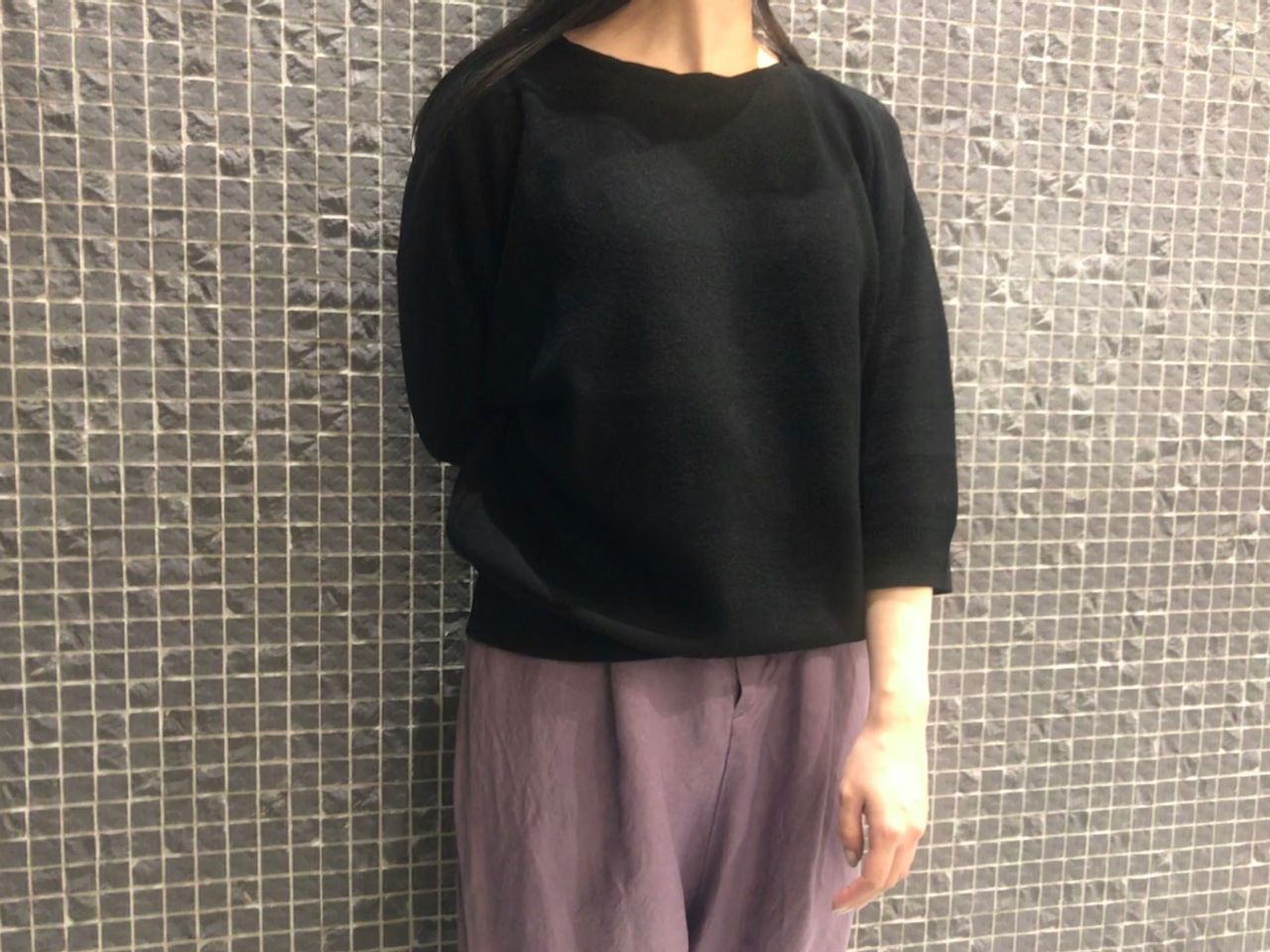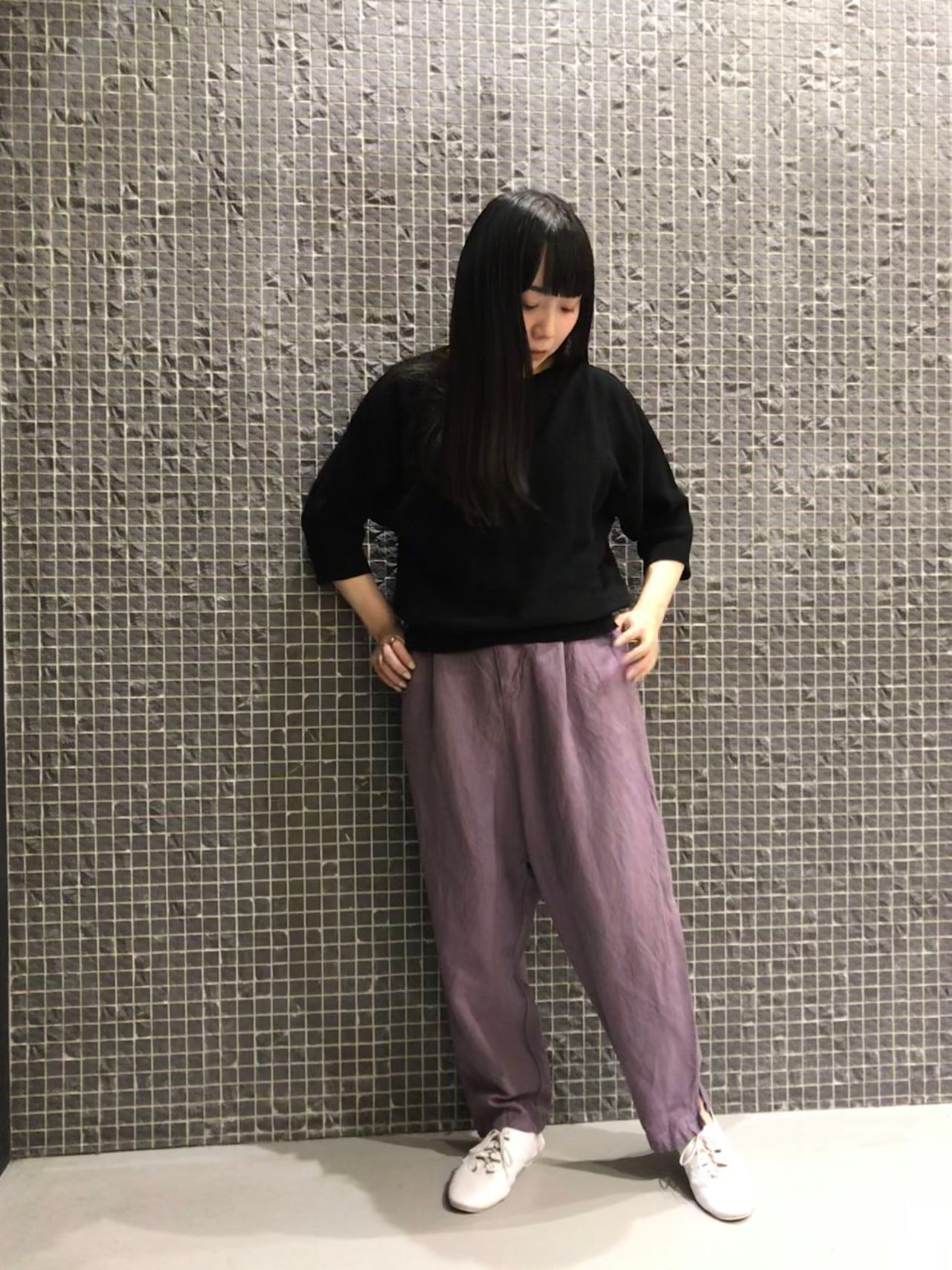 紫の染色が美しいパンツはゆったりしたデザインですが、背が小さい私でもスラッと脚を長く見せてくれましたよ。
