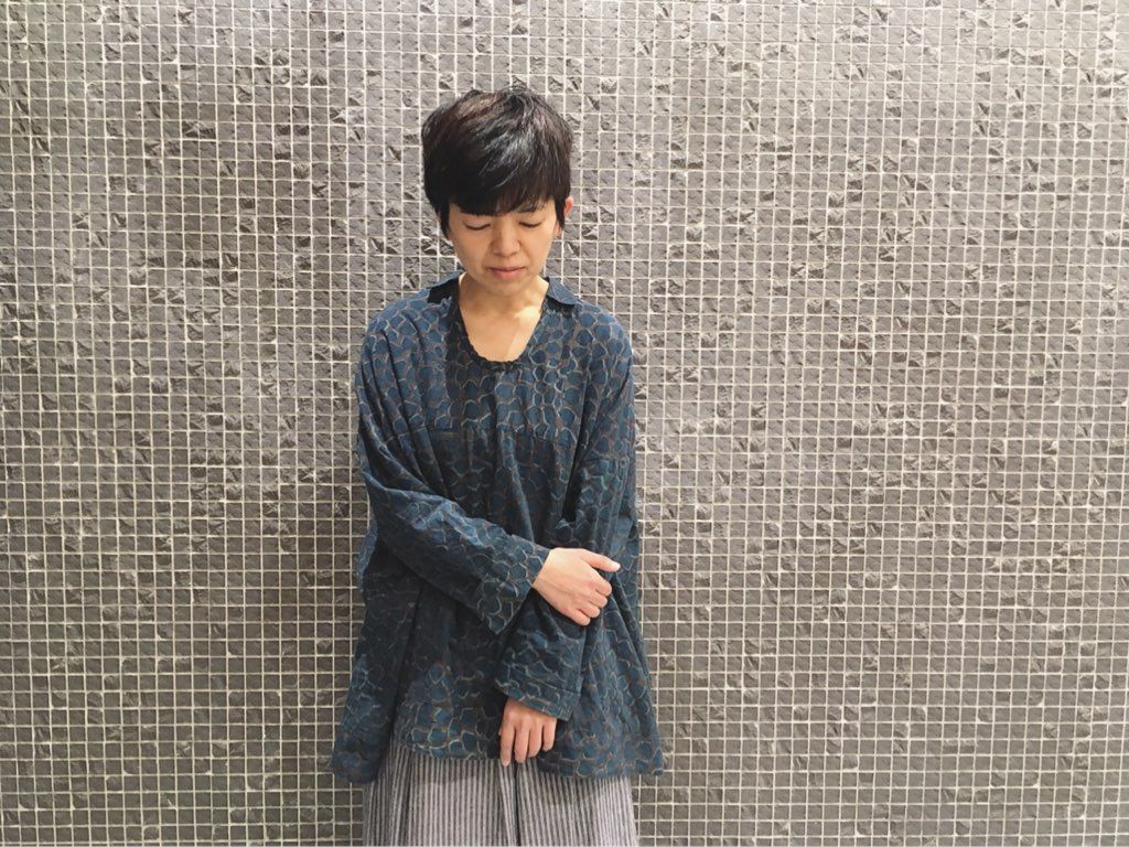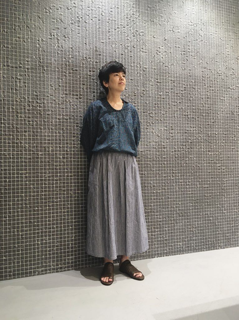 襟ぐりが開いていないブロックプリントのブラウスは透け感もあまりないので