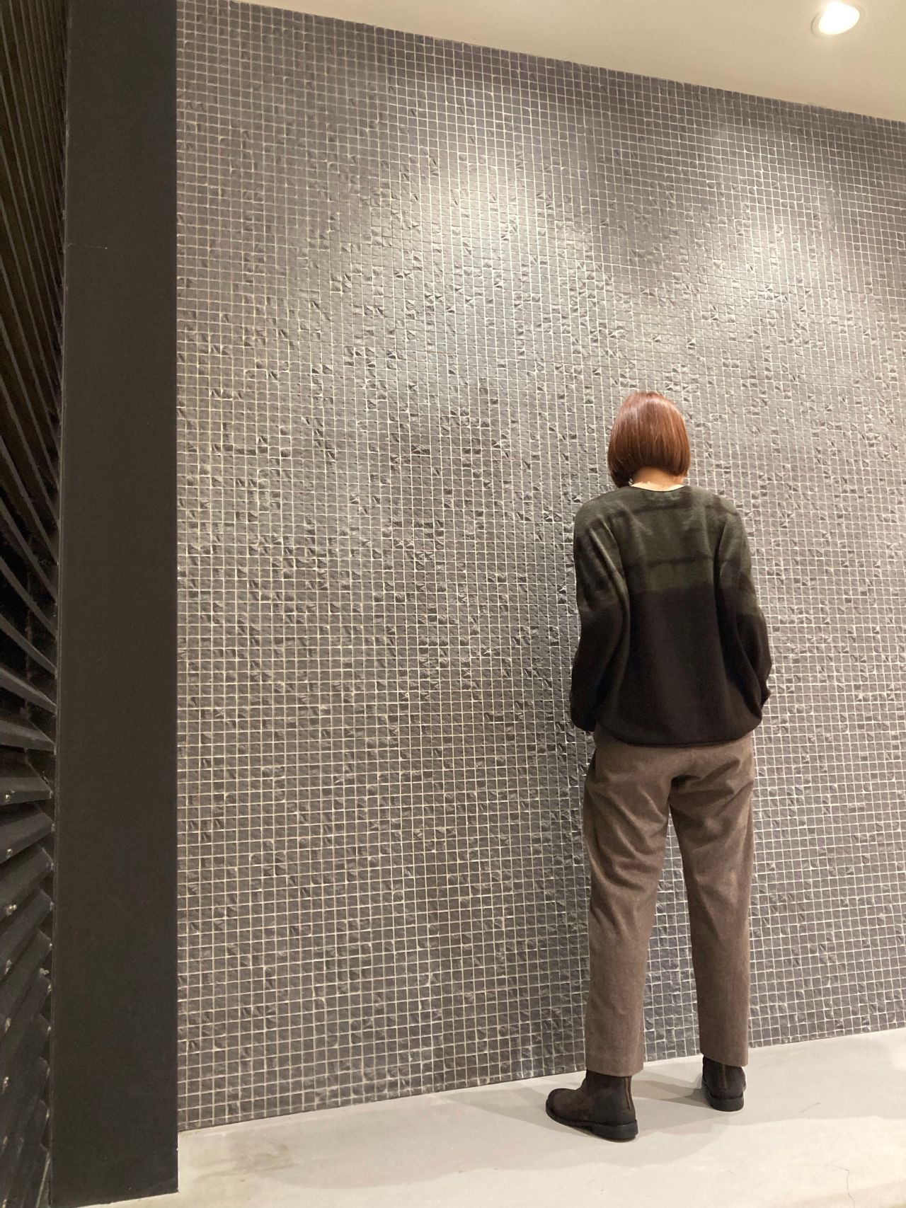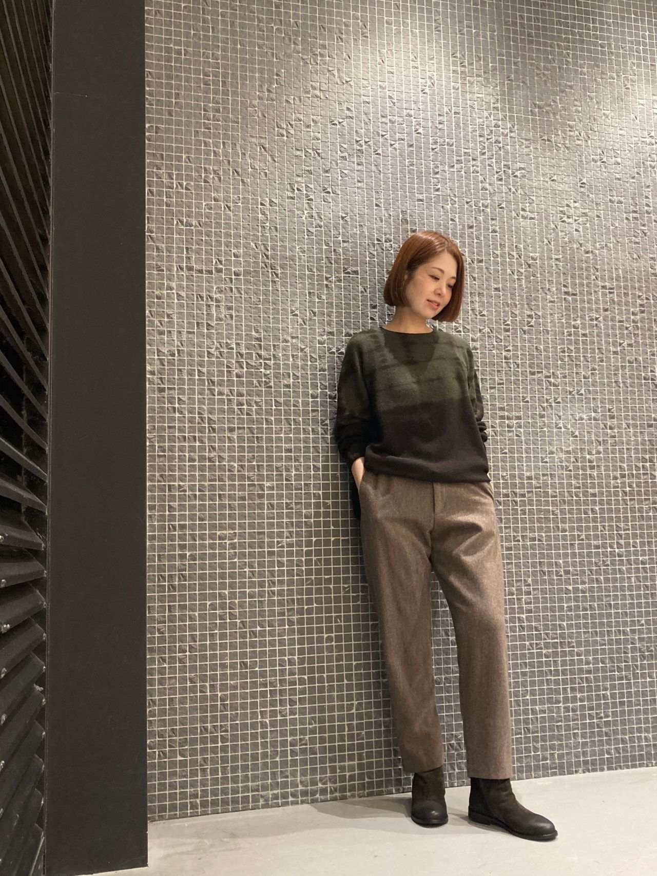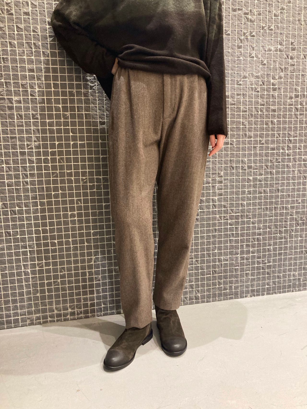 カシミヤ100%の薄手のセーターに細身のウールパンツを合わせたシンプルなスタイリング