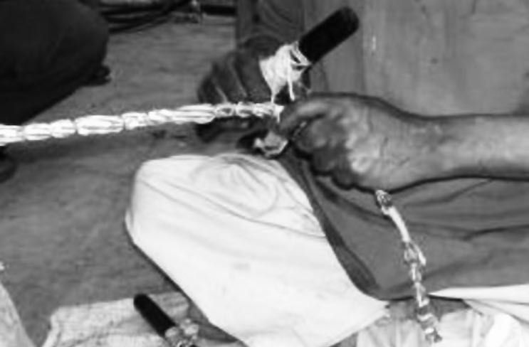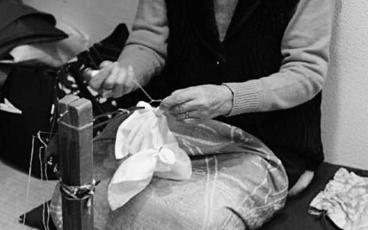 糸は一本取りにして、下絵通り模様の輪郭を平縫いする。それを引き締め、絞り台を使って糸をかけ、木製のコロで巻き上げていく。平縫した部分は染まらないようにする為、模様が出来上がる。