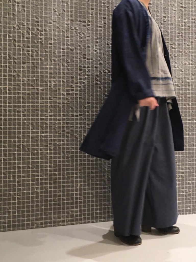 爽やかなブルーのワイドパンツに少し長めのオーバーコートを合わせると