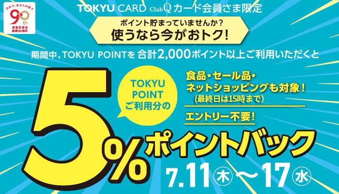 上記期間中、対象店舗にて東急カードポイントを合計2,000ポイント以上ご利用いただくと、ご利用ポイントの5%を後日ポイントバックいたします